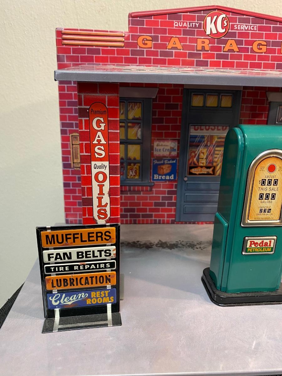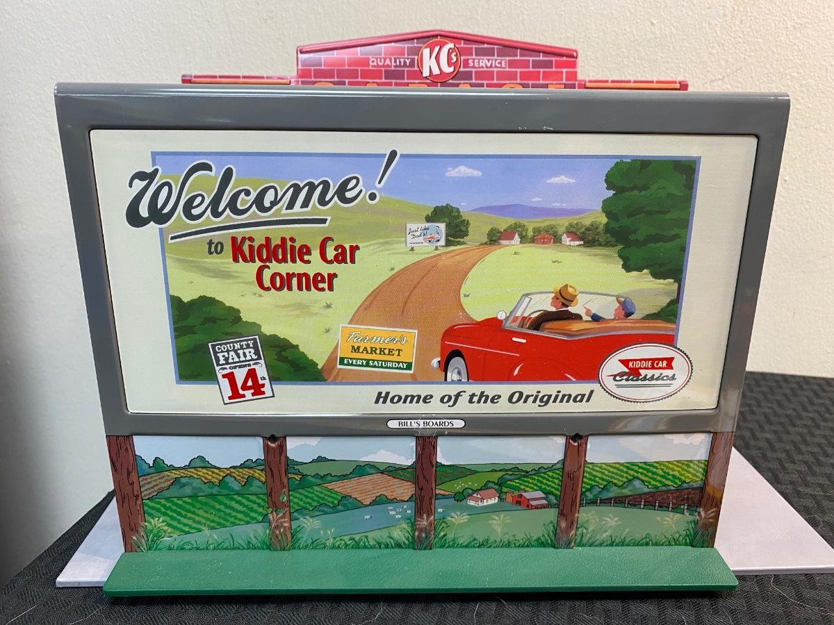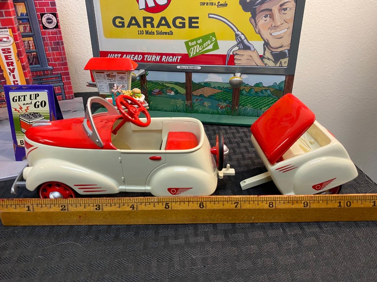 Hallmark Kiddie Car Classics miniature set. Includes 1940 Custom Pioneer with Trailer, Kiddie Car garage with car lift, gas pump, signs, order board with food, and billboard sign. Metal and plastic parts, car is metal. See photos. Great for display.
