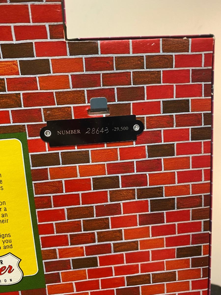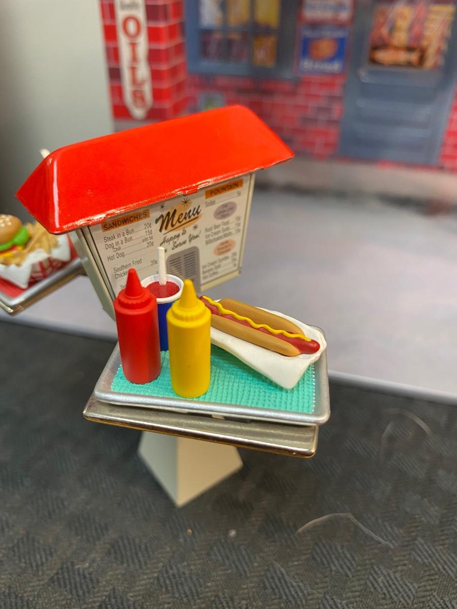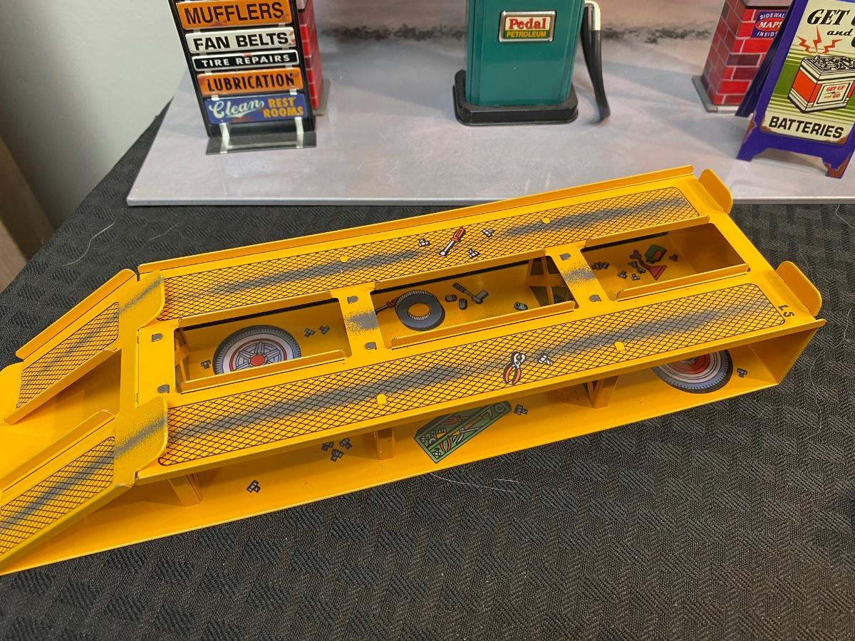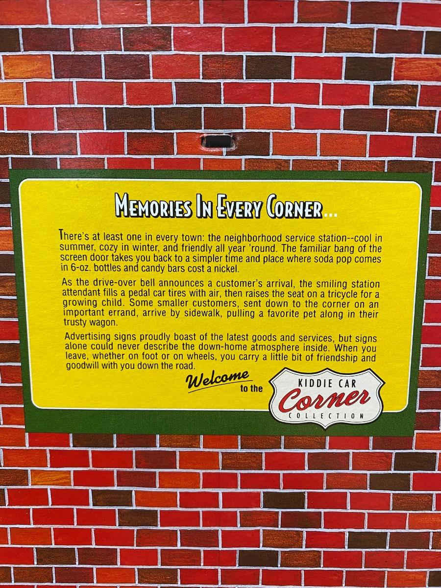 Hallmark Kiddie Car Classics miniature set. Includes 1940 Custom Pioneer with Trailer, Kiddie Car garage with car lift, gas pump, signs, order board with food, and billboard sign. Metal and plastic parts, car is metal. See photos. Great for display.