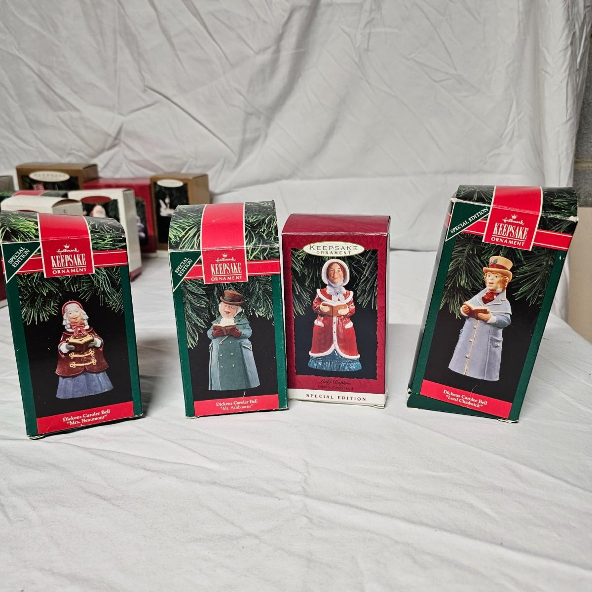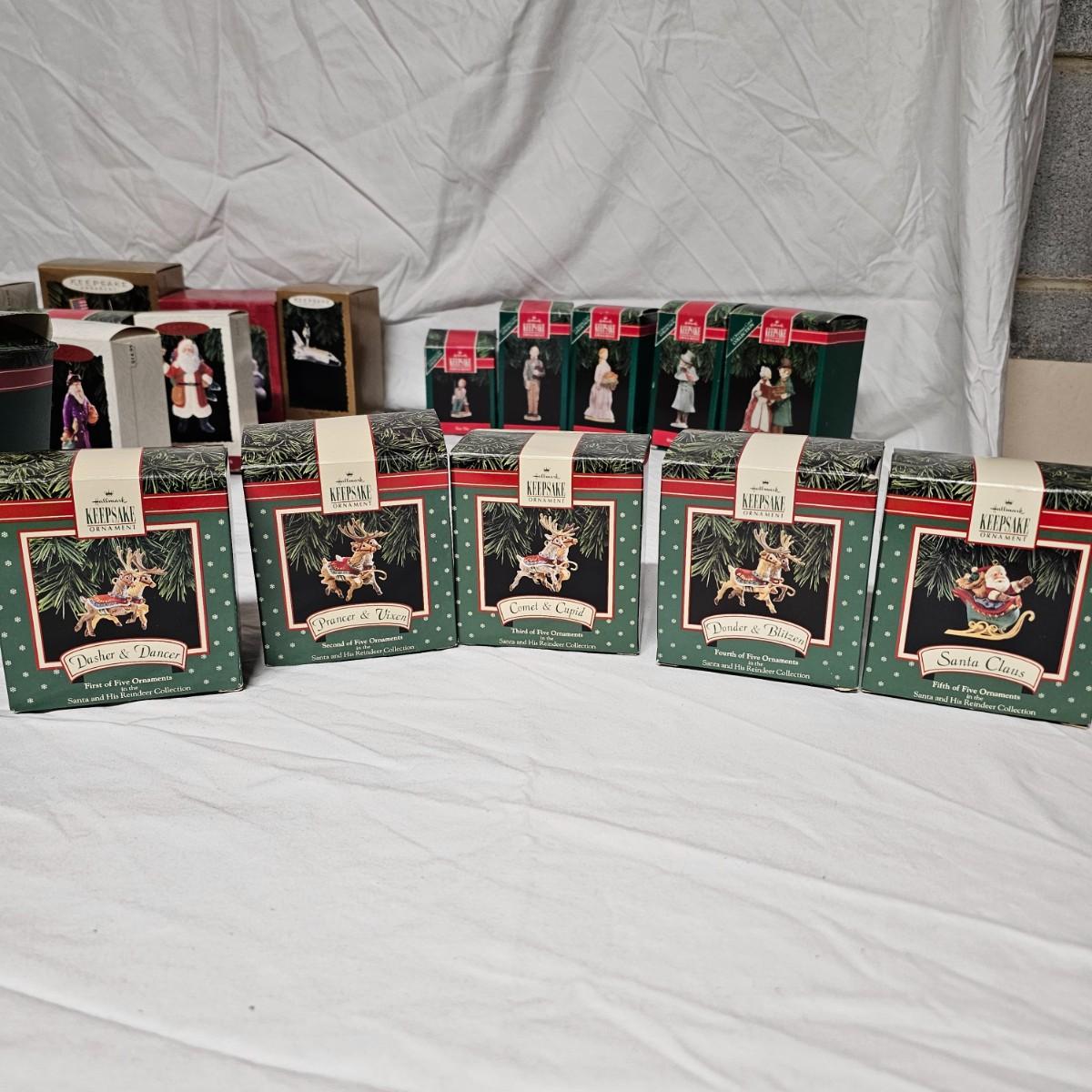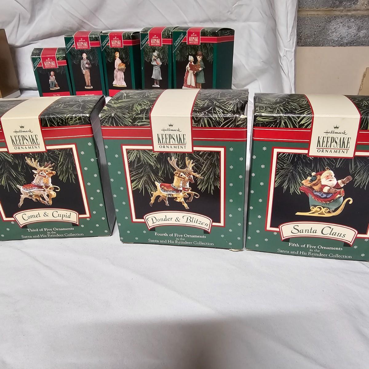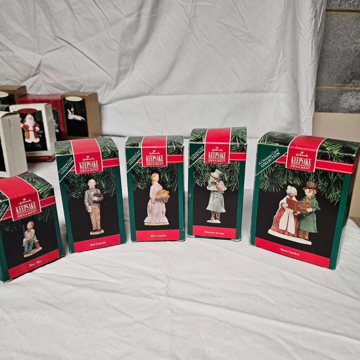 Large assortment of Hallmark ornaments in original boxes. Covering several decades of collecting, this group includes some but not all of the Dickens Caroler Bells, the 12 Days of Christmas, Santa & His Reindeer (all 5), A Christmas Carol (all 5) and some of the Merry Olde Santa series. Also many singles in lots of other series. About 100 pieces total, boxes show some wear, some more than others. See photos for details. Local pickup only.