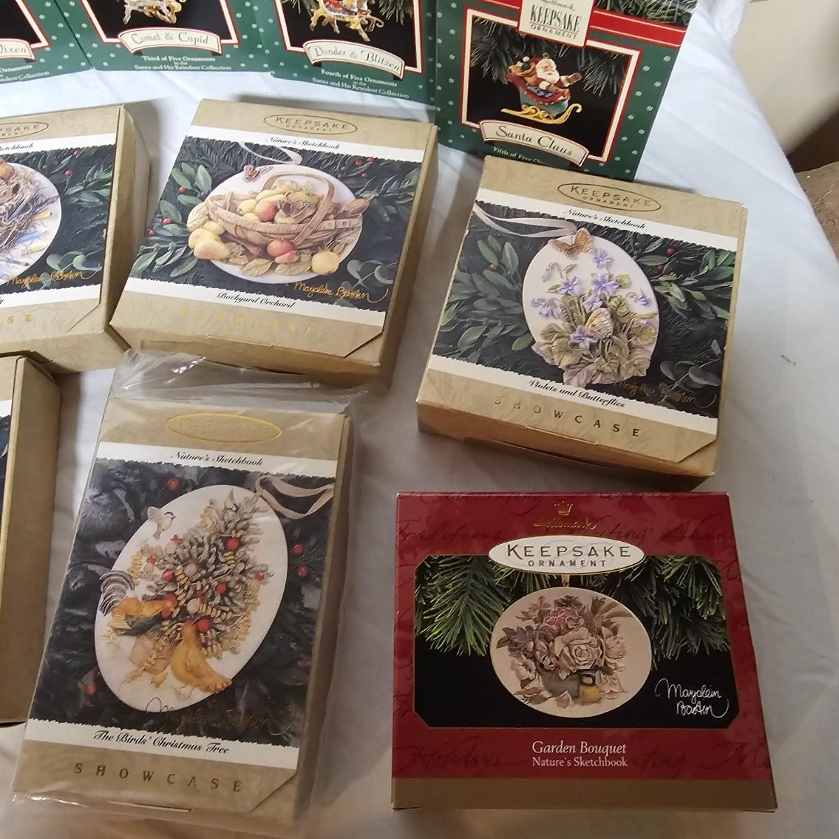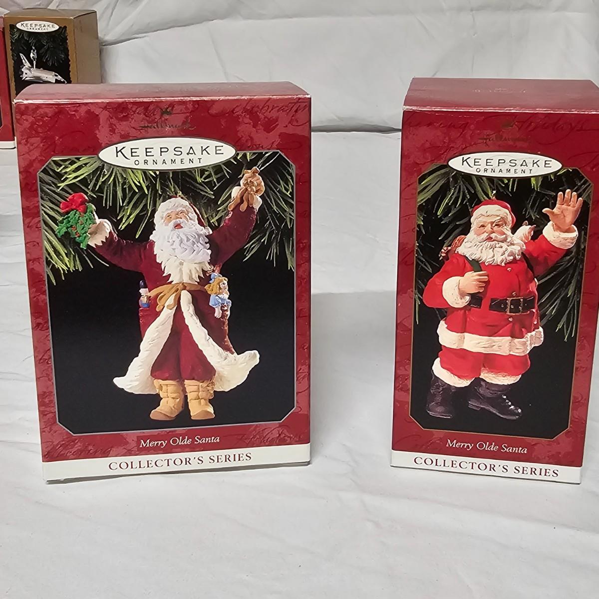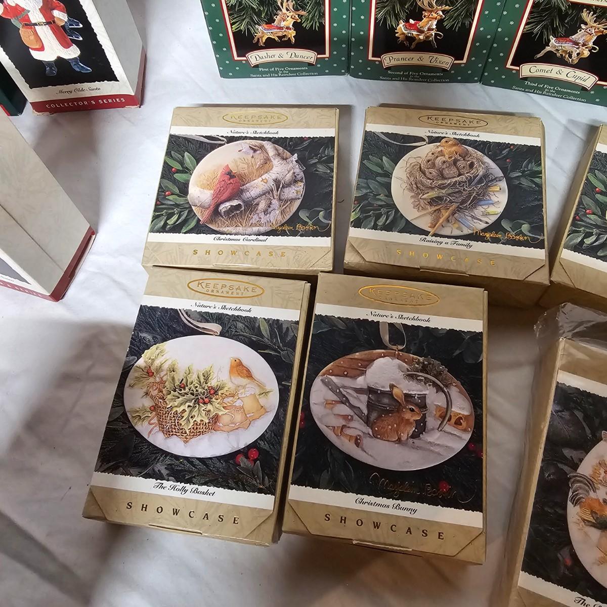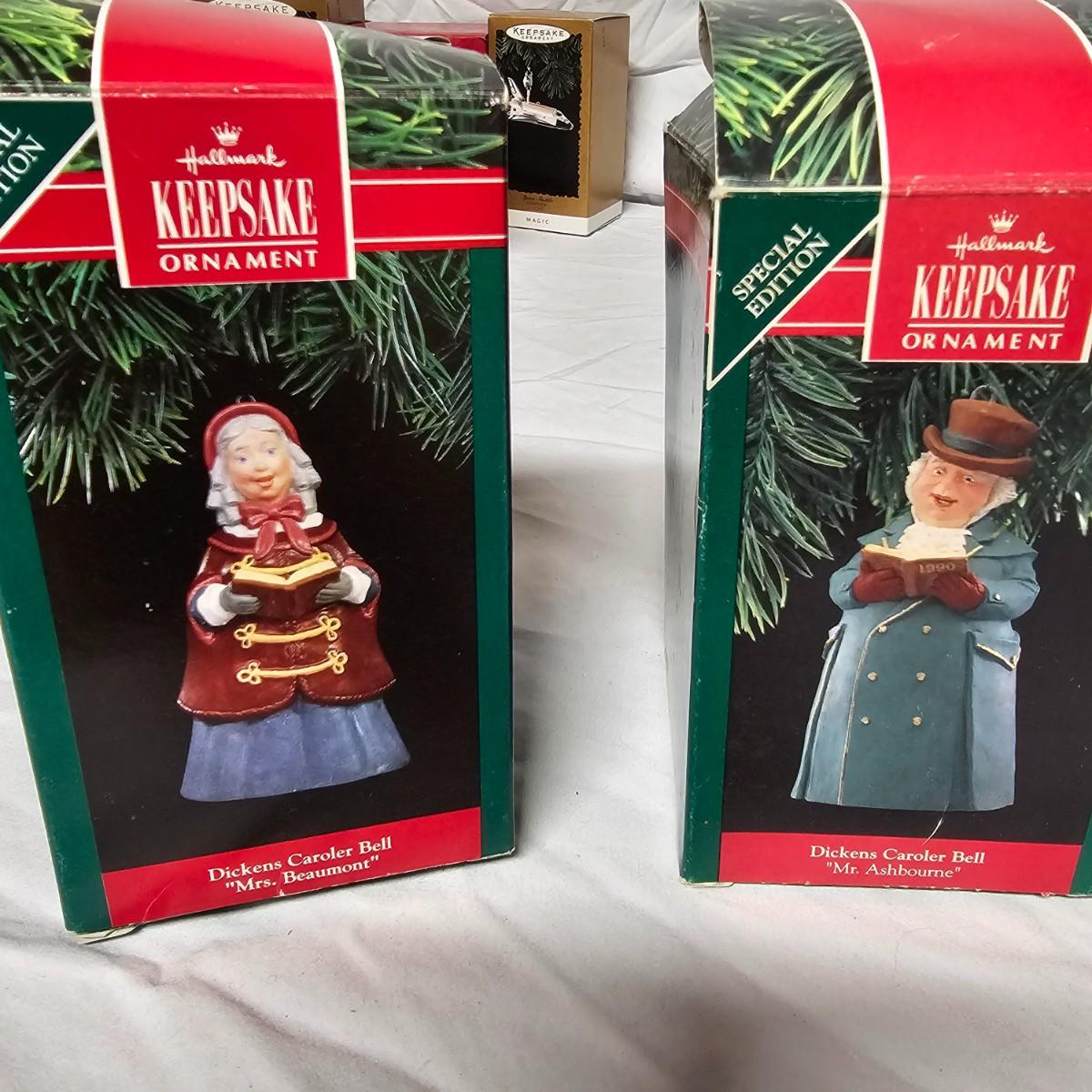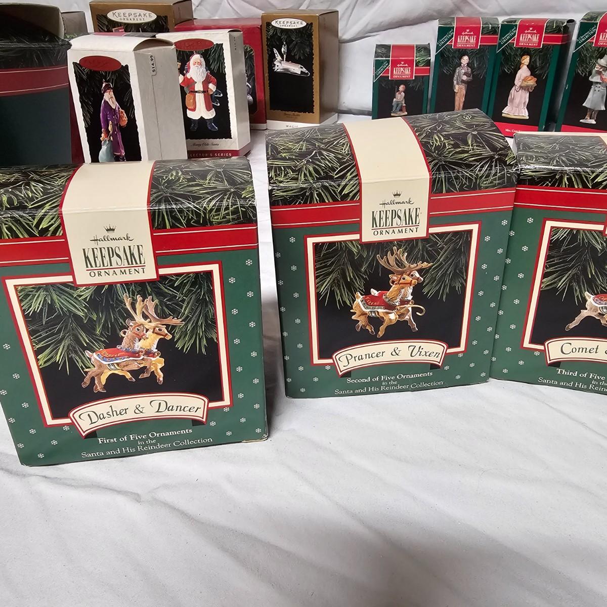 Large assortment of Hallmark ornaments in original boxes. Covering several decades of collecting, this group includes some but not all of the Dickens Caroler Bells, the 12 Days of Christmas, Santa & His Reindeer (all 5), A Christmas Carol (all 5) and some of the Merry Olde Santa series. Also many singles in lots of other series. About 100 pieces total, boxes show some wear, some more than others. See photos for details. Local pickup only.