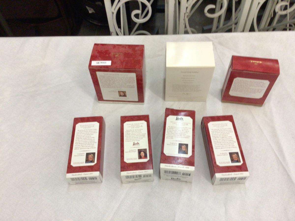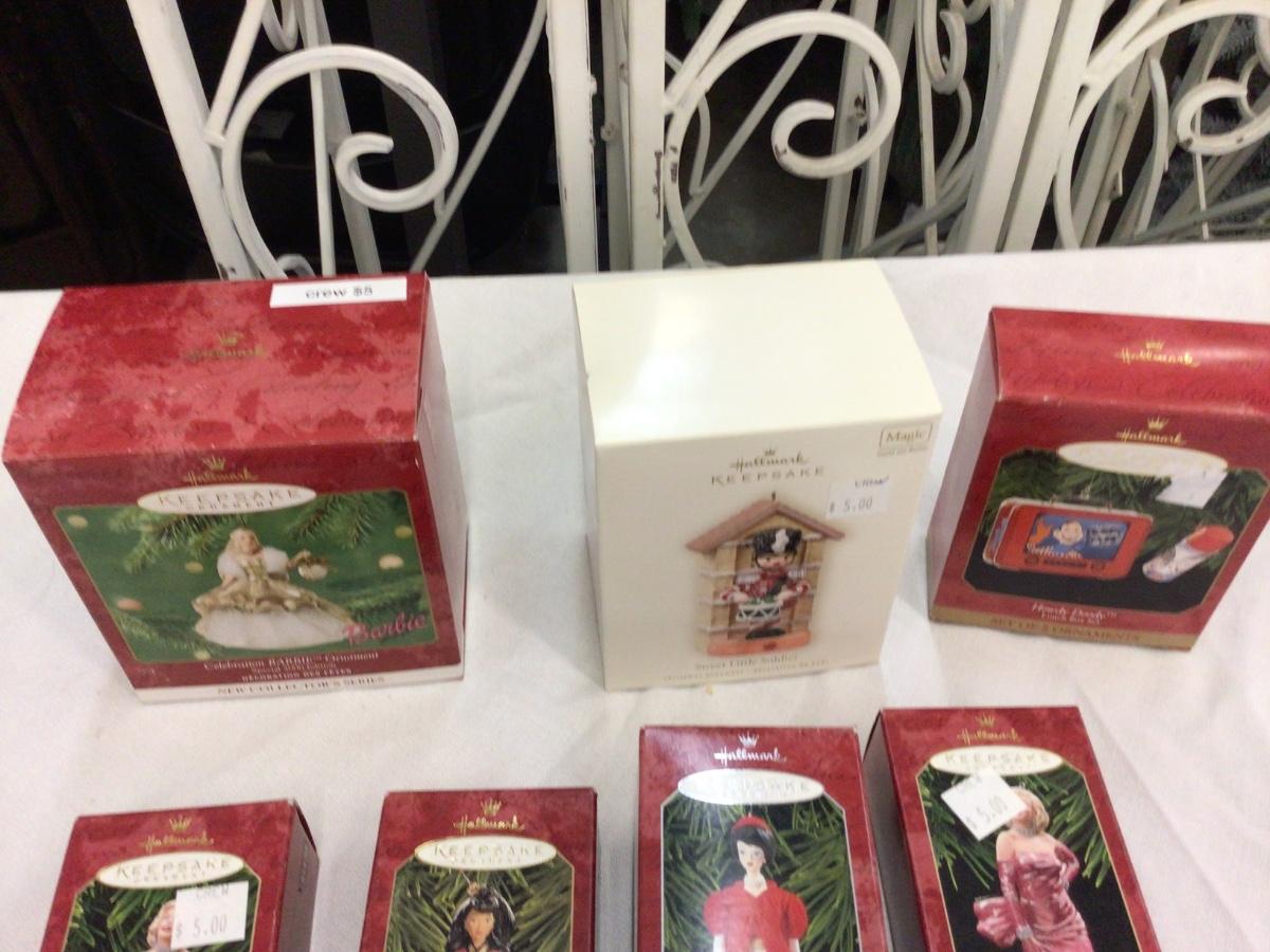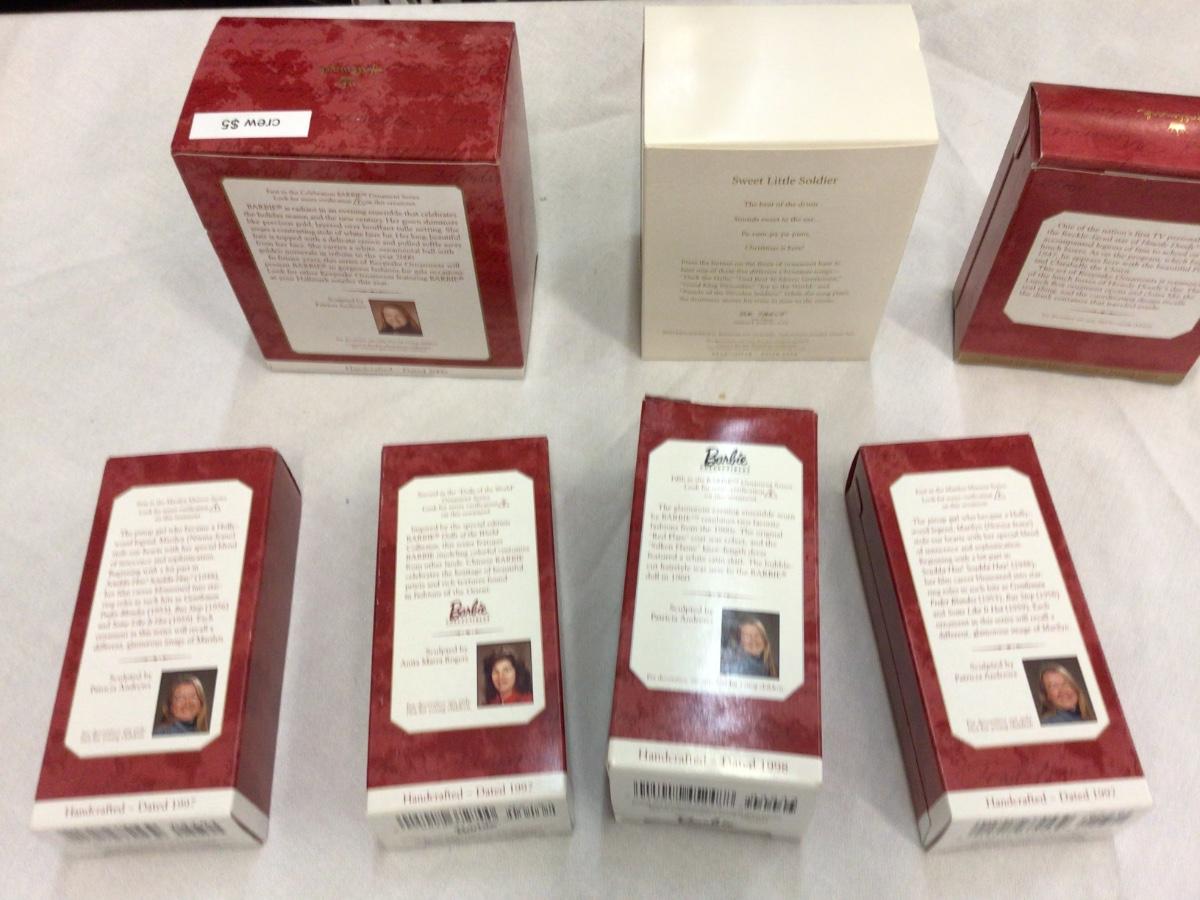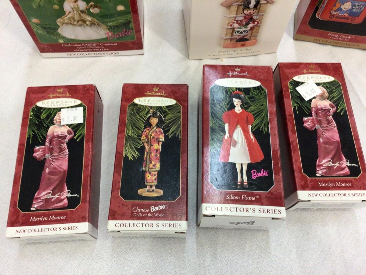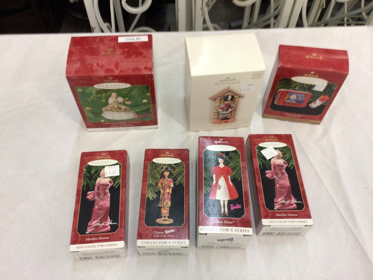 There are 7 Hallmark ornaments. You get Barbie, Nutcracker, Howdie Doodie, two Marilyn, Another Barbie.
