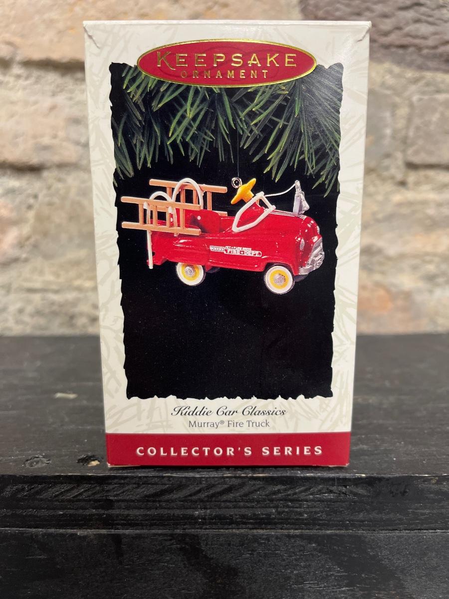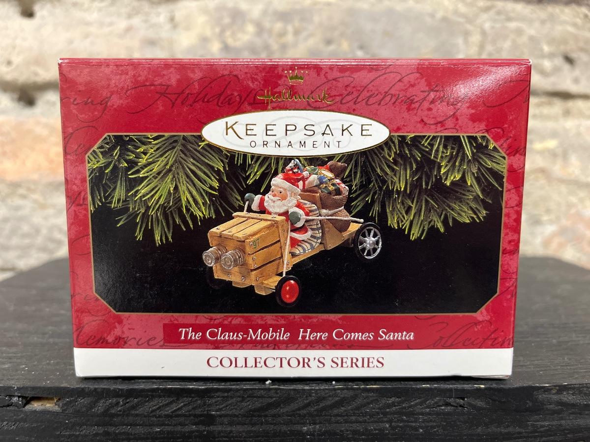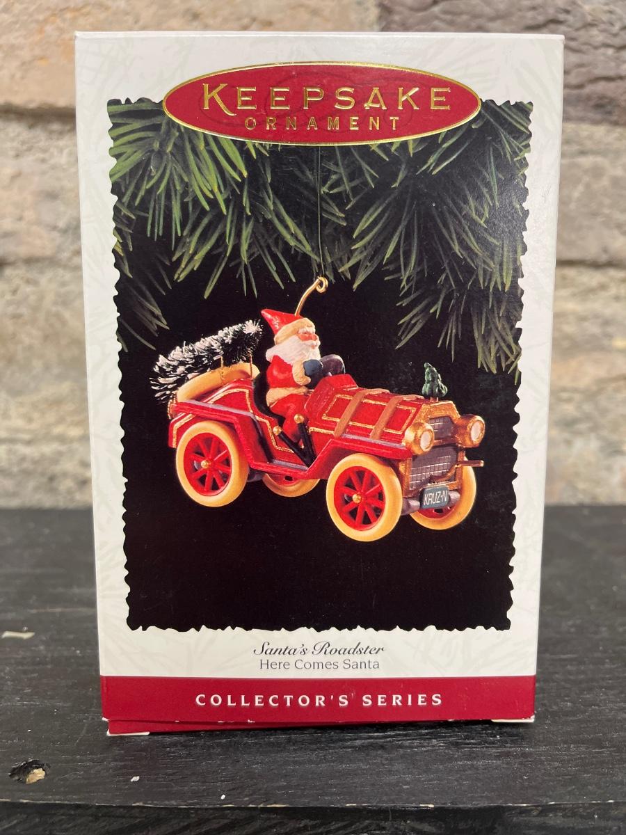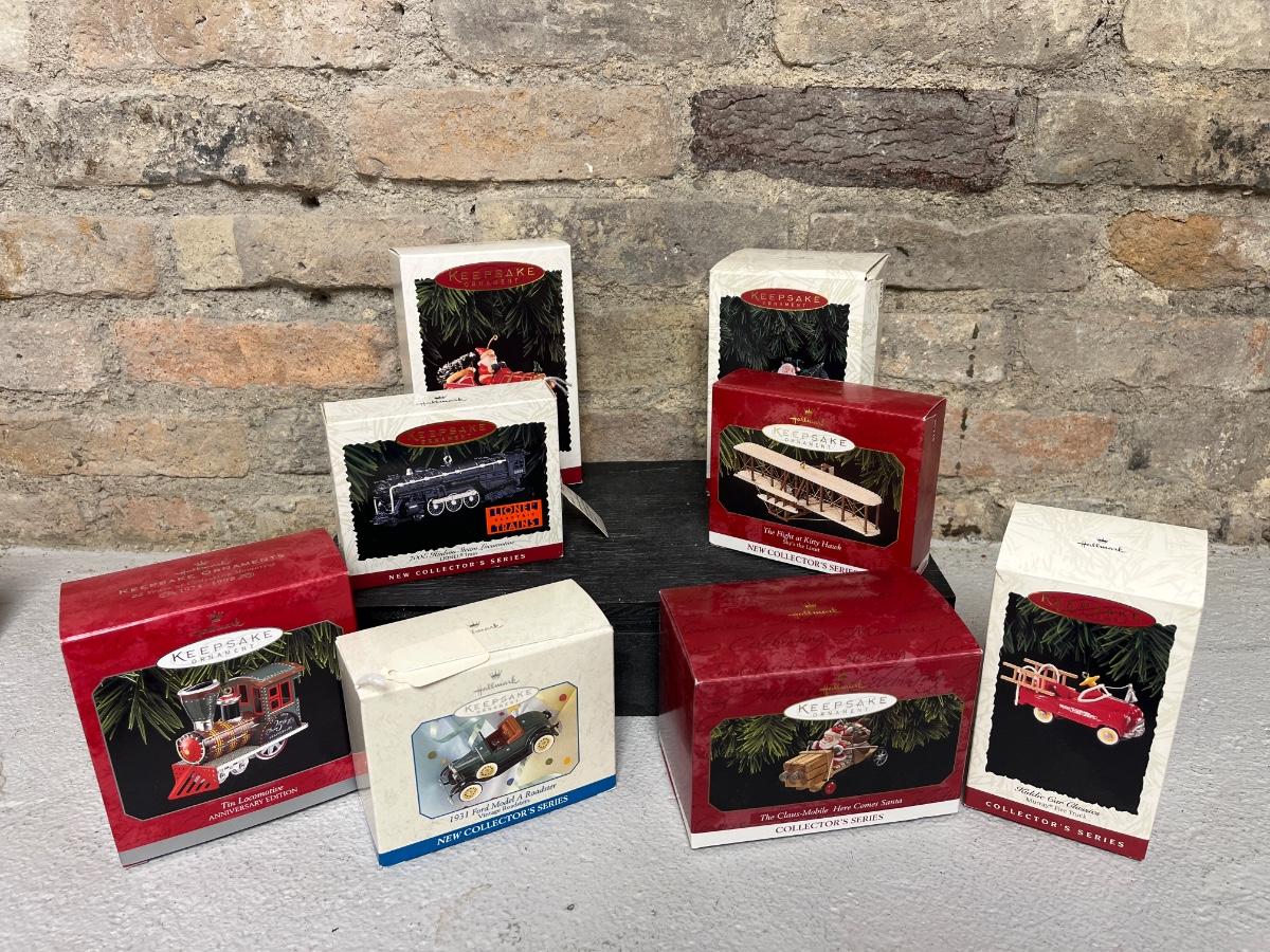 Santa’s Roadster, Santa’s 4x4, Here Comes Santa, Tin Locomotive, The Flight at Kitty Hawk, Lionel Hudson Steam Locomotive, Ford Model A Roadster and Murray Fire Truck