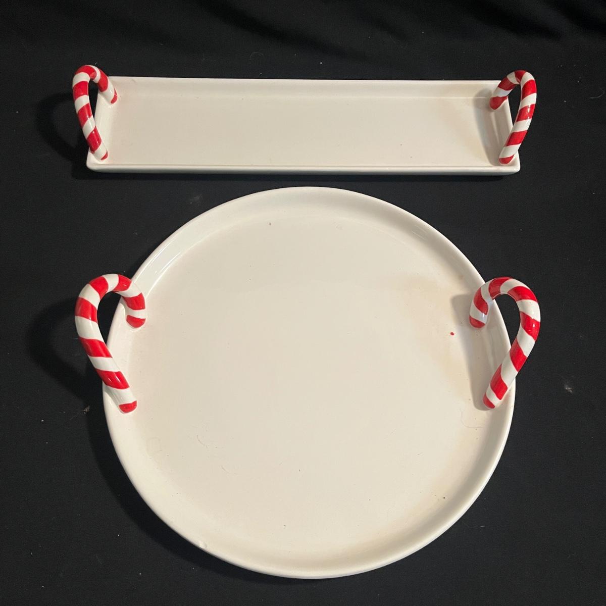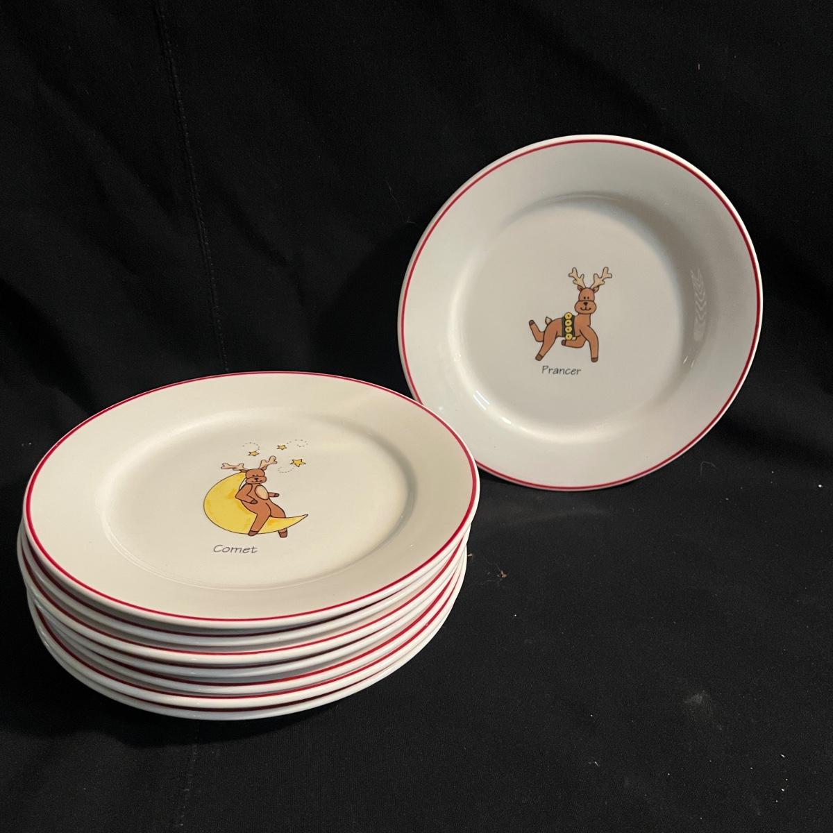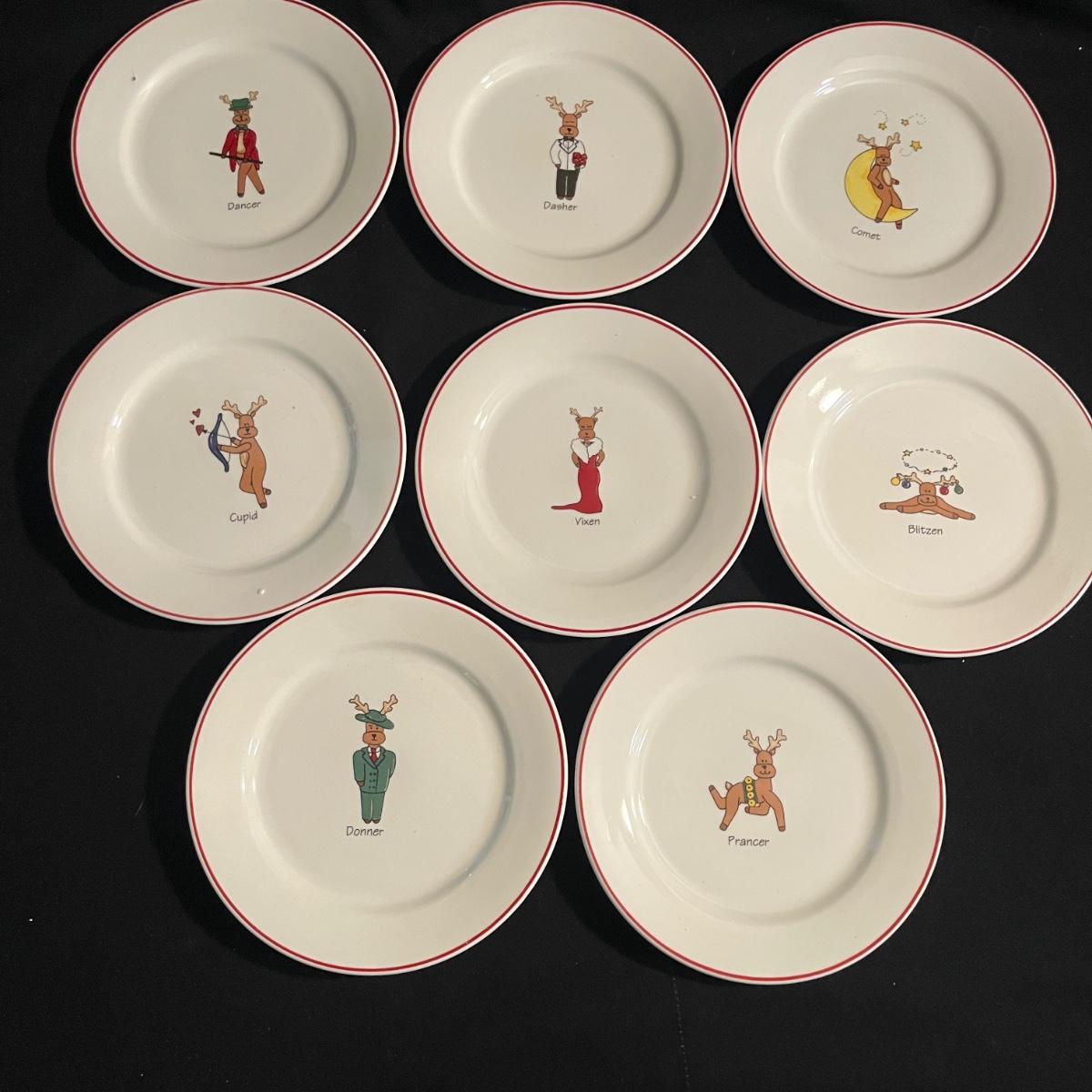 Lot includes two Hallmark ceramic dishes, eight ceramic reindeer plates, Pottery Barn ceramic serving trays and two ceramic soup bowls with lids. Largest serving tray measures 13”D x 2.5”H with handles.