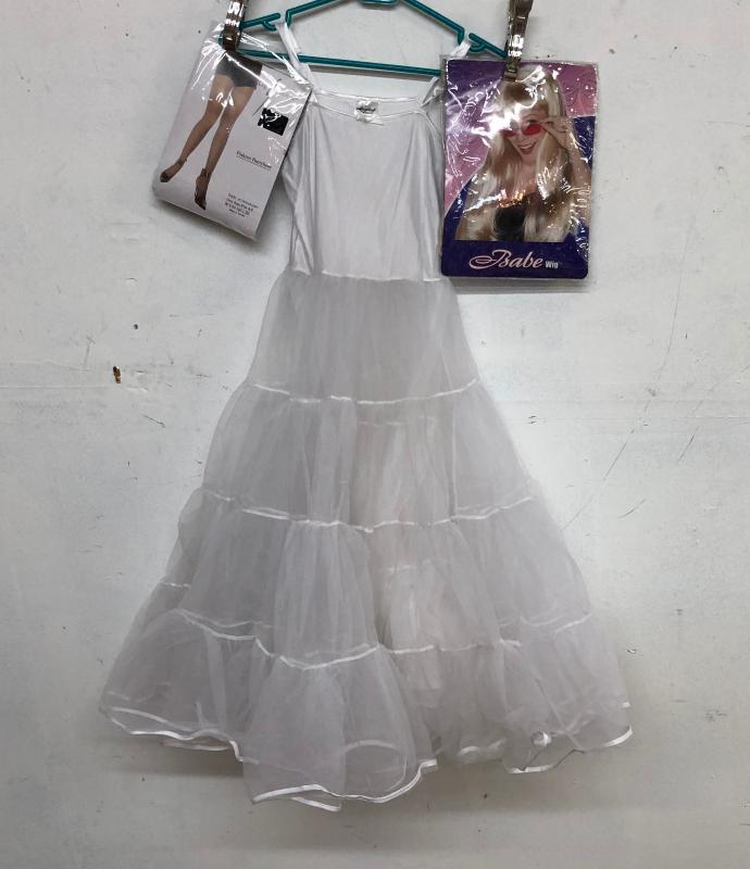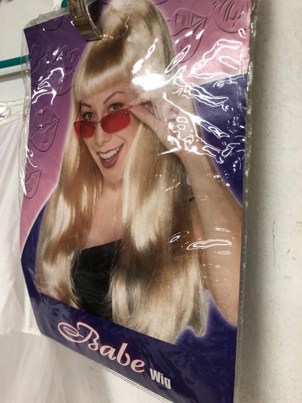Adult medium size Halloween Babe costume with slip and fishnet stockings...and platinum wig...