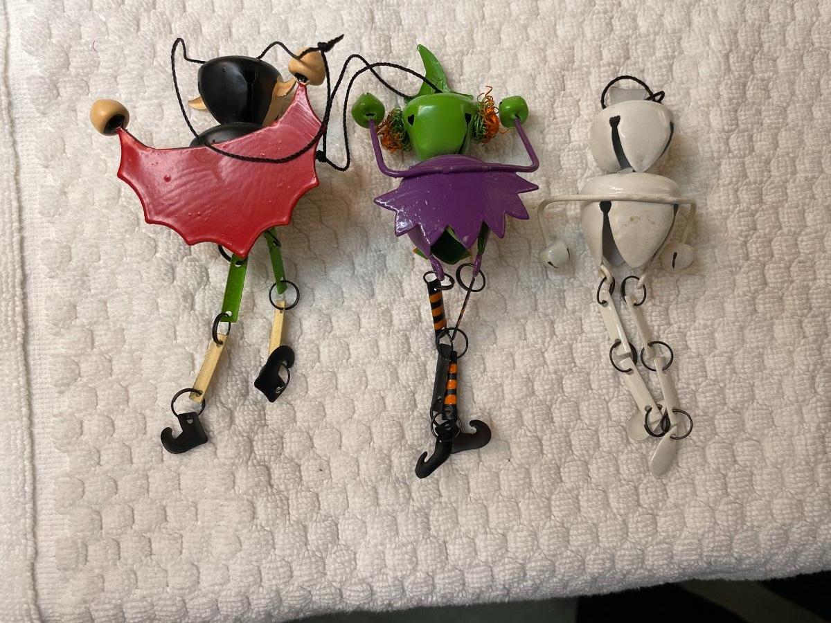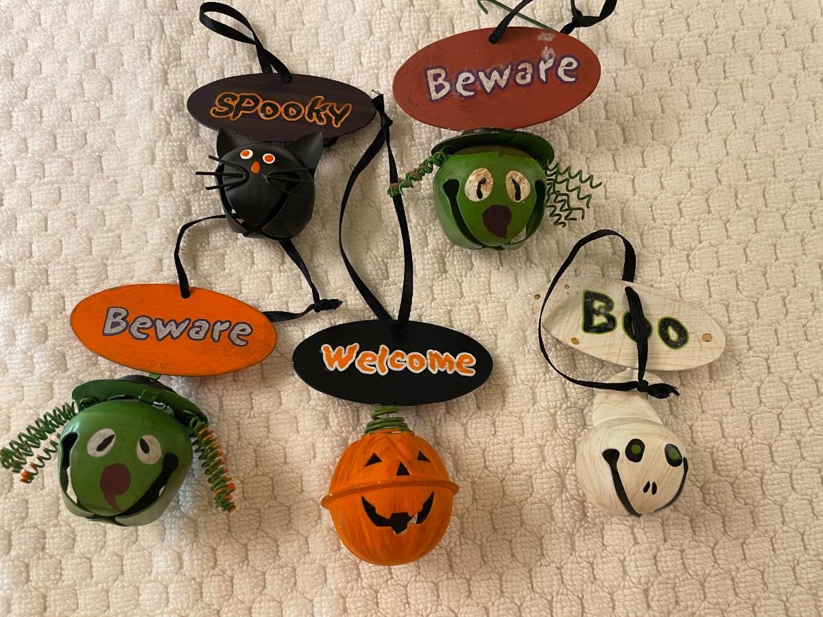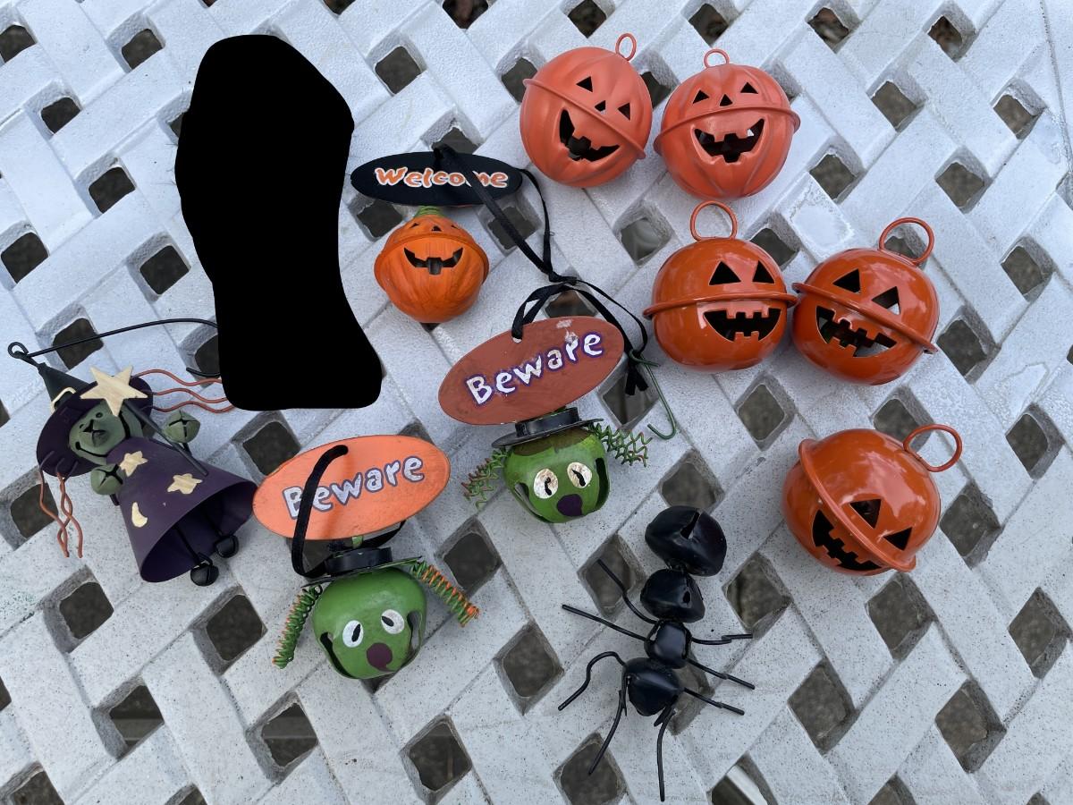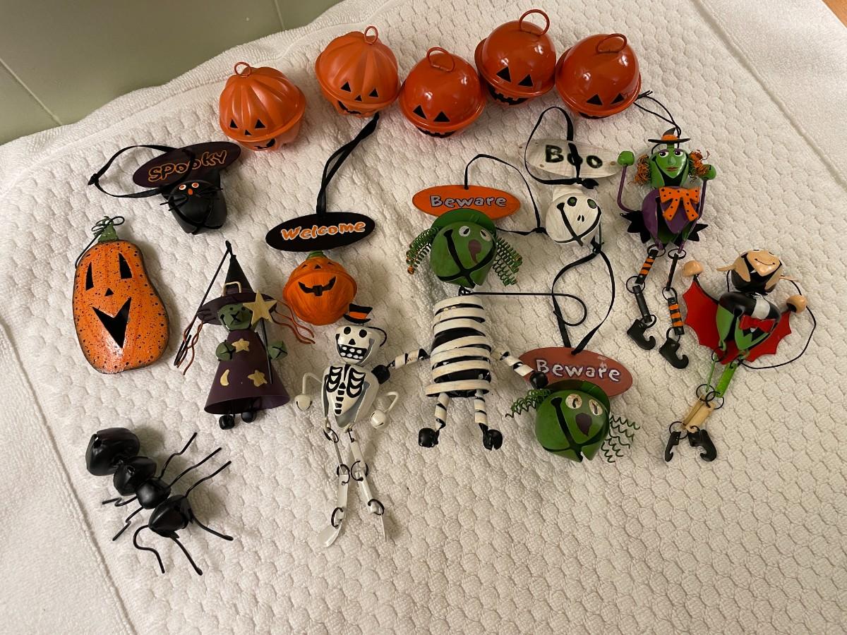 Whimsical set of 17 bell ornaments. Various characters and sizes, made from painted metal, faux antiqued. Approximately 2-4" high.