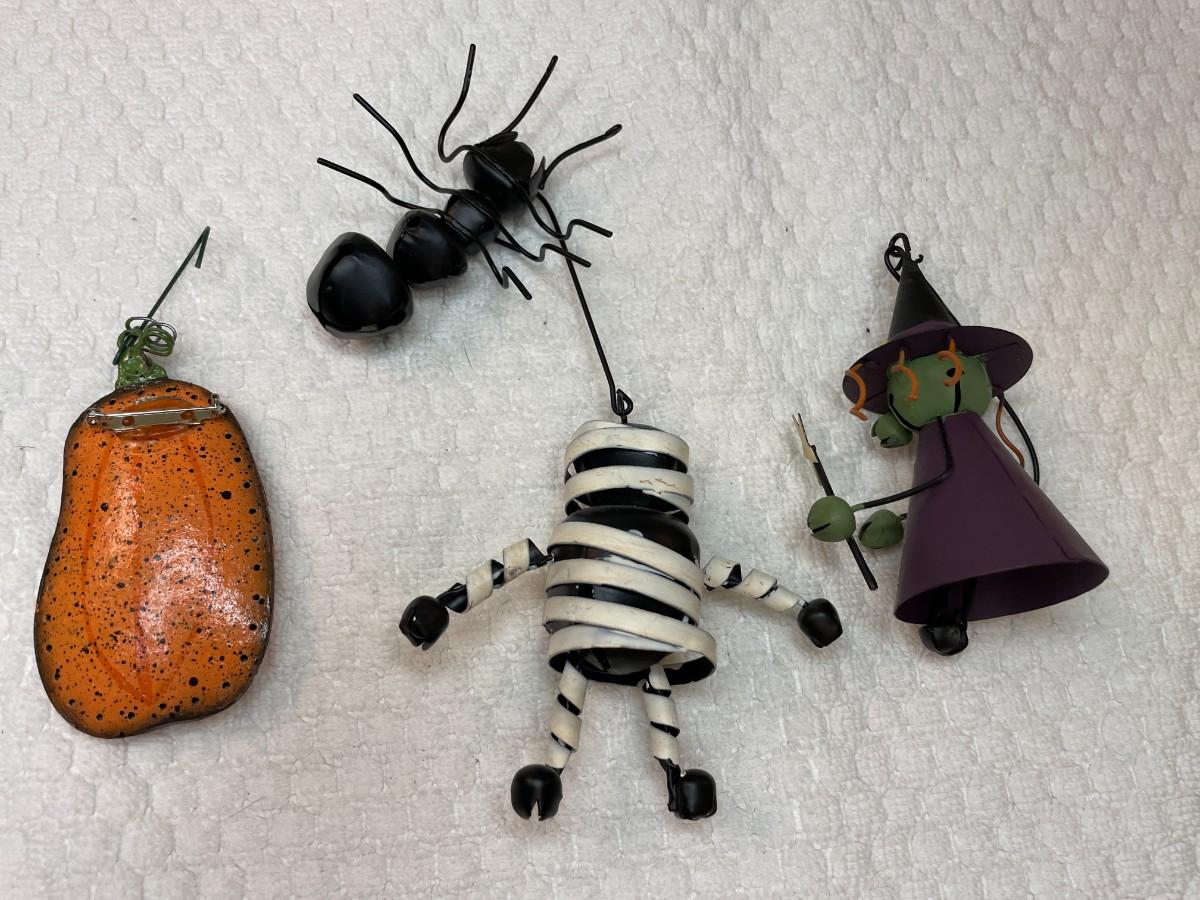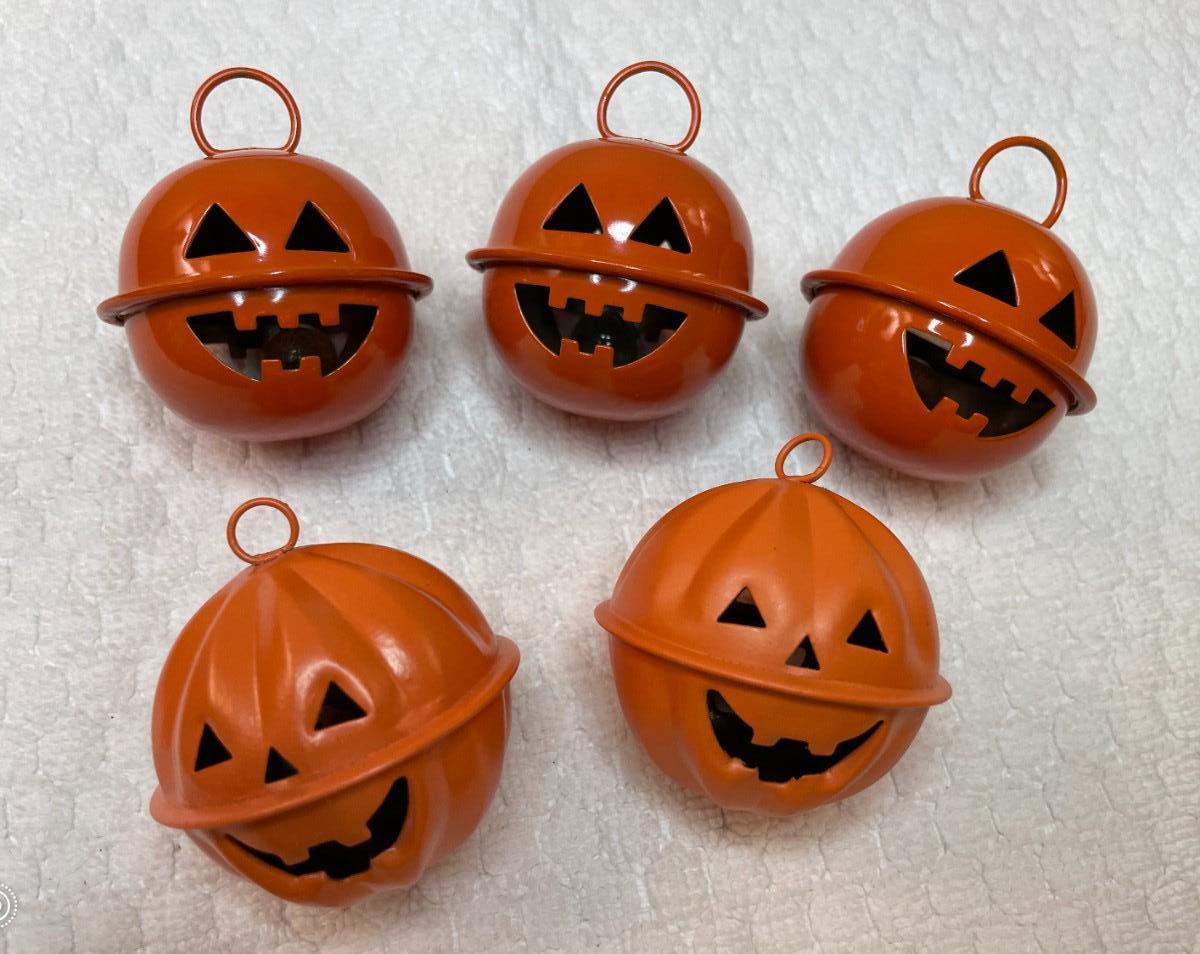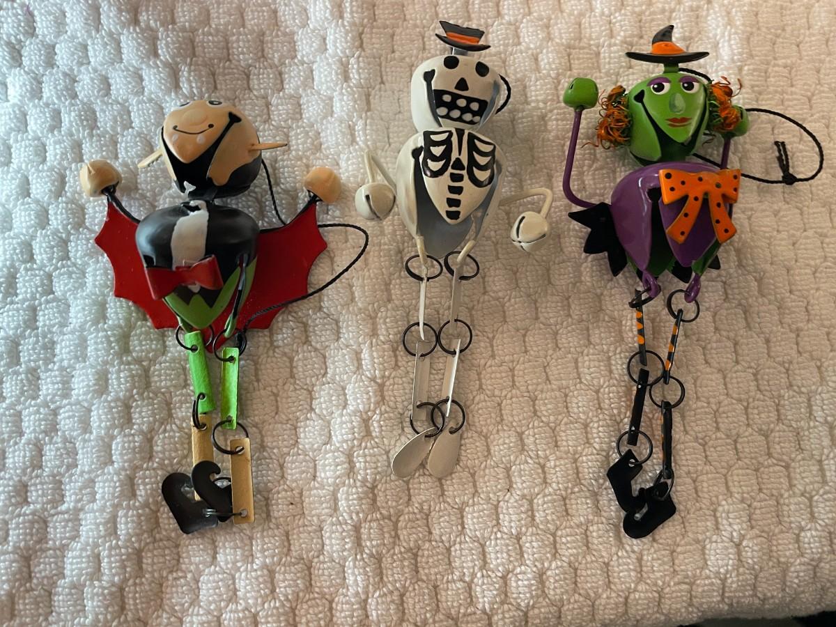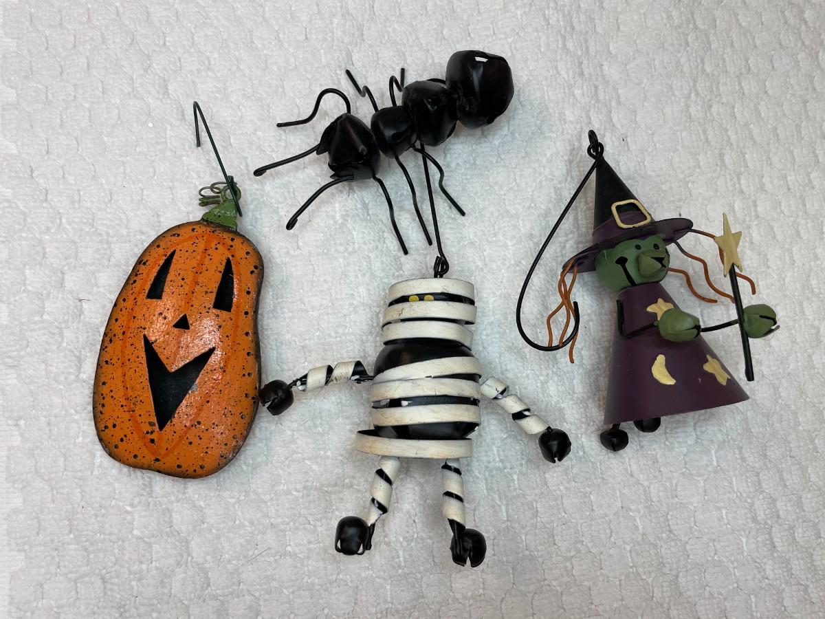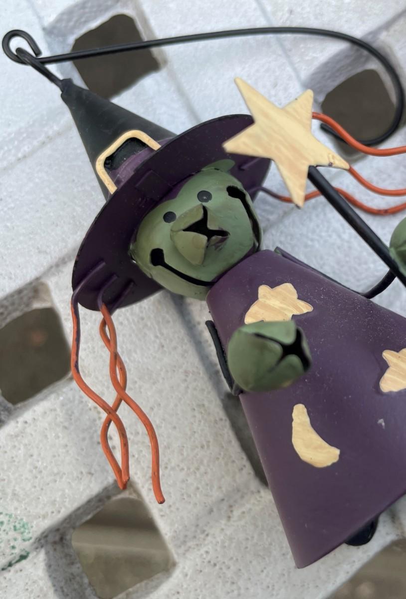 Whimsical set of 17 bell ornaments. Various characters and sizes, made from painted metal, faux antiqued. Approximately 2-4" high.