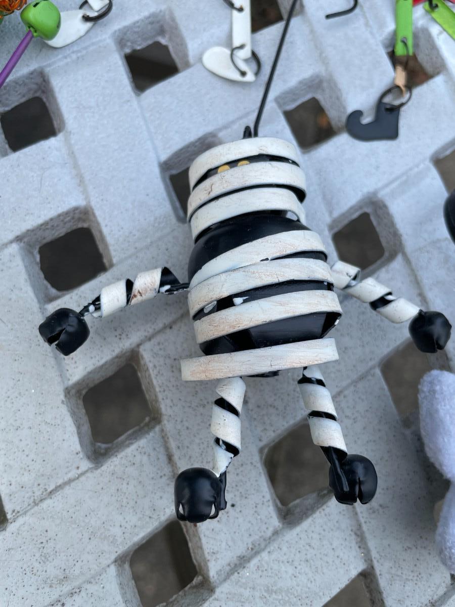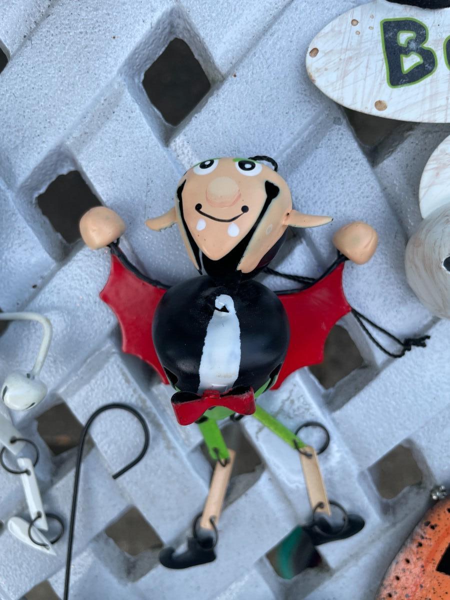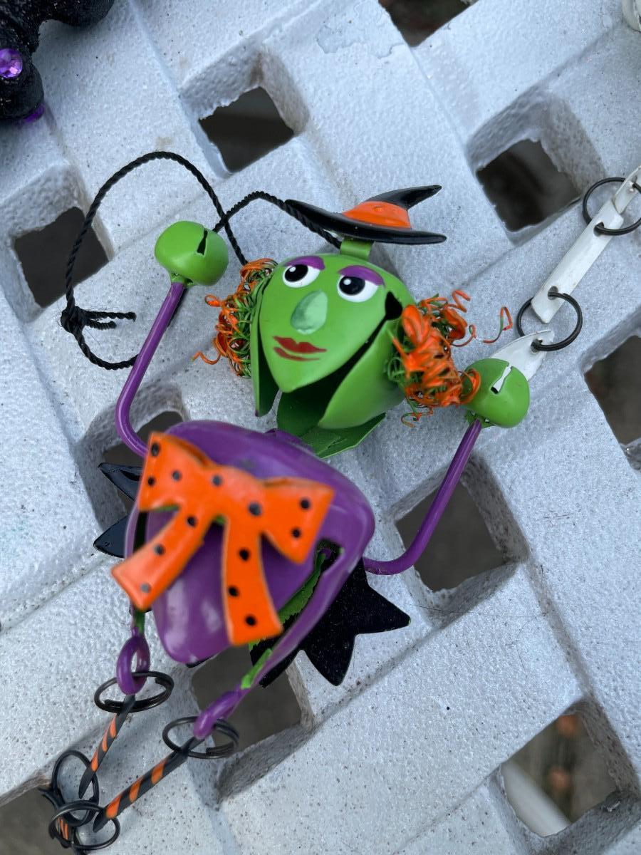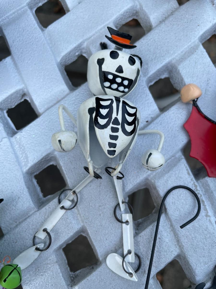 Whimsical set of 17 bell ornaments. Various characters and sizes, made from painted metal, faux antiqued. Approximately 2-4" high.