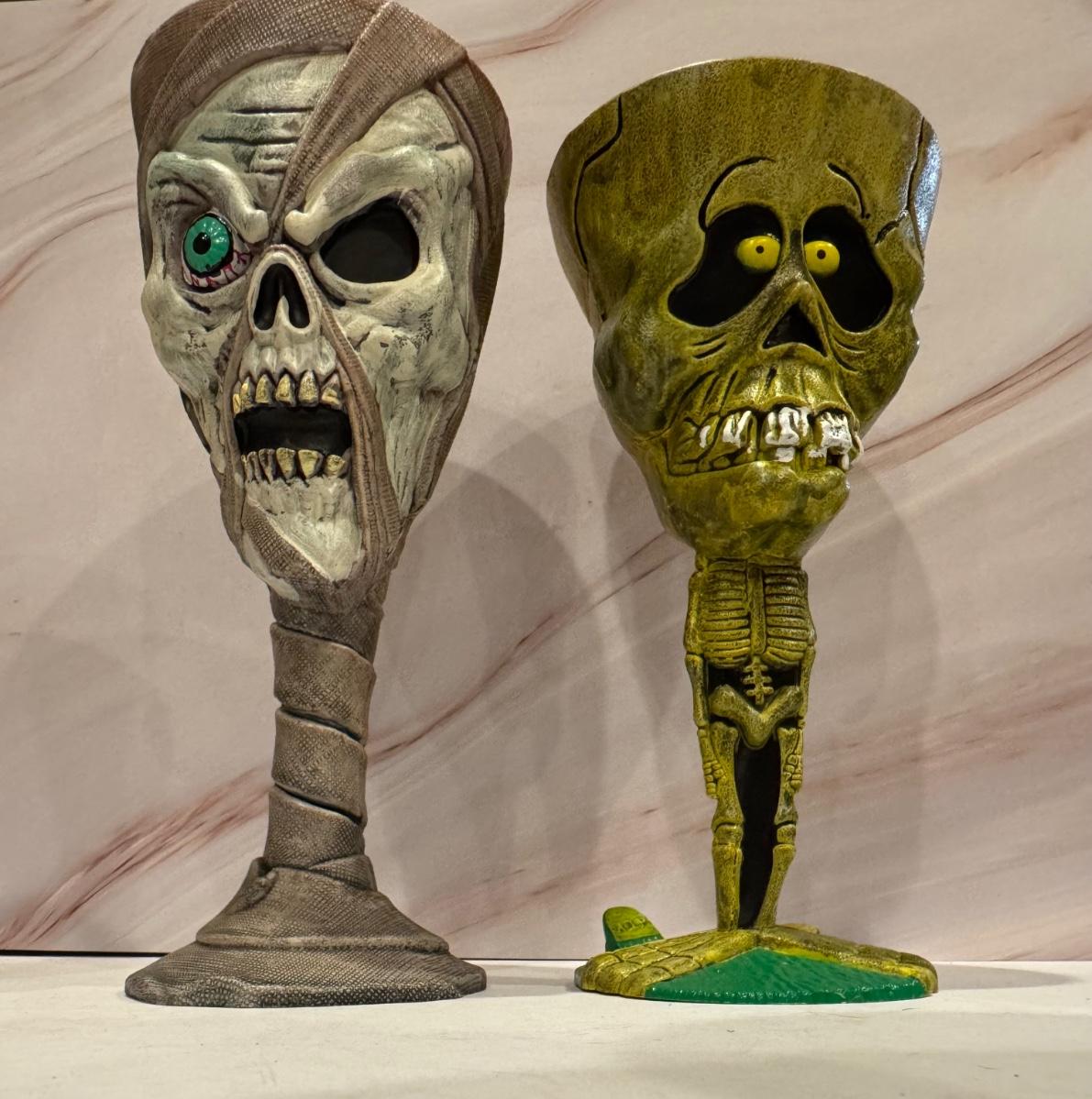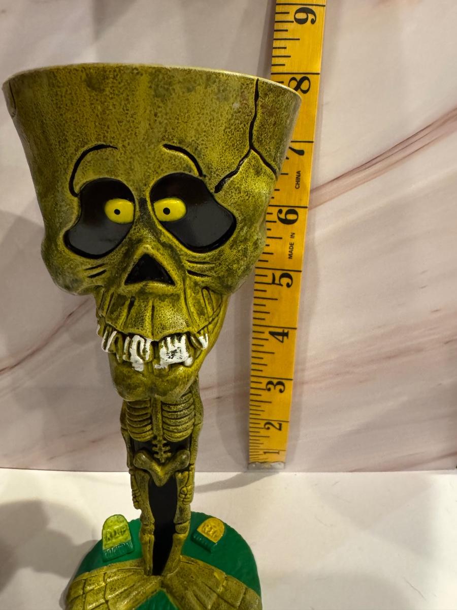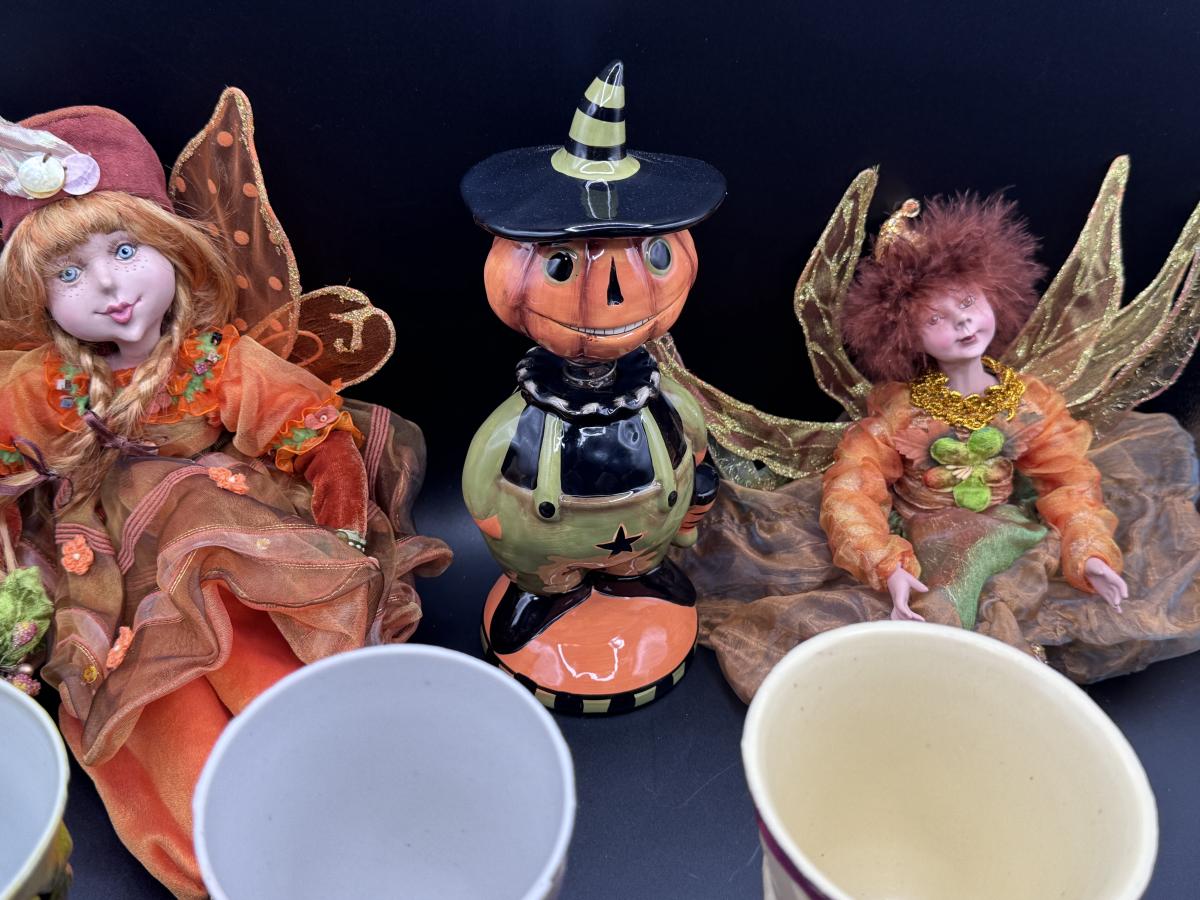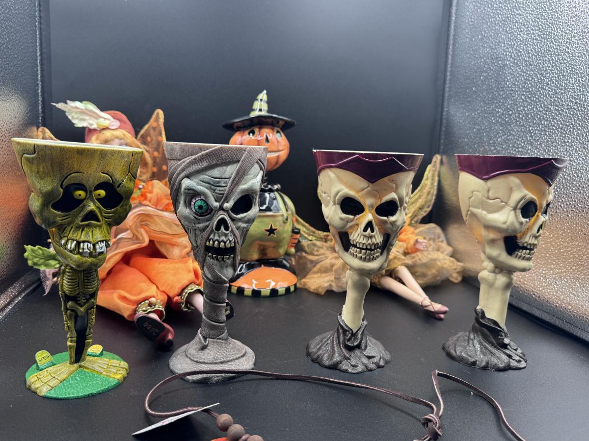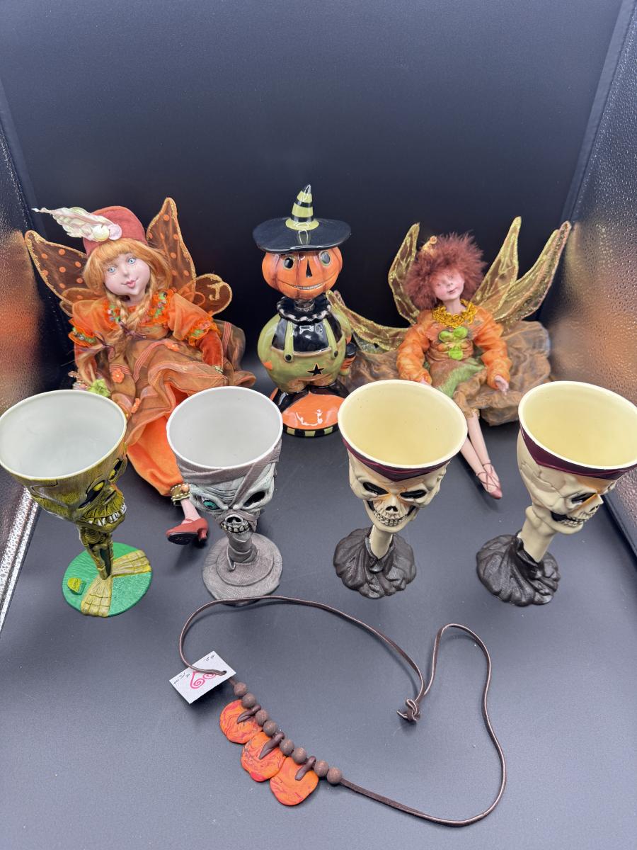 Halloween Collection: 4 Skeleton Plastic Goblets, 2 Woodland Fairy Dolls, 1 Bobble Head & a Pumpkin Necklace