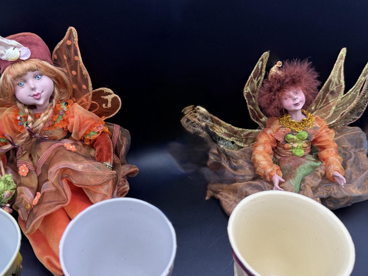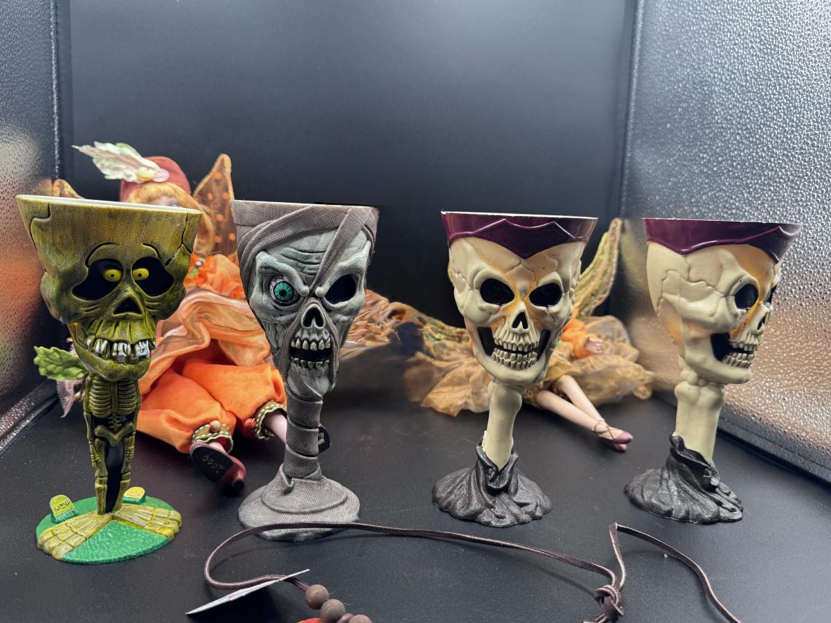 Lot includes two (2) Woodland Fairy Dolls, Winwood Elf (16") & Fairy Elf Wings (13"). Vintage posable dolls, referred to as "shelf sitters". Enhance your fall decor. Also inclues four (4) Skeleton Skill Plastic Wine Goblets, 2 costumes & Halloween CD.