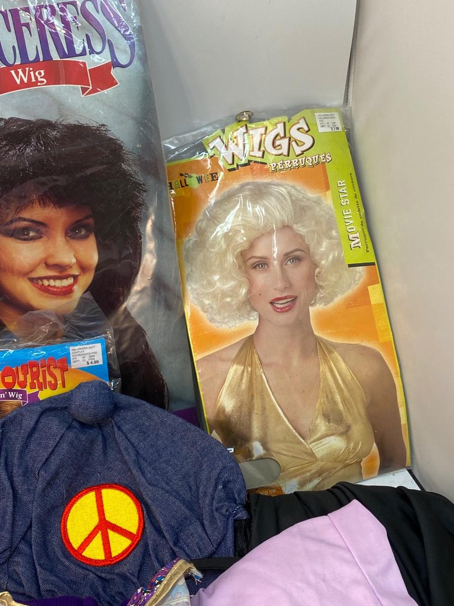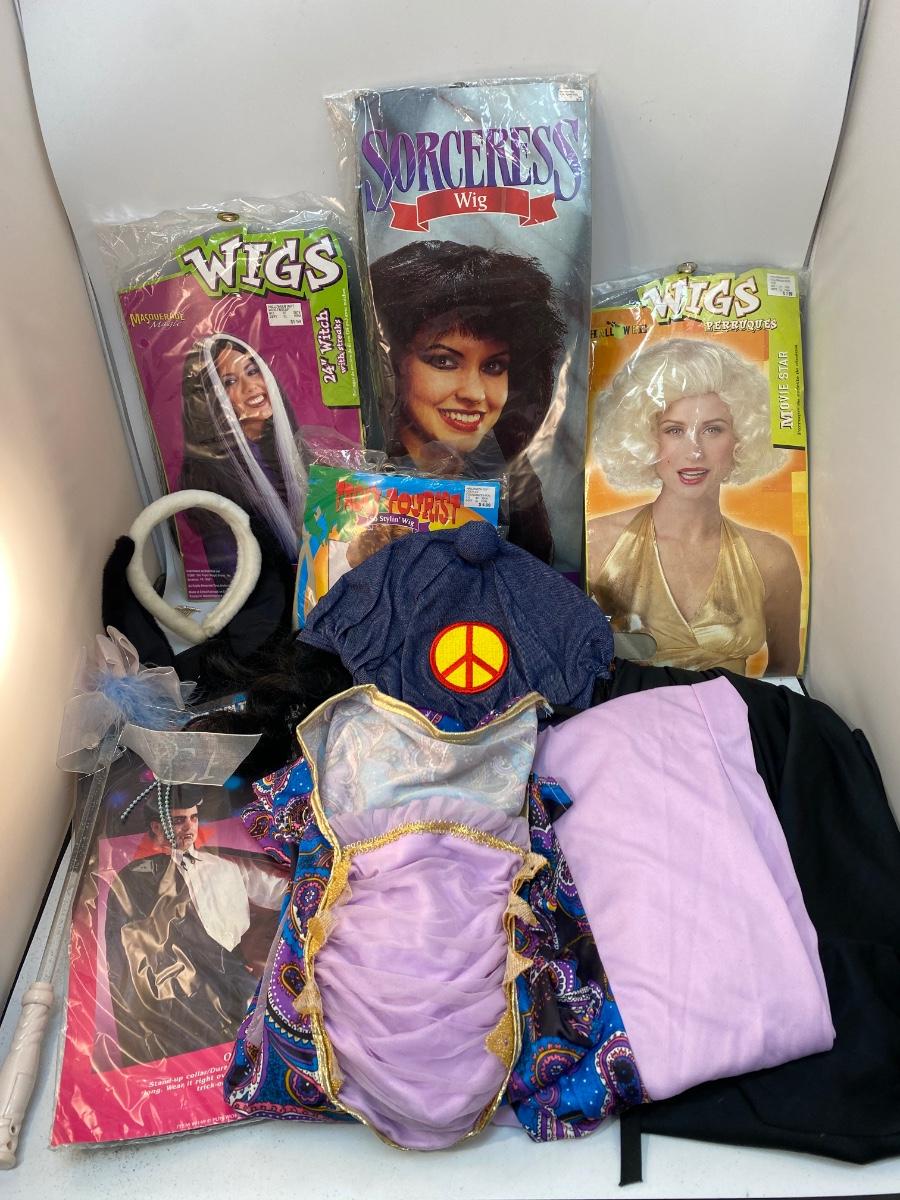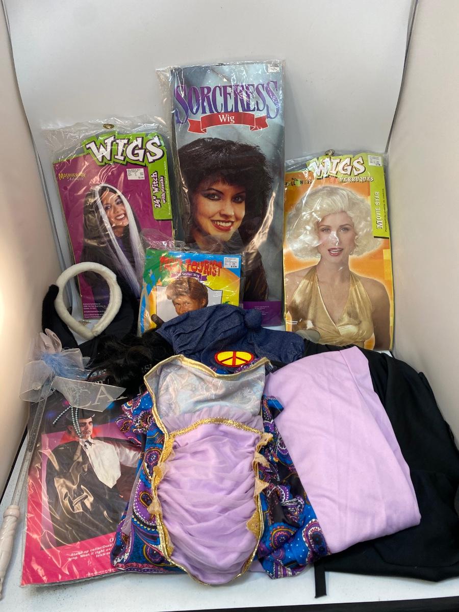 Halloween Costume Make Believe Dress Up Lot. Lot includes various wigs, capes, a fairy wand, harem girl/ genie outfit. Wigs look unused in the packages.