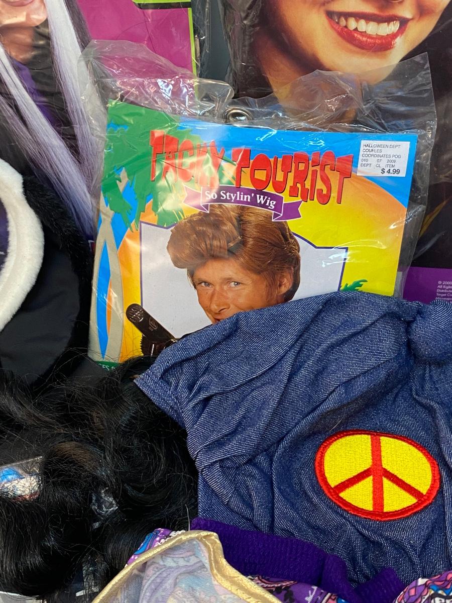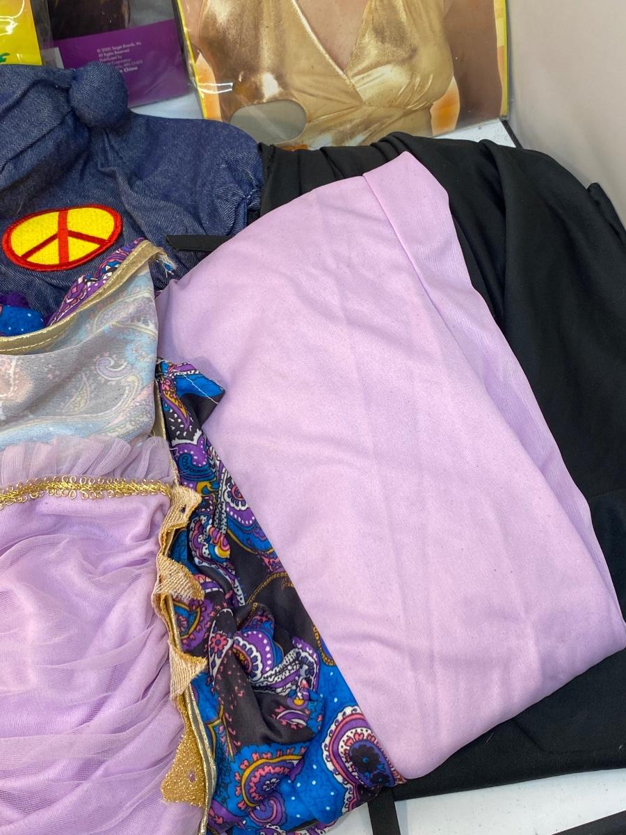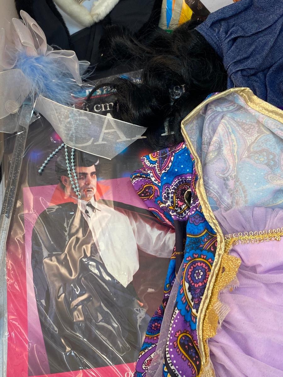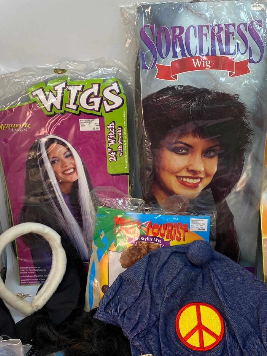 Halloween Costume Make Believe Dress Up Lot. Lot includes various wigs, capes, a fairy wand, harem girl/ genie outfit. Wigs look unused in the packages.