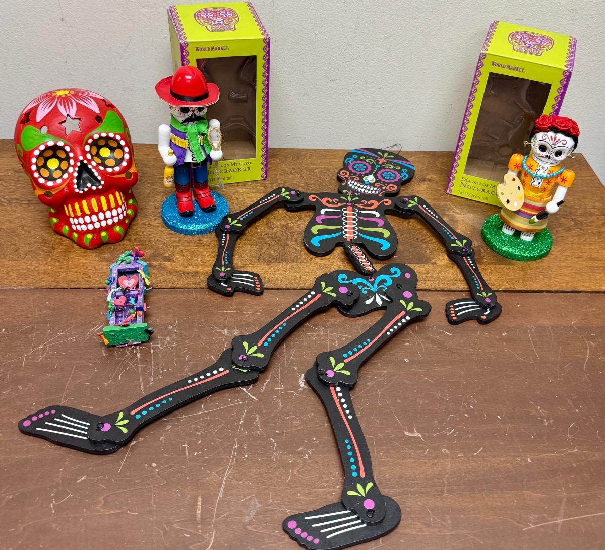In very good condition. Skeleton Hanging, Skeleton Nutcrackers with box, Ornament, and a Skull.