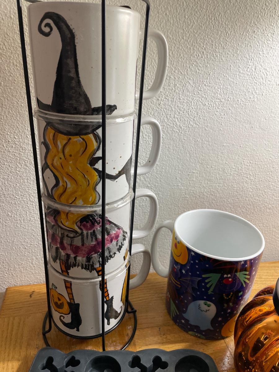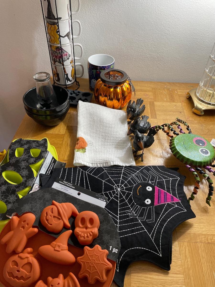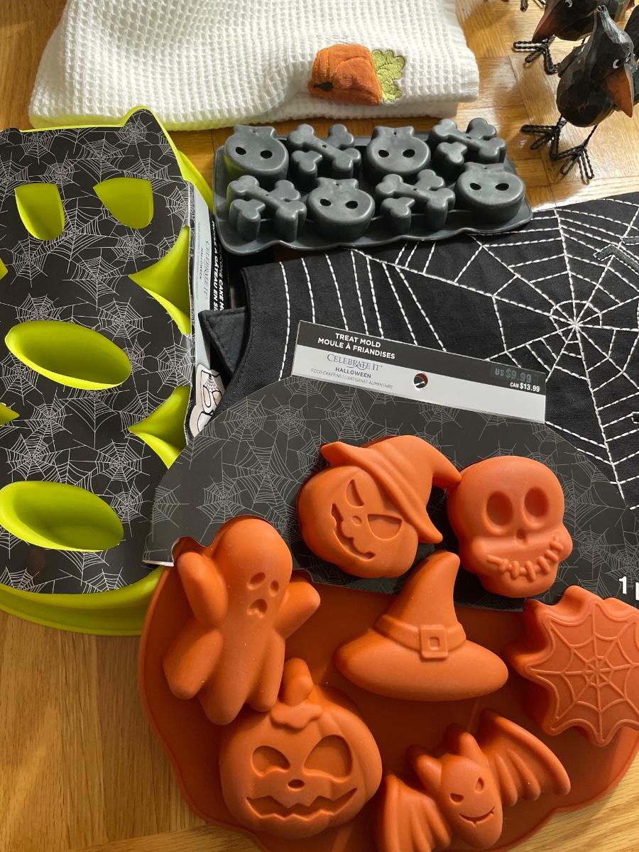 Includes treat, molds, dish, towel, birds, spider, and coffee mugs