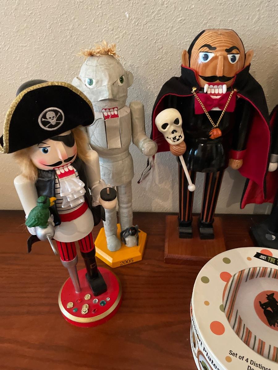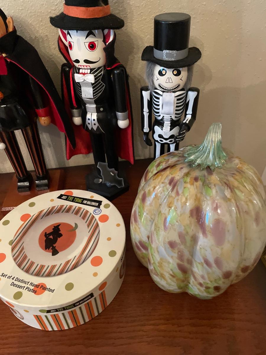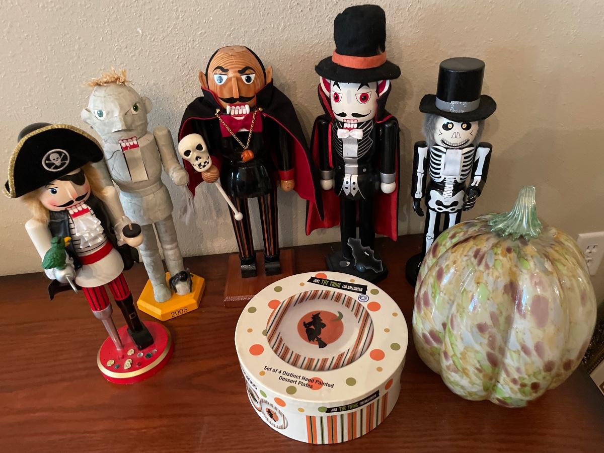 Multiple nutcracker Halloween figures, pumpkin, and plates