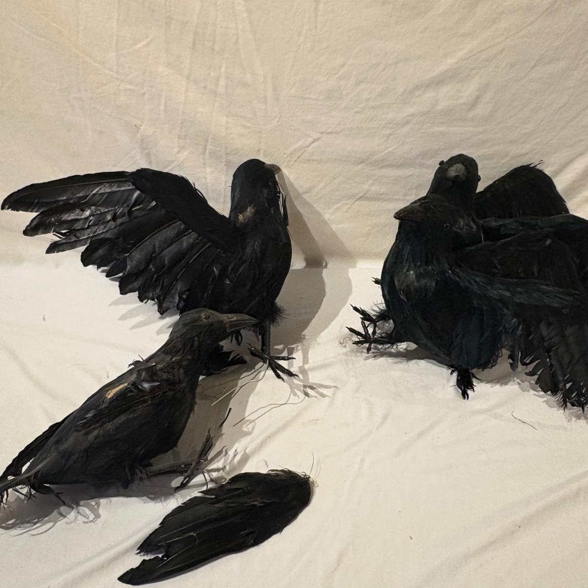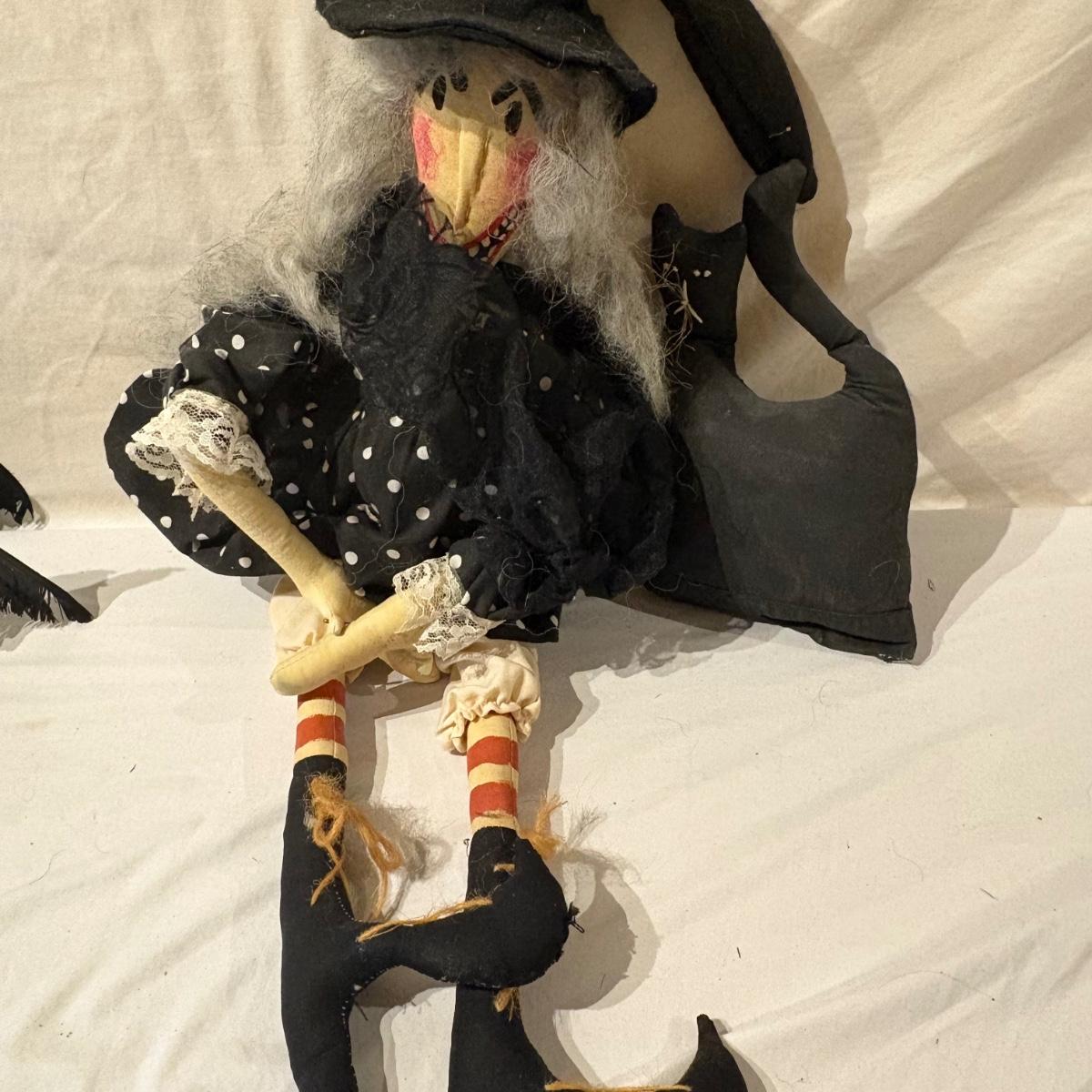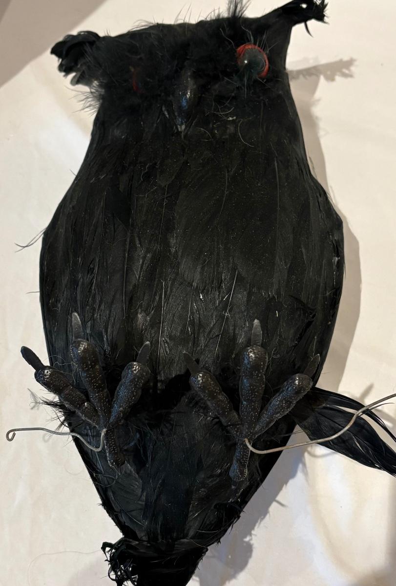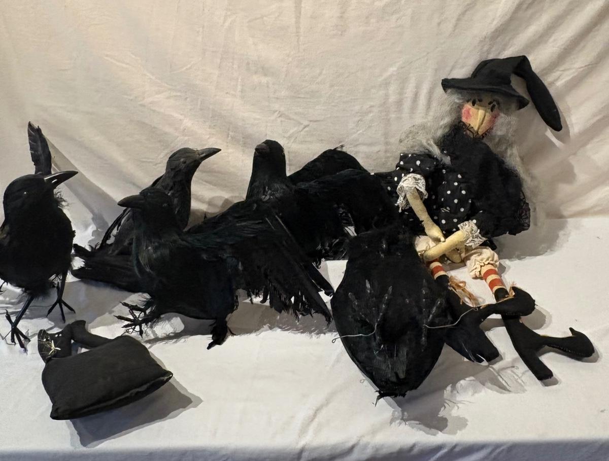Crows, owl, cat , and witch form a crew of Halloween themed decor. Crows are approximately 11.6”H and witch is 27”H from toe to head. One crow has a dislodged wing but it appears to be fixable.