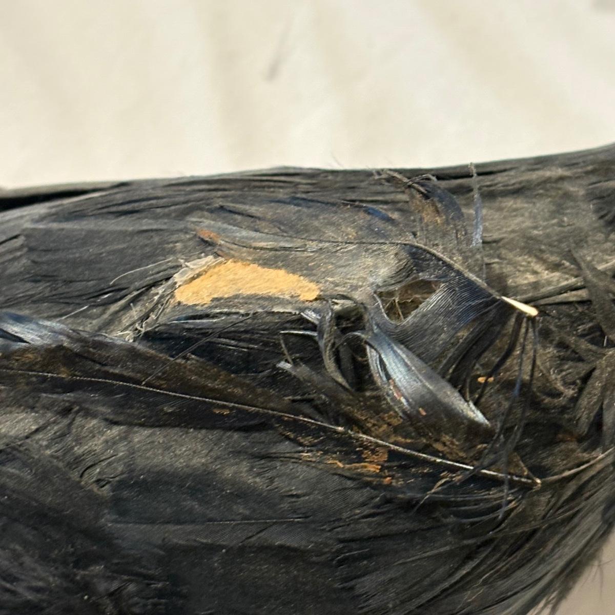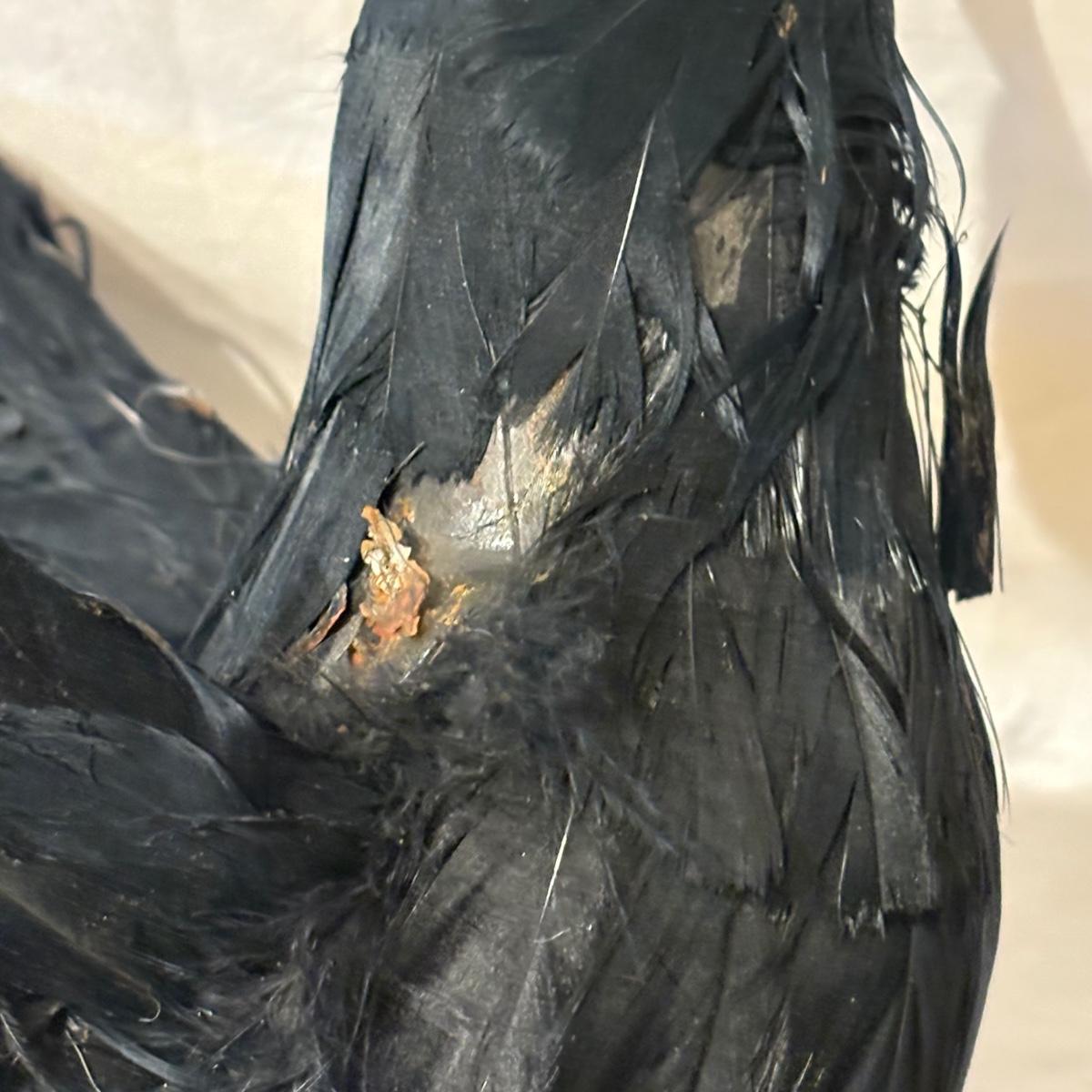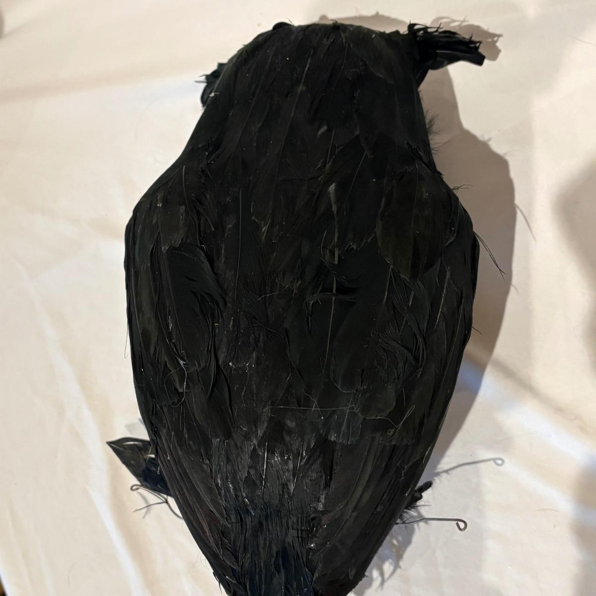 Crows, owl, cat , and witch form a crew of Halloween themed decor. Crows are approximately 11.6”H and witch is 27”H from toe to head. One crow has a dislodged wing but it appears to be fixable.