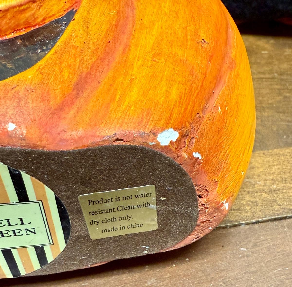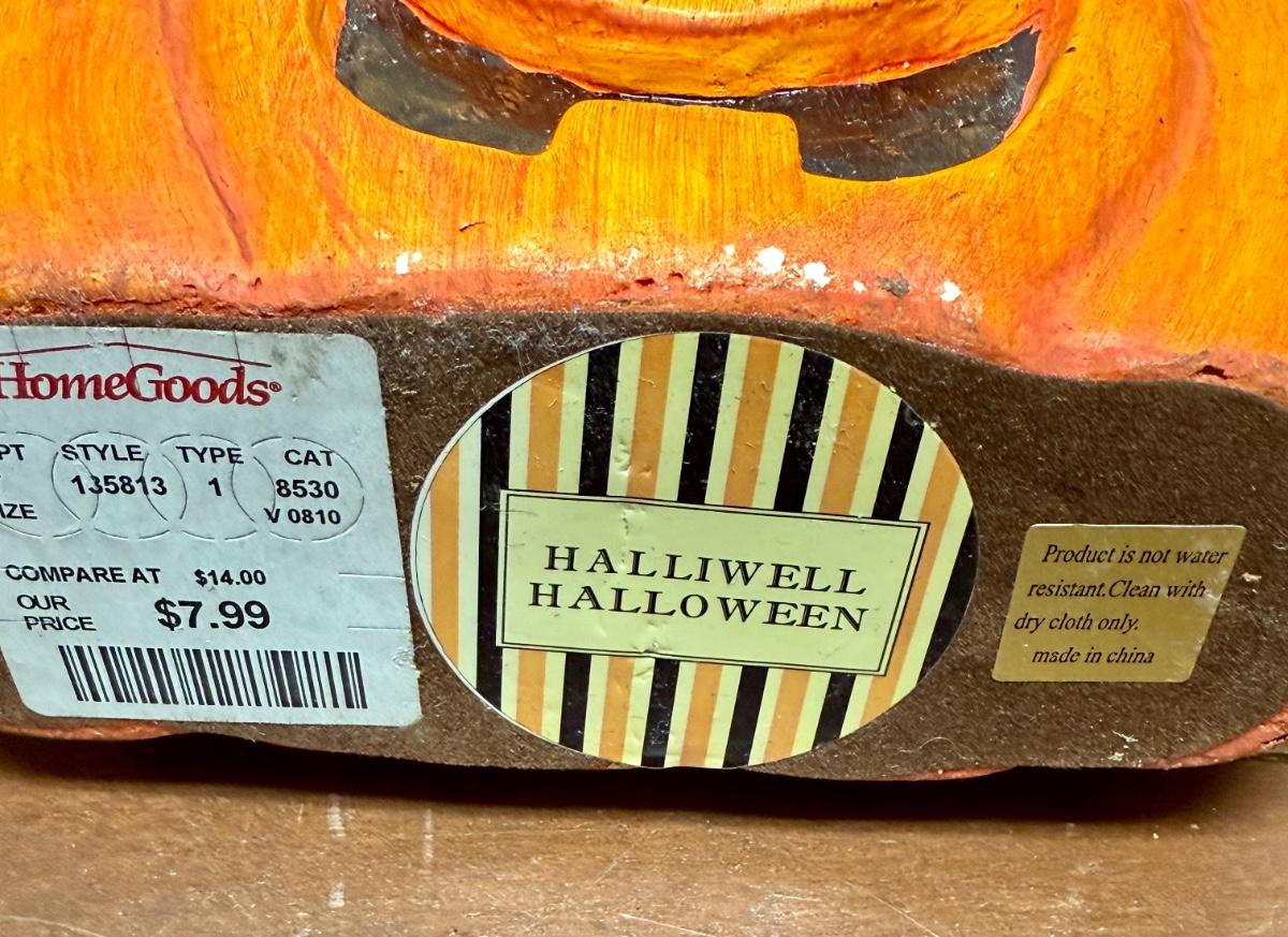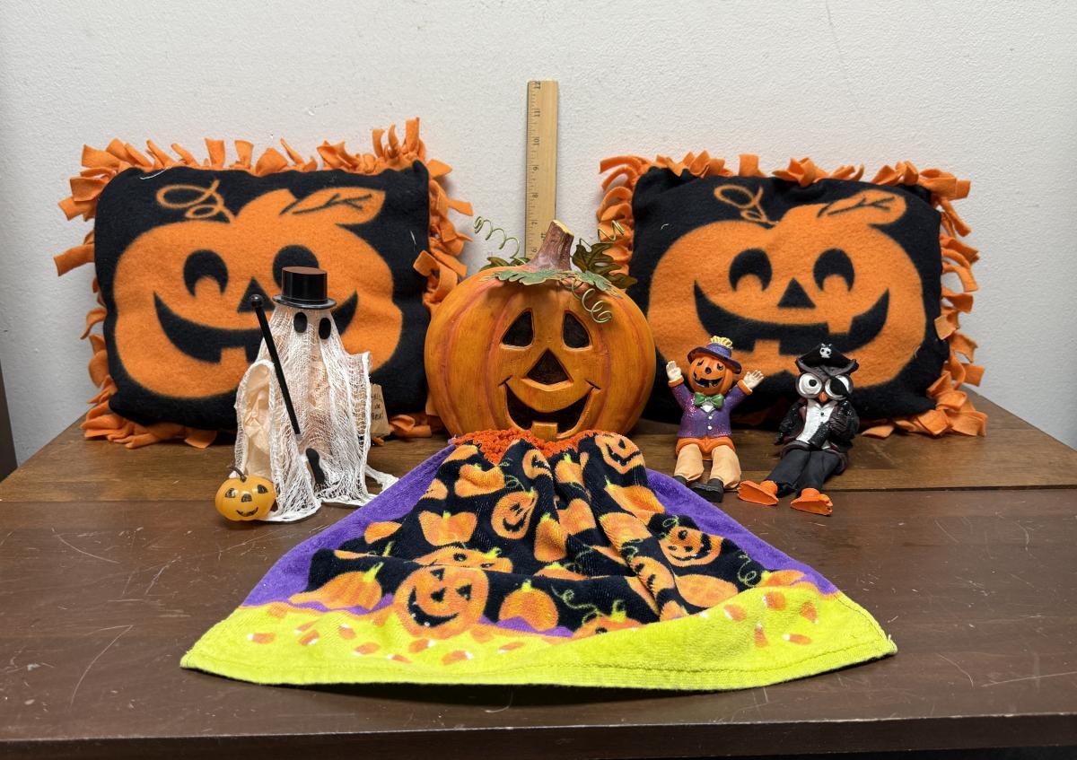 Smiling Jack-O-Lantern pillows with orange fringe, ghost, pumpkin-head scarecrow and pirate owl figurines, hand towel, and more.