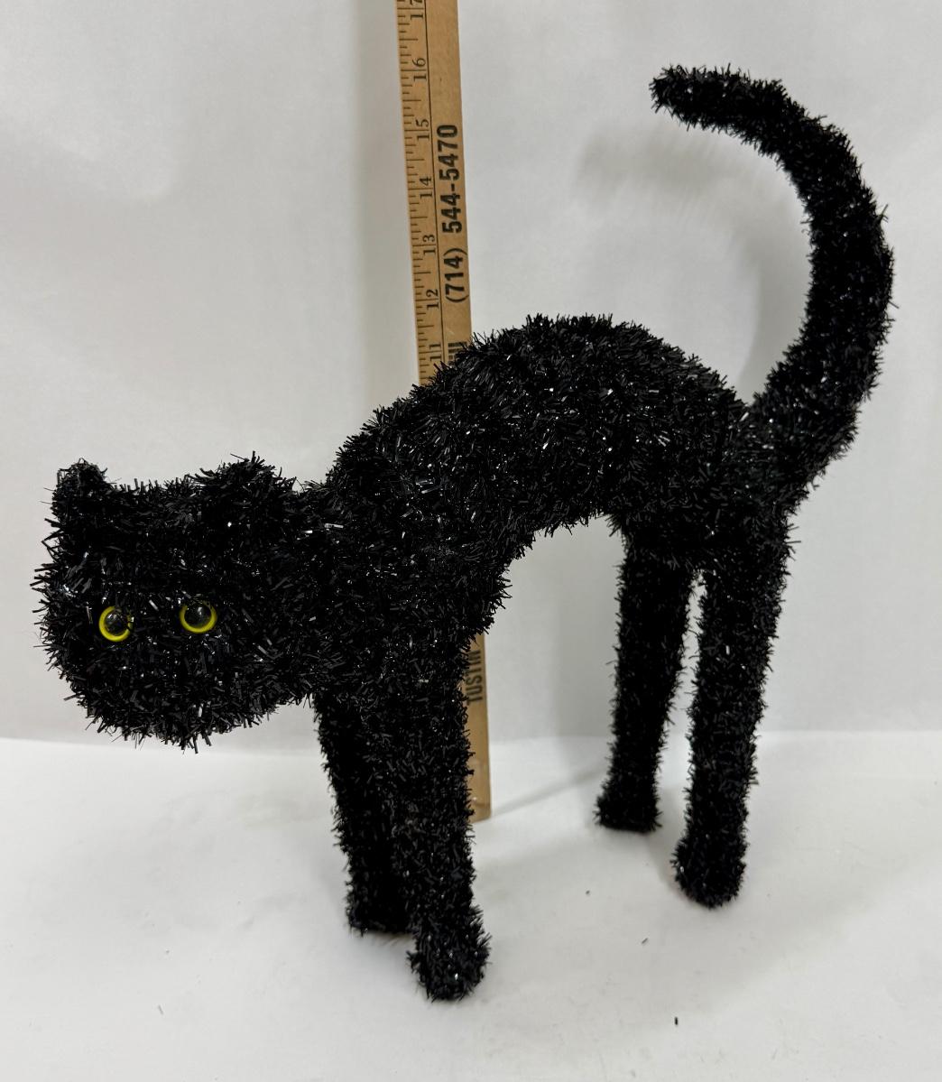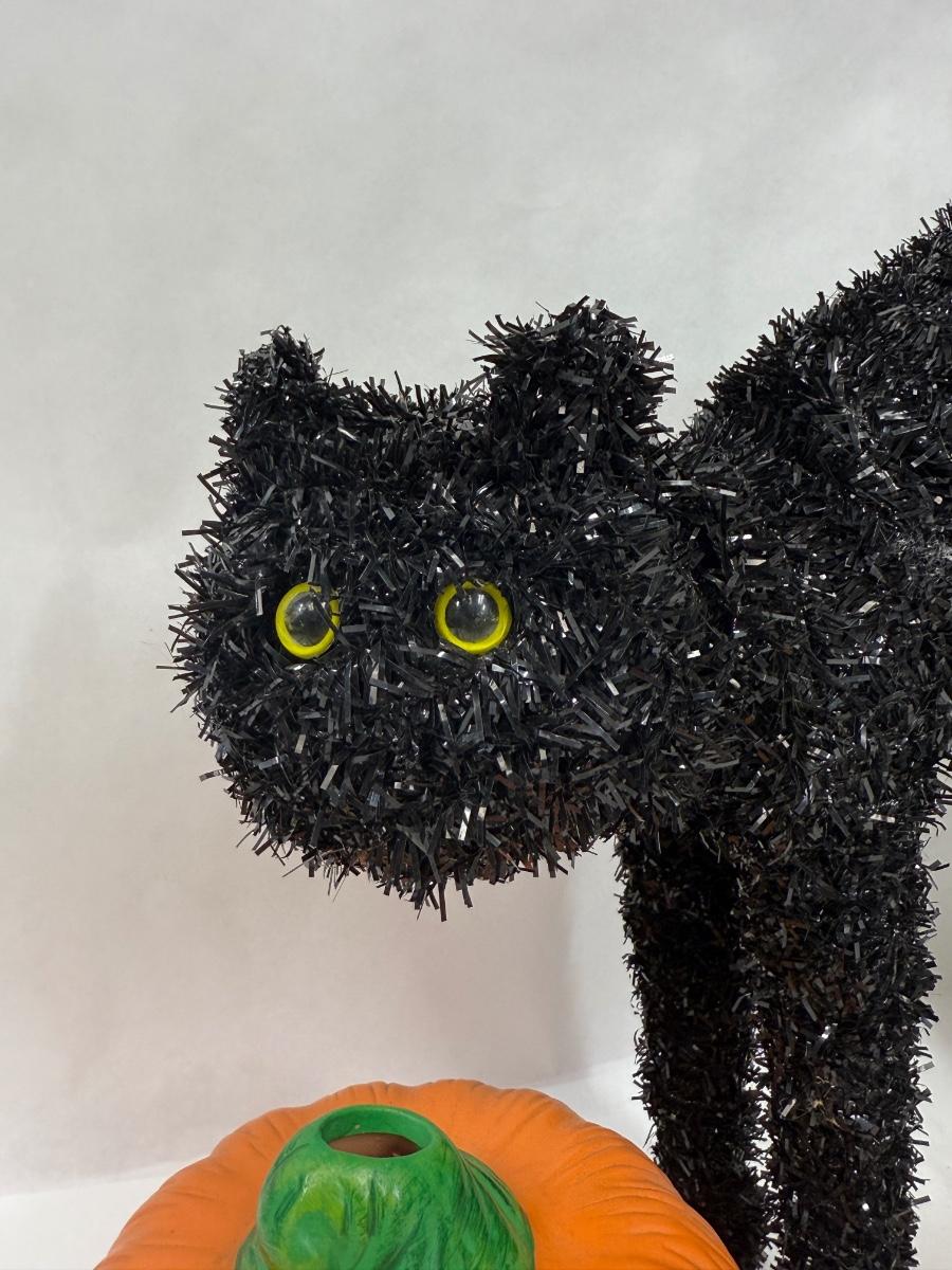 Sign and pumpkin are ceramic, cat is a stiff chenille-like material. All in good condition.