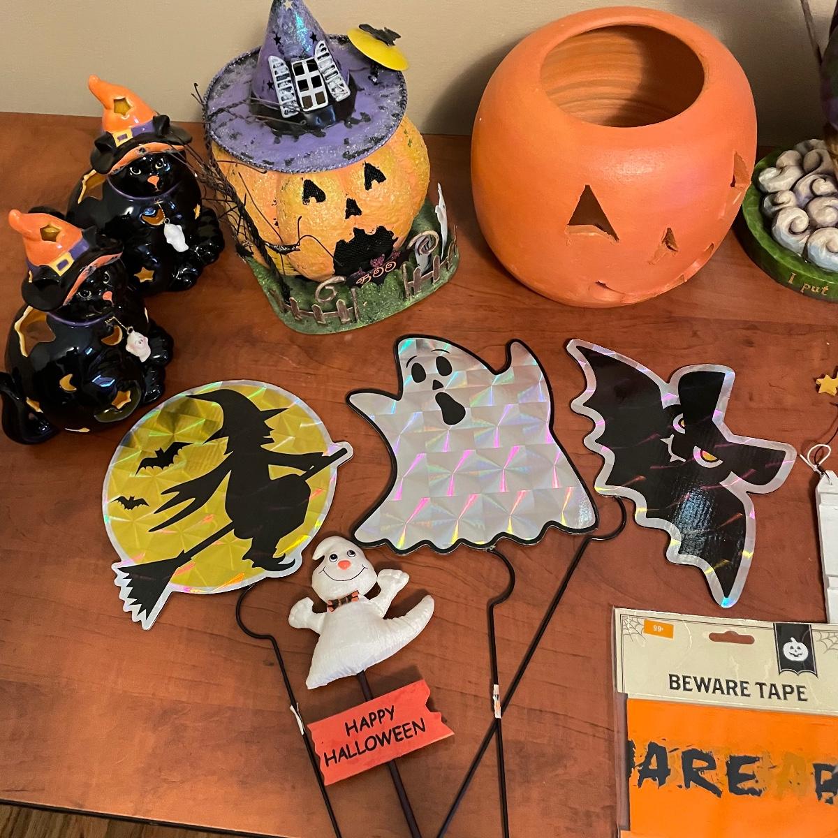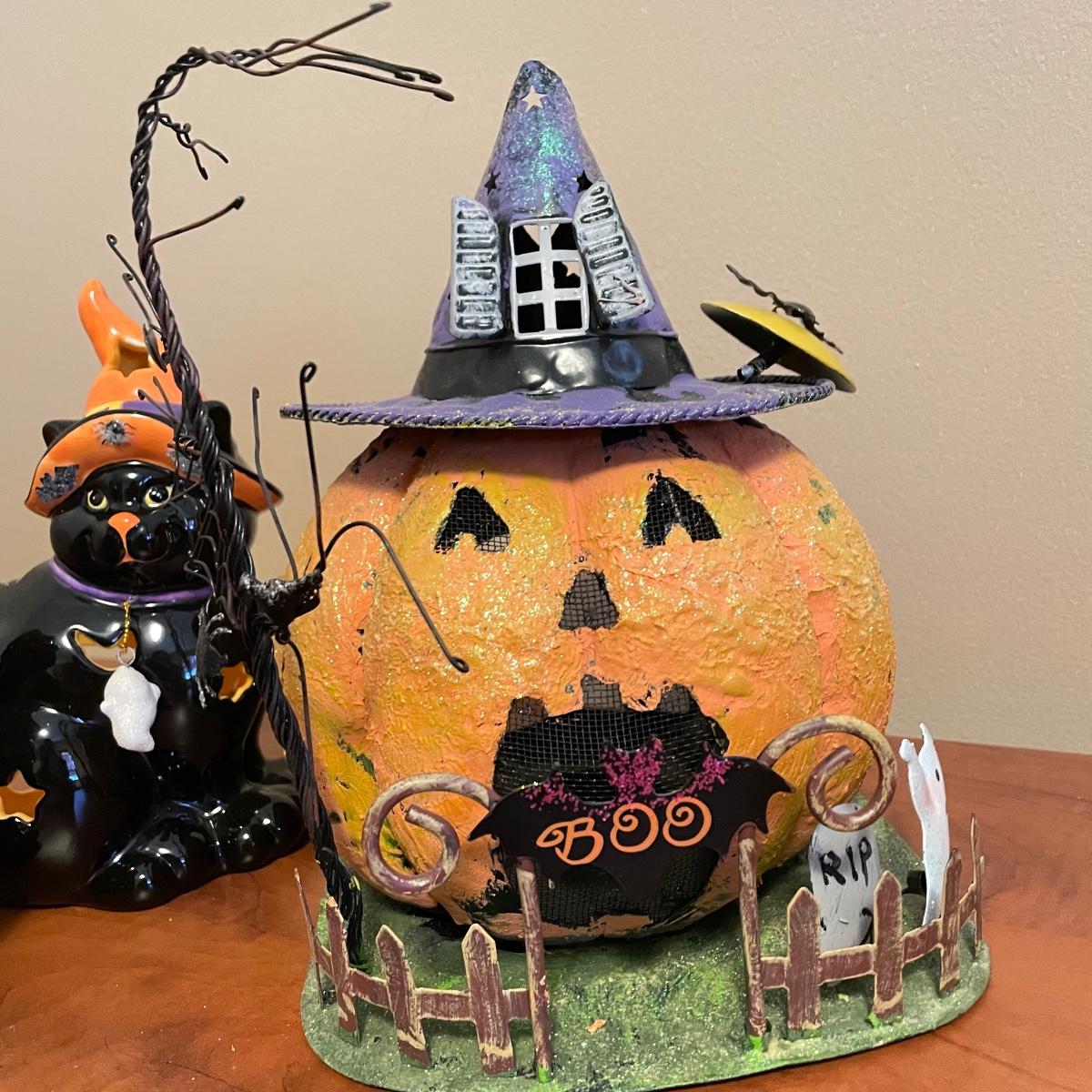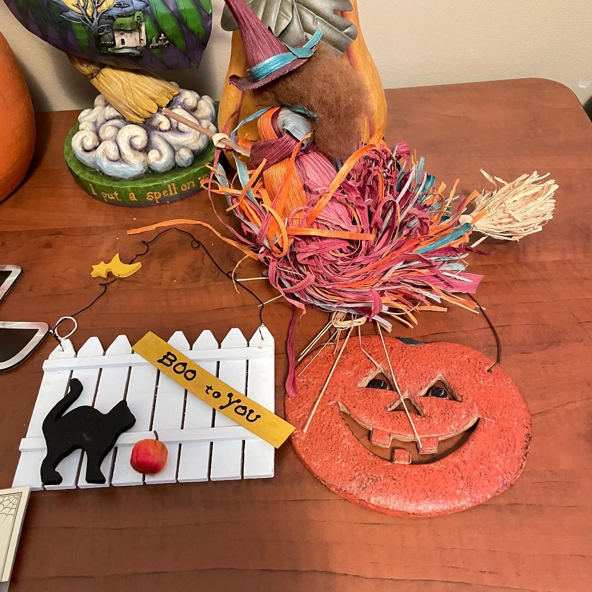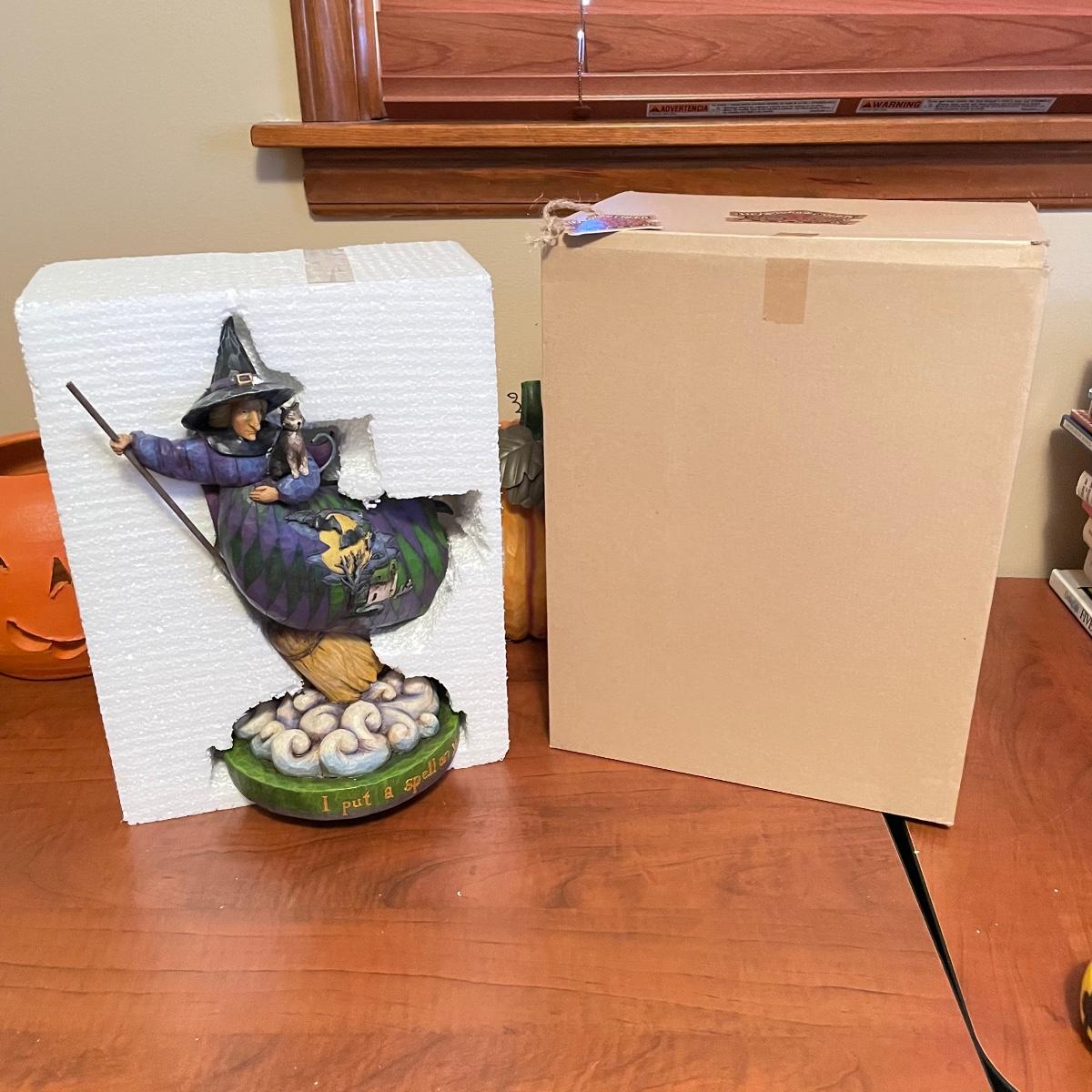 Grab some spooky and fun decor! Jim Shore’s “I Put a Spell on You” witch figurine with box and protective foam. Lot includes two ceramic cat lanterns, one metal and one pottery pumpkin lanterns. The pottery pumpkin is signed and stands 7” tall. Lot also features yard/plant pot signs, hanging decor and one package of unopened Beware tape. See images. Local pick up only.