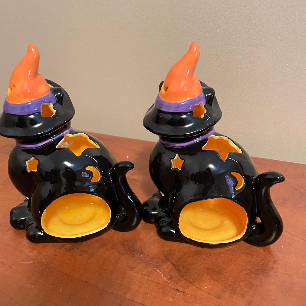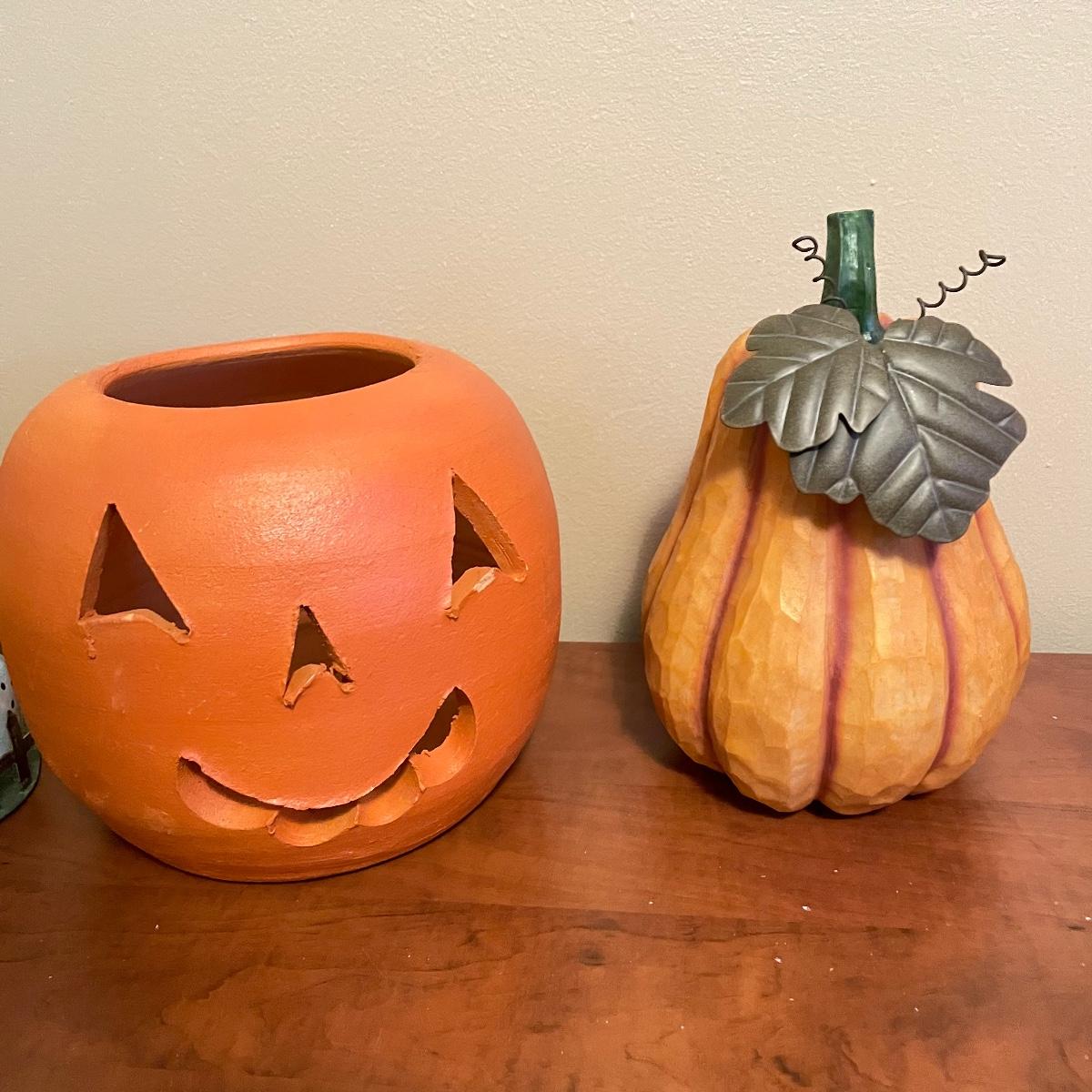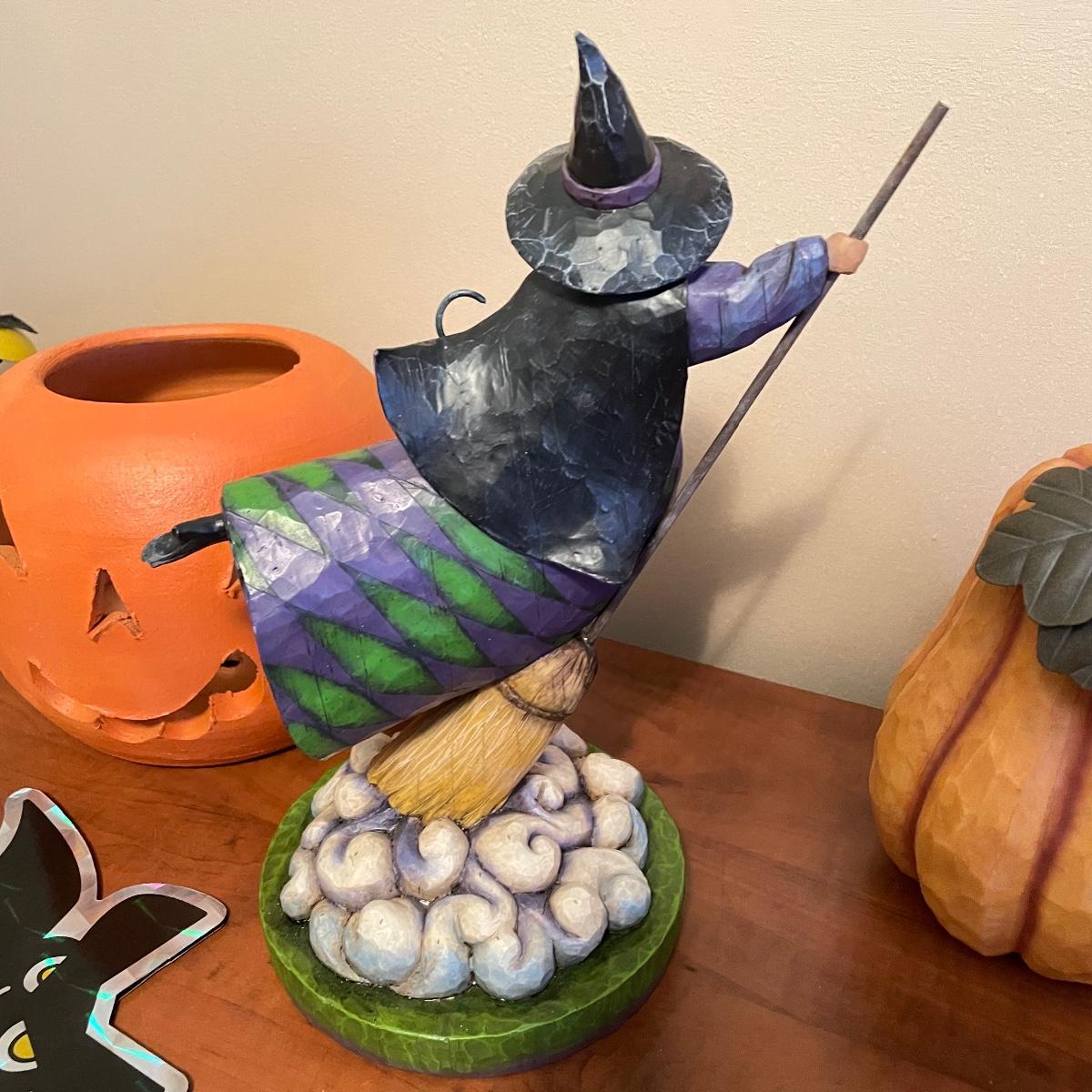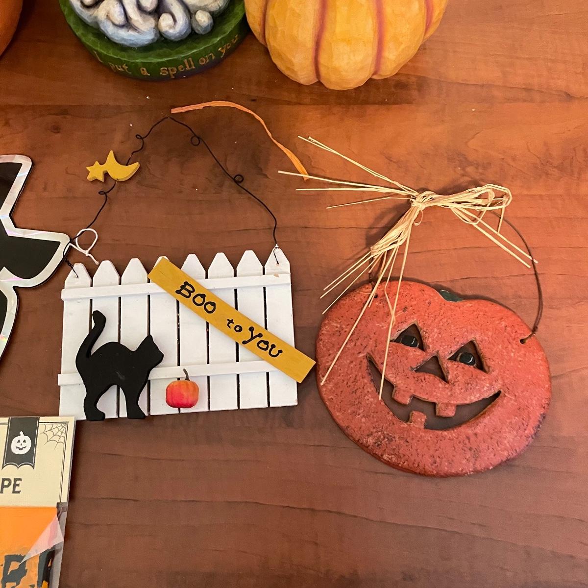 Grab some spooky and fun decor! Jim Shore’s “I Put a Spell on You” witch figurine with box and protective foam. Lot includes two ceramic cat lanterns, one metal and one pottery pumpkin lanterns. The pottery pumpkin is signed and stands 7” tall. Lot also features yard/plant pot signs, hanging decor and one package of unopened Beware tape. See images. Local pick up only.