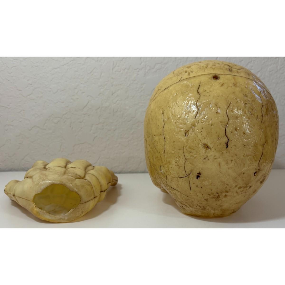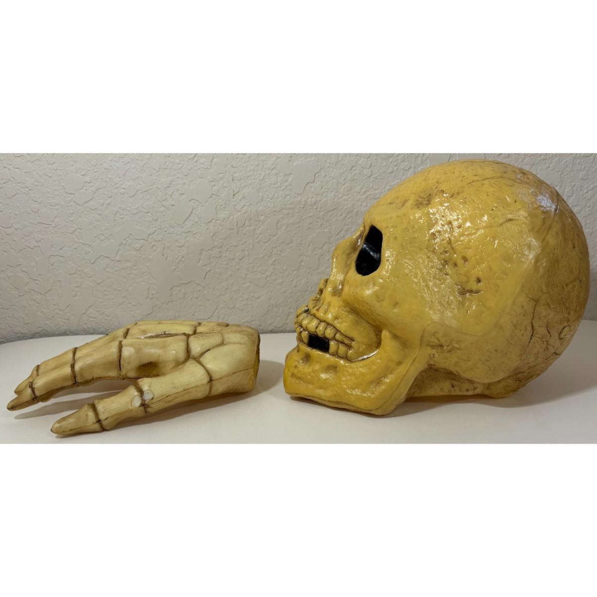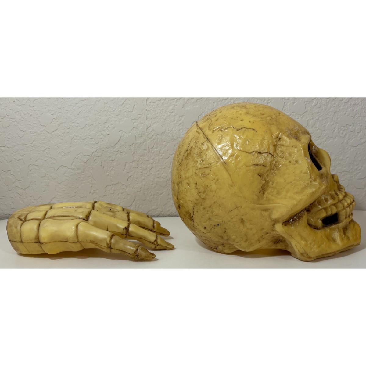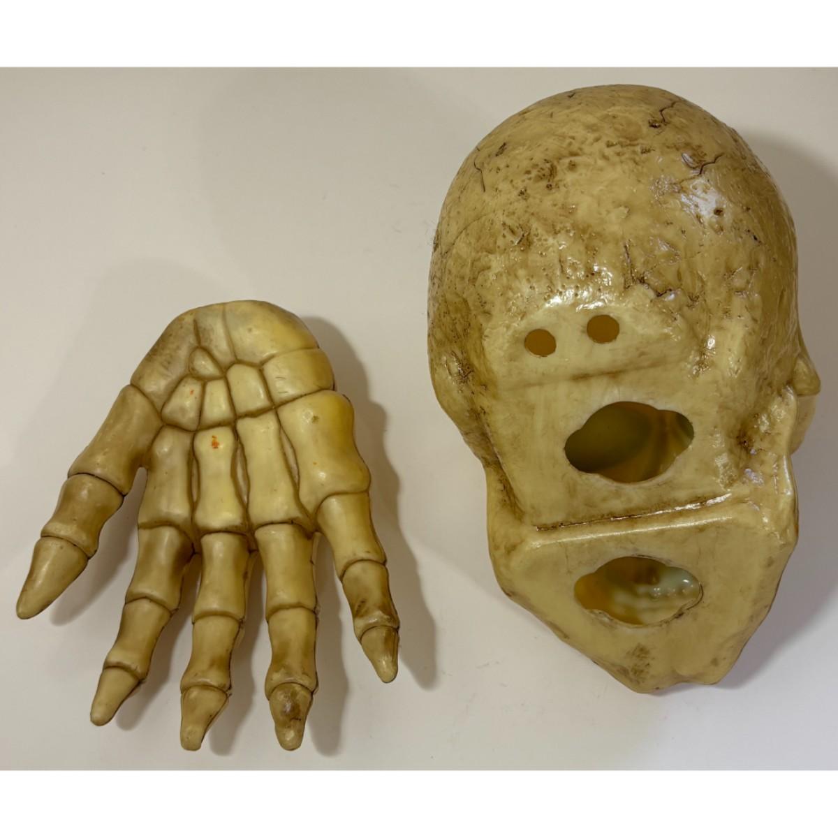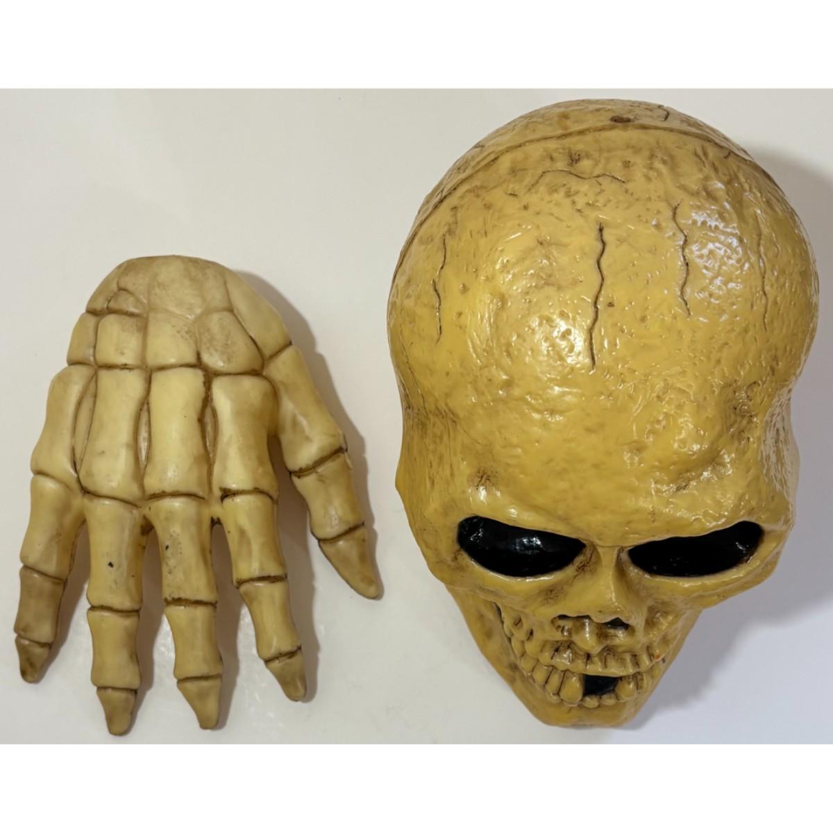 You get a skull and hand - both are made of plastic and are in good condition with minor surface wear. The hand is approximately 7.25" long at its longest and 6" wide from thumb to pinky. The skull's base is roughly 6.75" long by 4.5" wide and it stands about 6.5" tall. Please see all pictures. Thank you for looking. As a reminder, if this is a lot, we do not break up lots. Also, all items are prepacked, so each item is sent individually. Any item that qualifies for media mail and weighs over one pound will be shipped via media mail. Otherwise, the item will be shipped USPS ground advantage, or UPS ground. Shipping for this item is $10.00. Items ship within two days after payment is received. Item SKU is OTH1309.