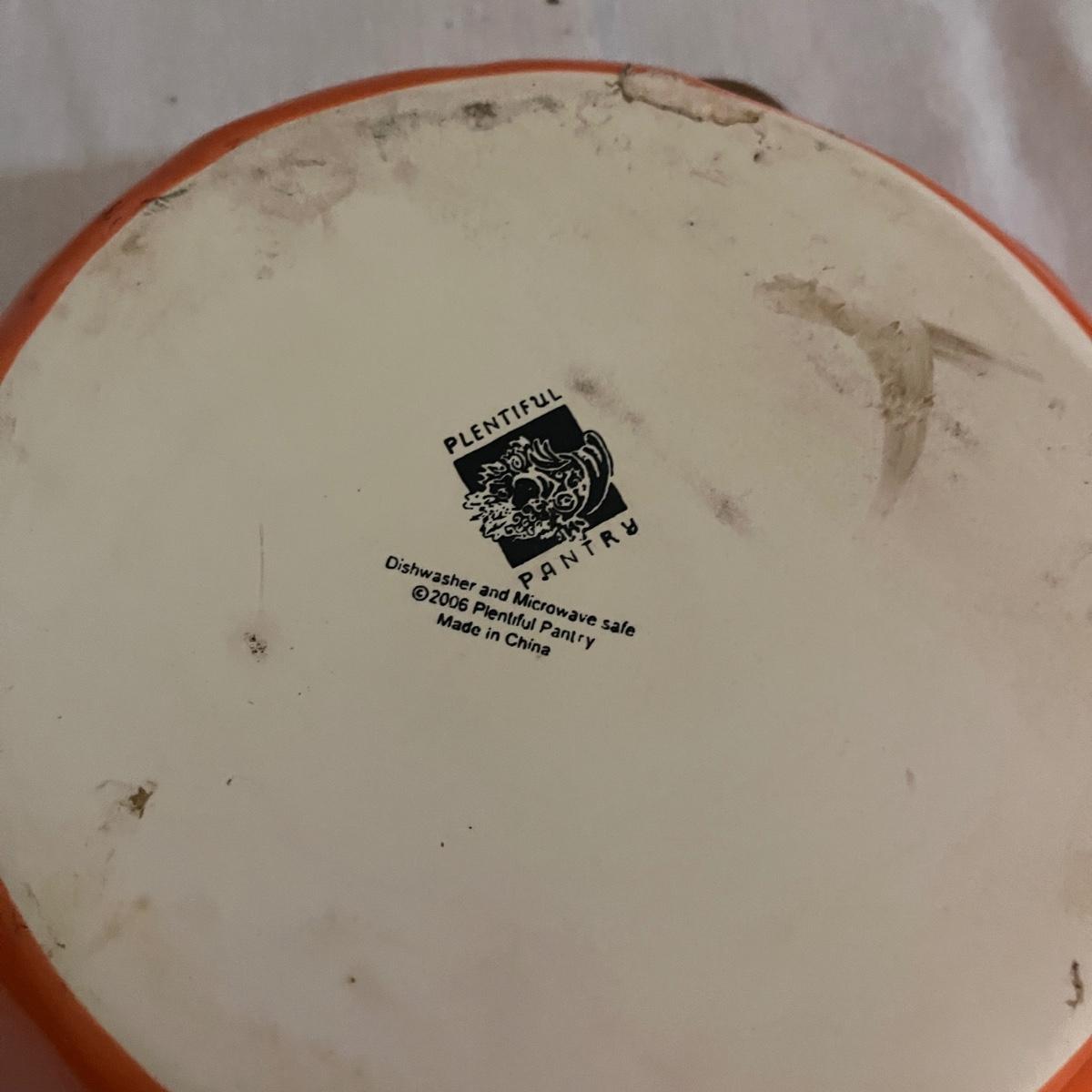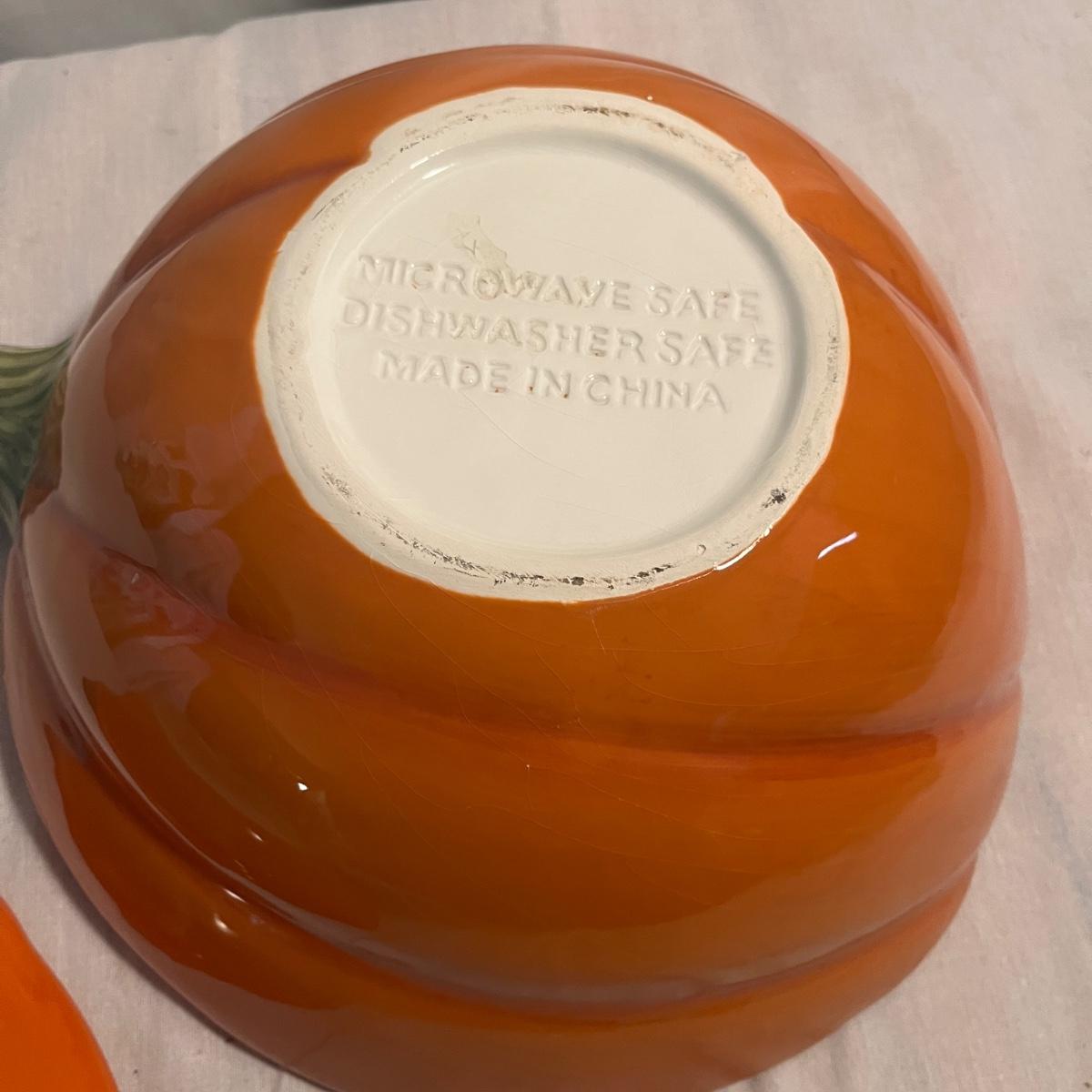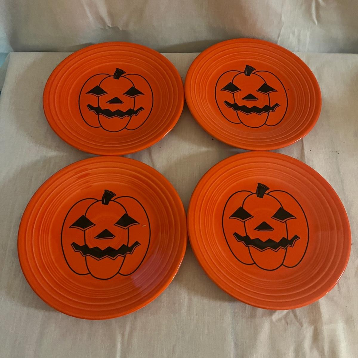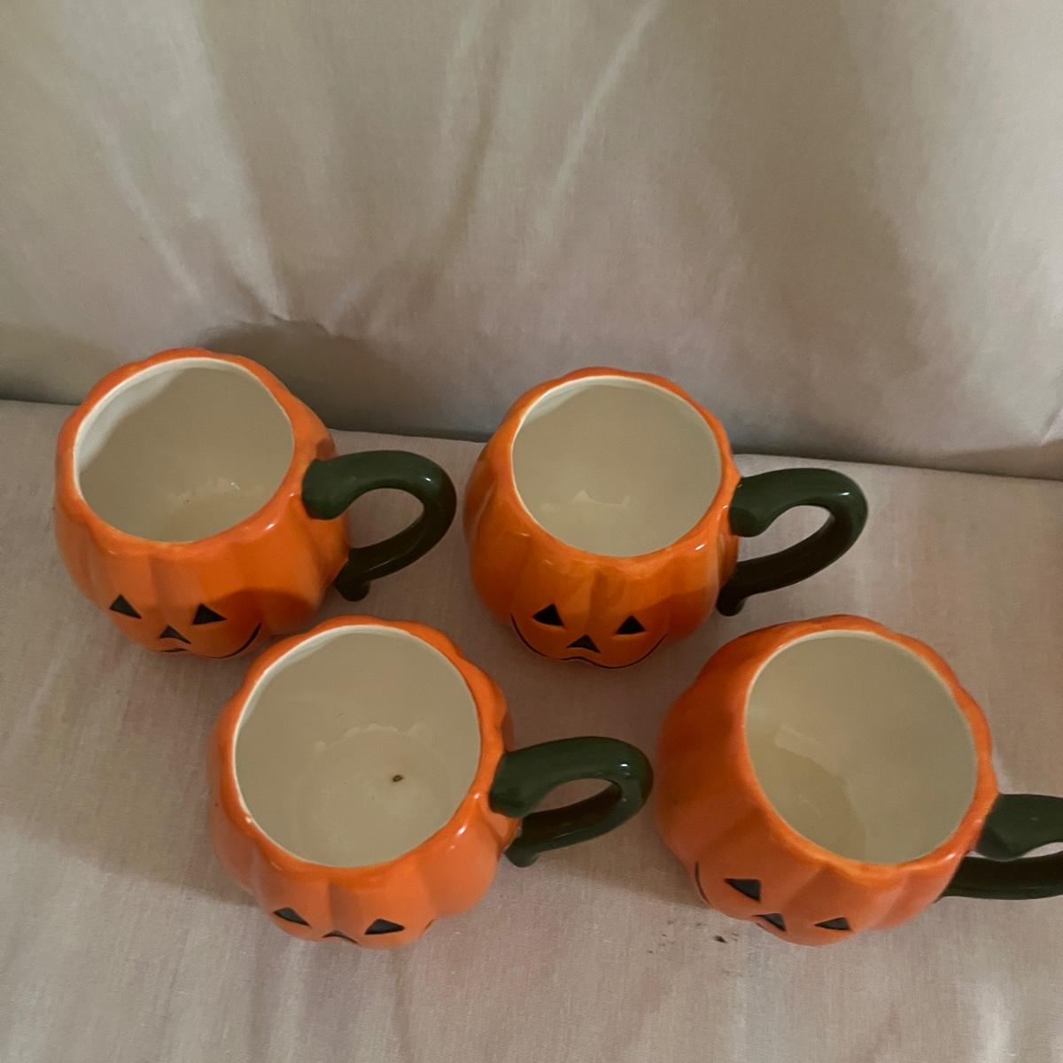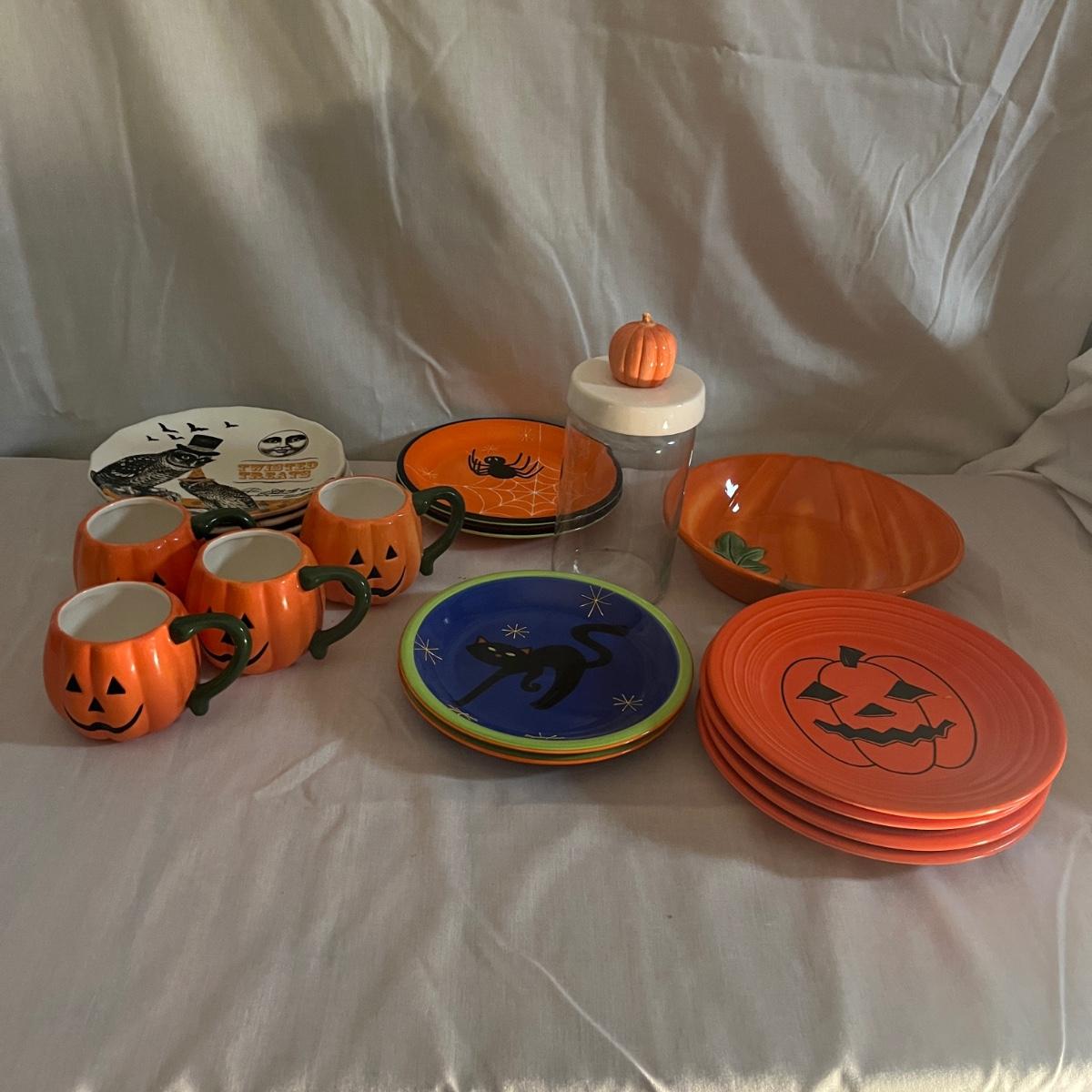 Lot includes 12 ceramic Halloween design plates, four mugs, a clear glass jar and three ceramic pumpkin bowls. The largest pumpkin bowl measures 12”D x 4.5”H. Please see photos for brand names and details.