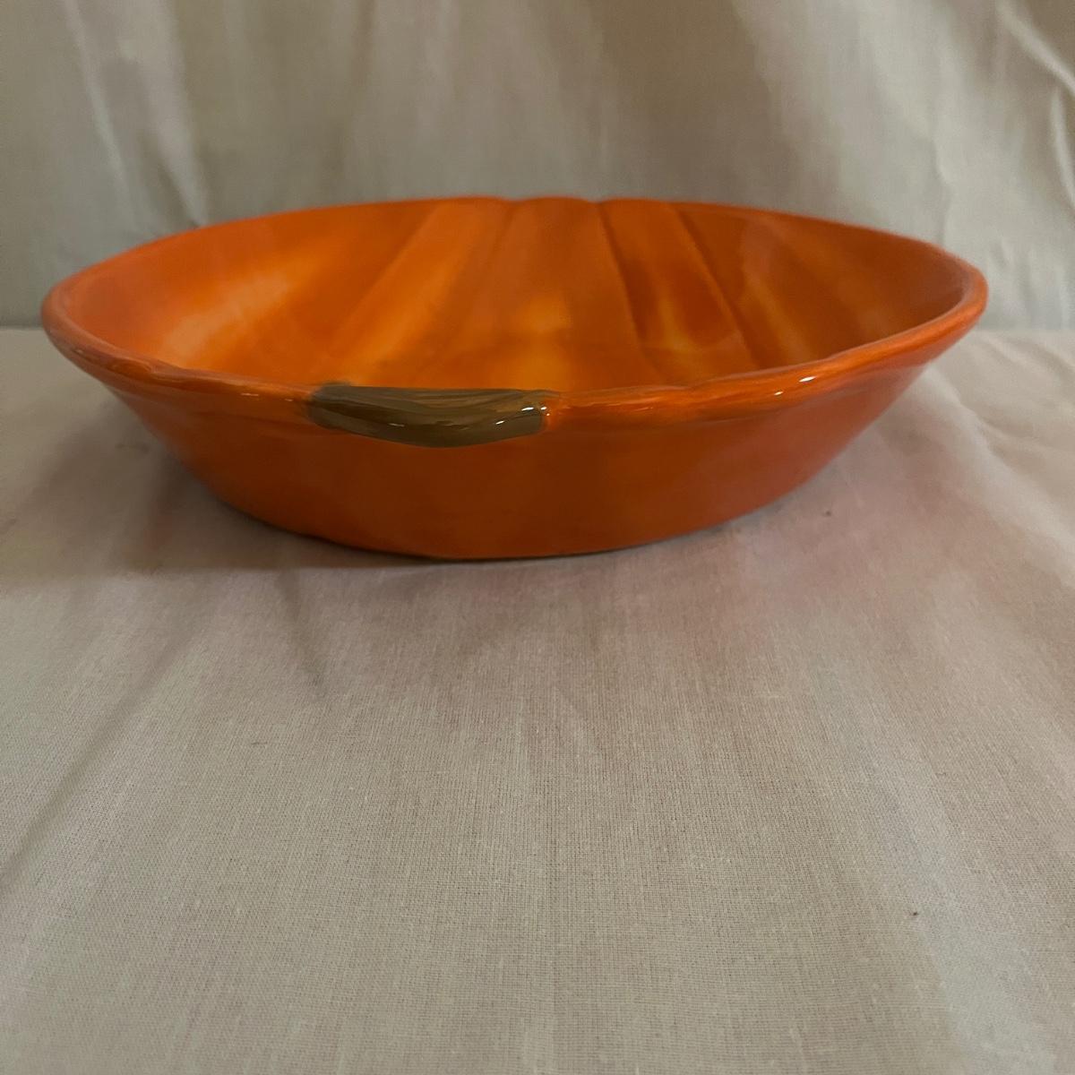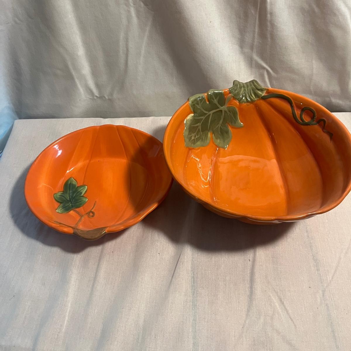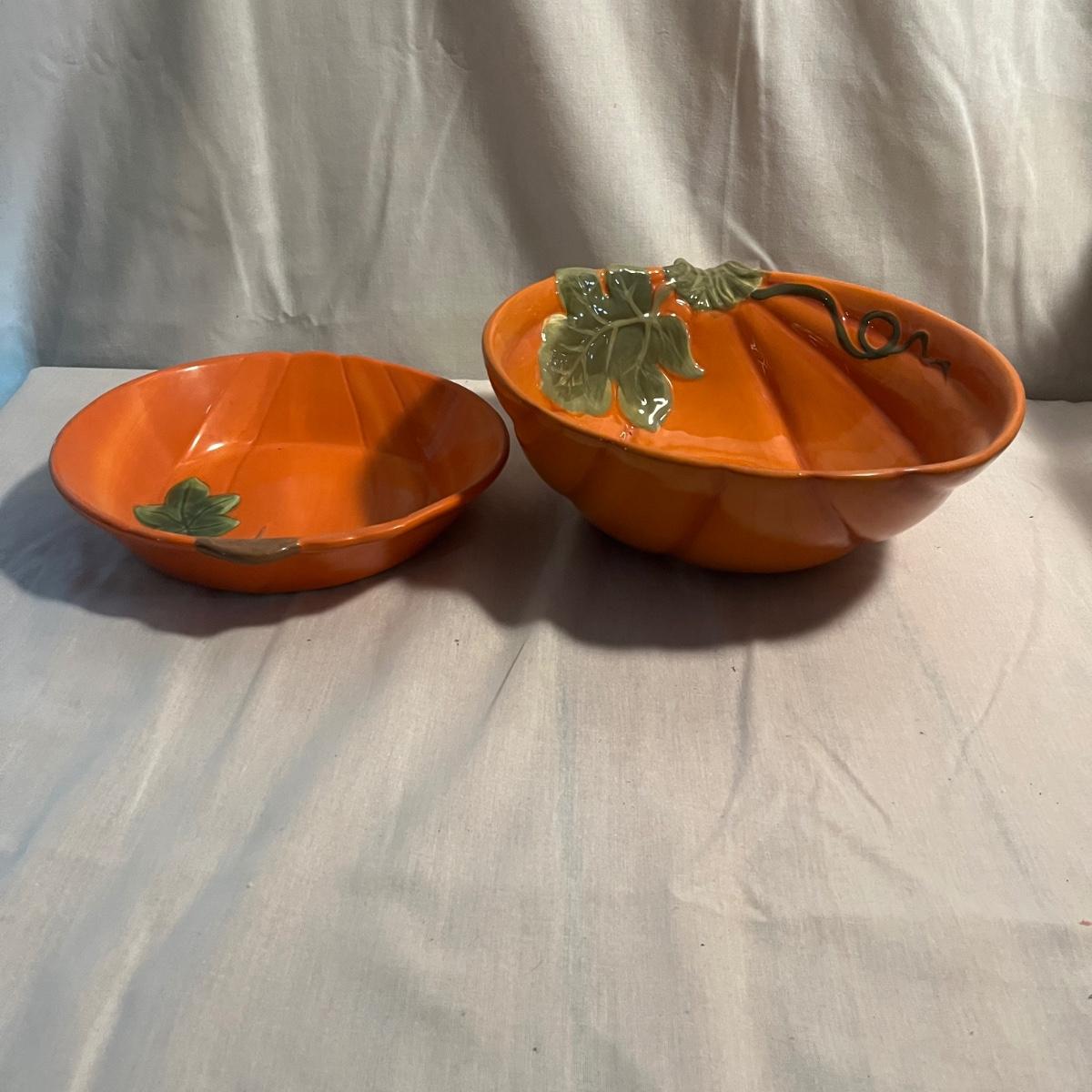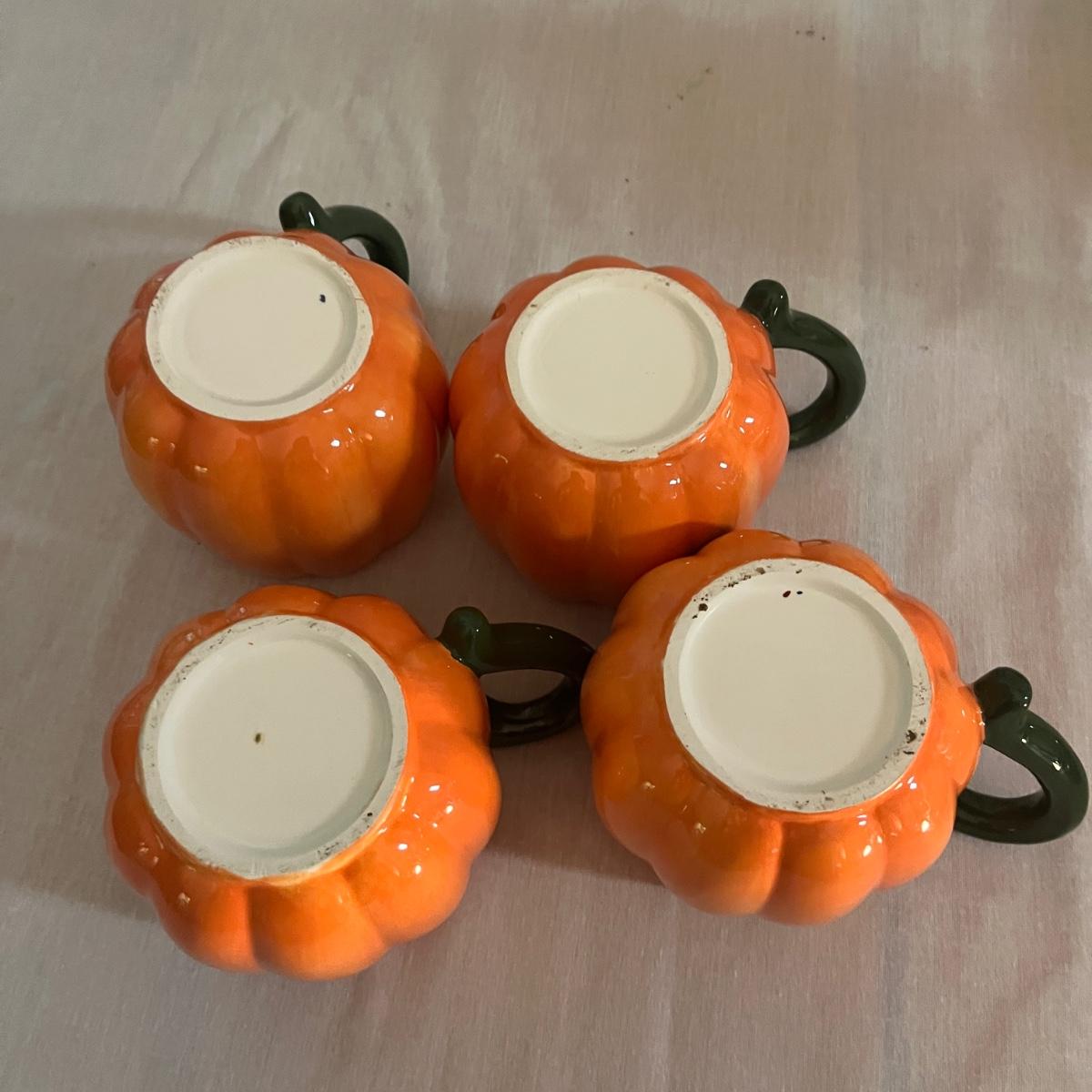 Lot includes 12 ceramic Halloween design plates, four mugs, a clear glass jar and three ceramic pumpkin bowls. The largest pumpkin bowl measures 12”D x 4.5”H. Please see photos for brand names and details.