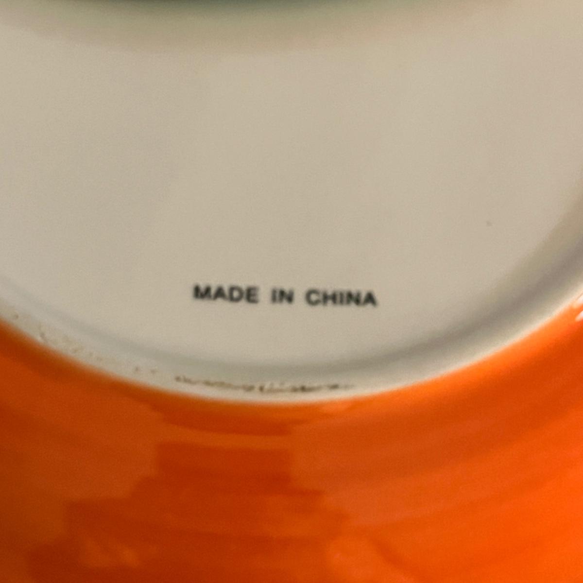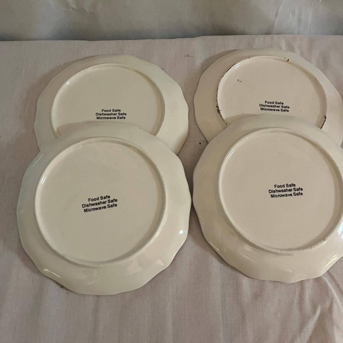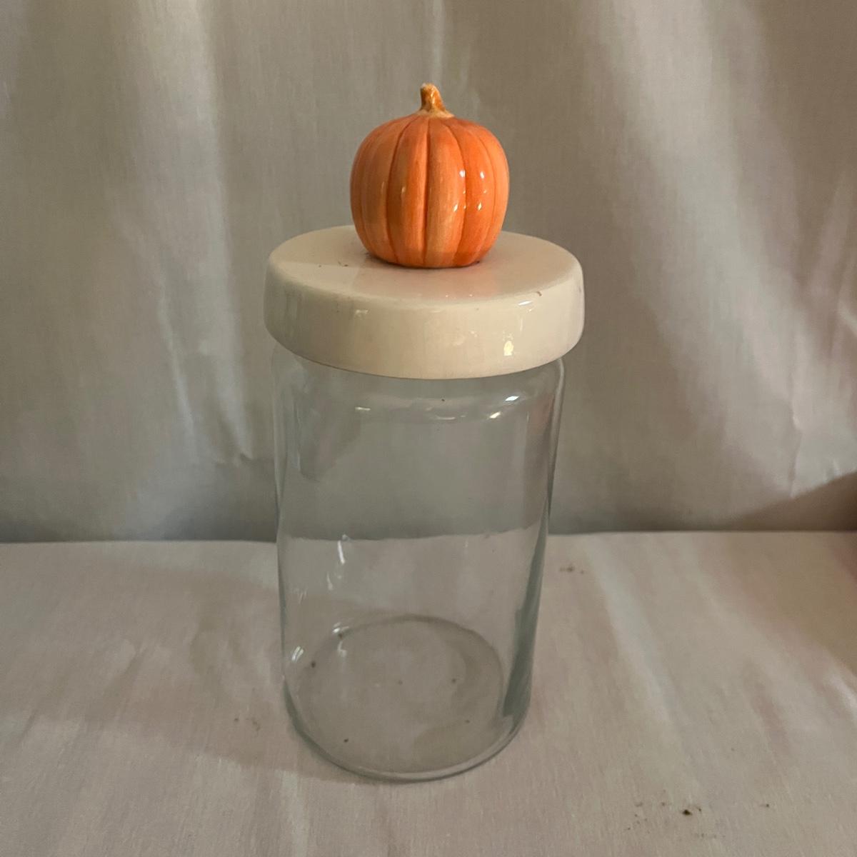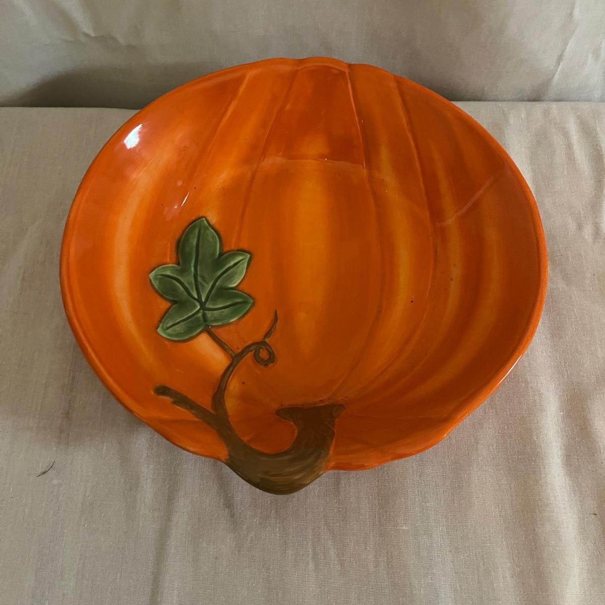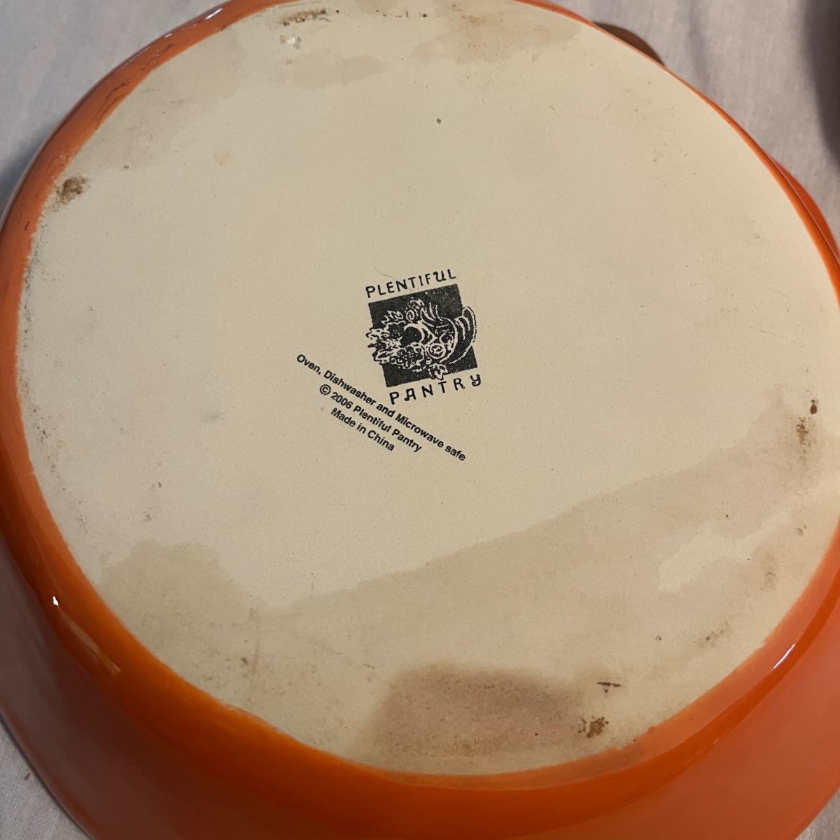 Lot includes 12 ceramic Halloween design plates, four mugs, a clear glass jar and three ceramic pumpkin bowls. The largest pumpkin bowl measures 12”D x 4.5”H. Please see photos for brand names and details.