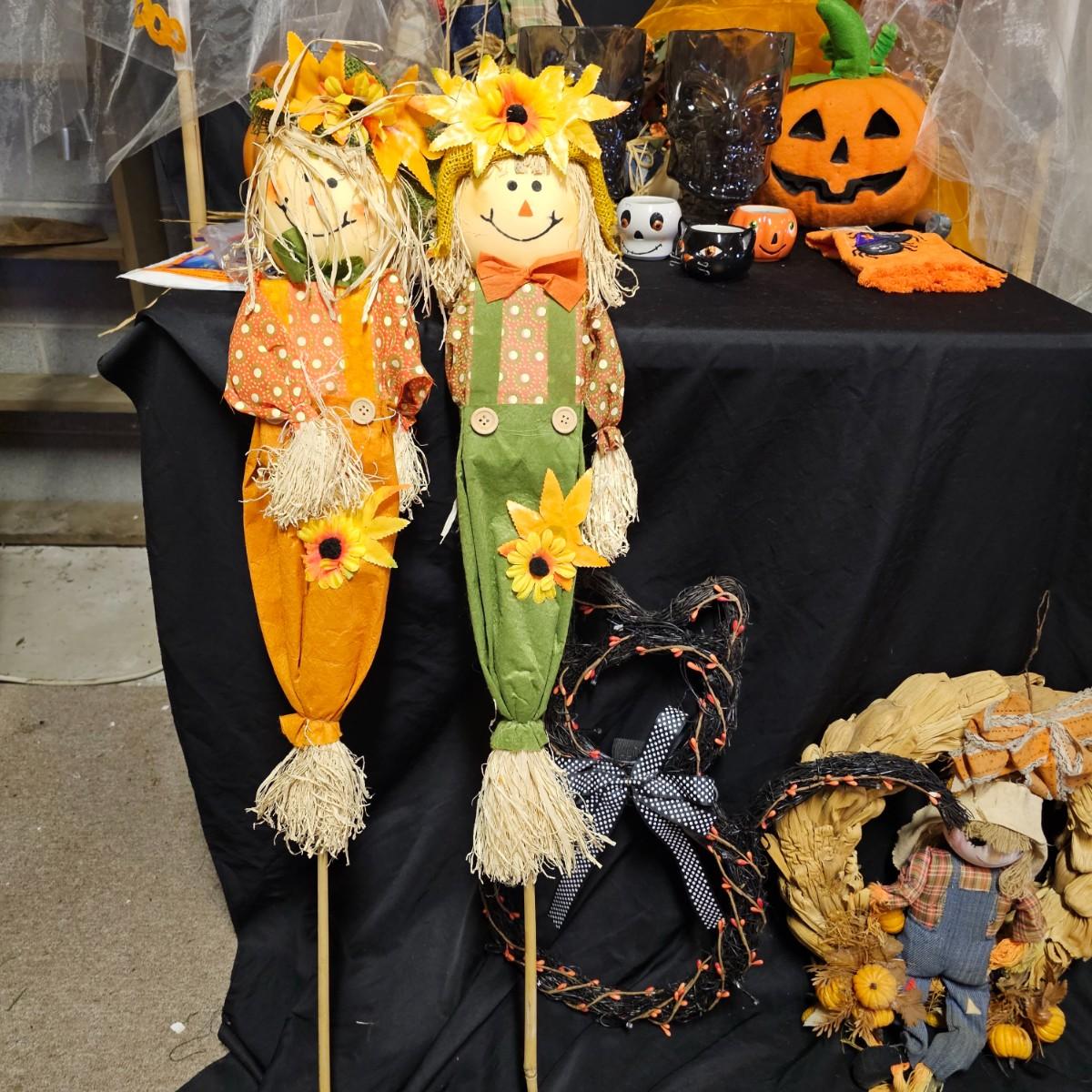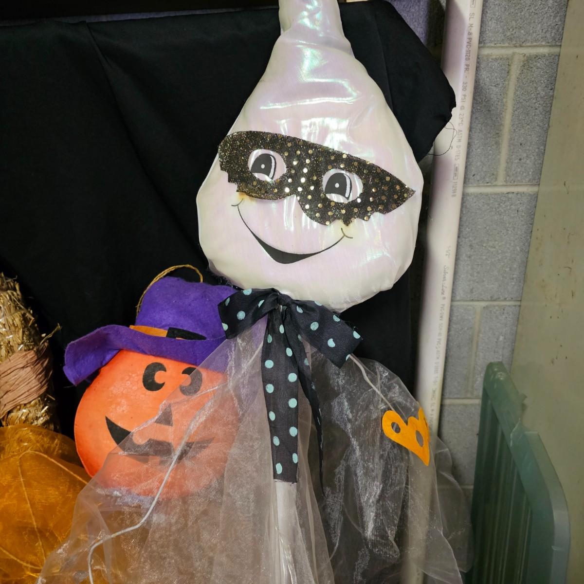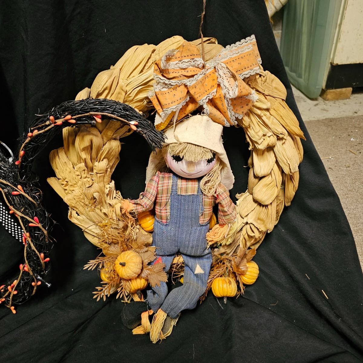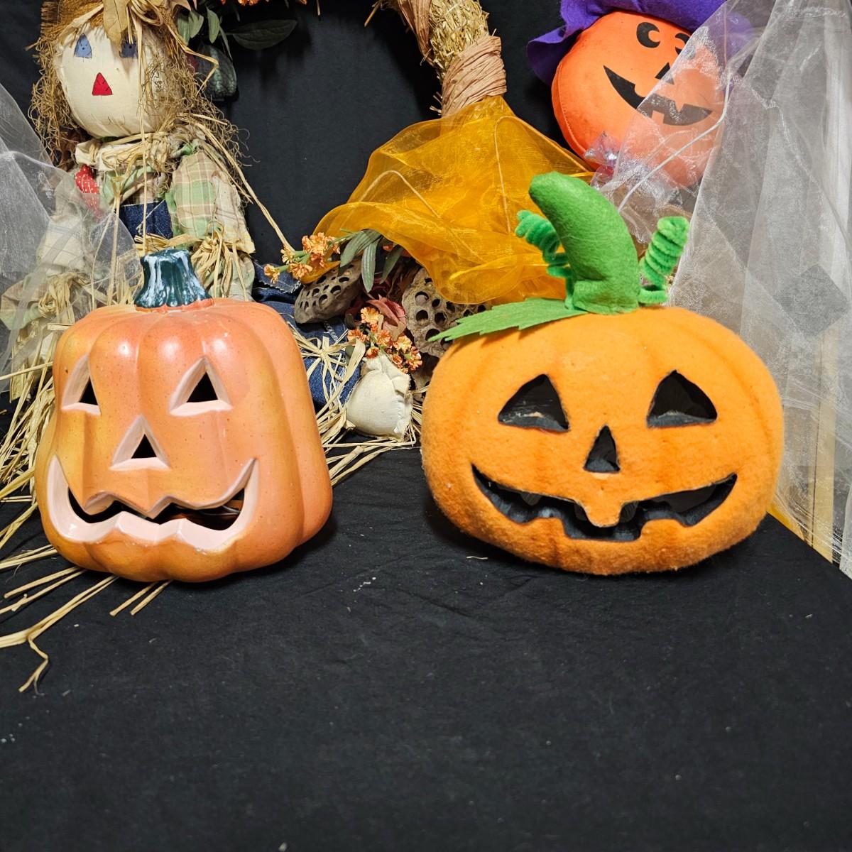 Several fun items for fall and Halloween decorating. Pumpkins, candles, wreaths, yard decor and more. Tall ghost figures are 24" x 64" h, larges wreath is 24" dia and small wreath is 14" dia. Pumpkins power on, are battery operated, not included. Two plastic skeleton pitchers with handles. See photos for details. Local pickup only.