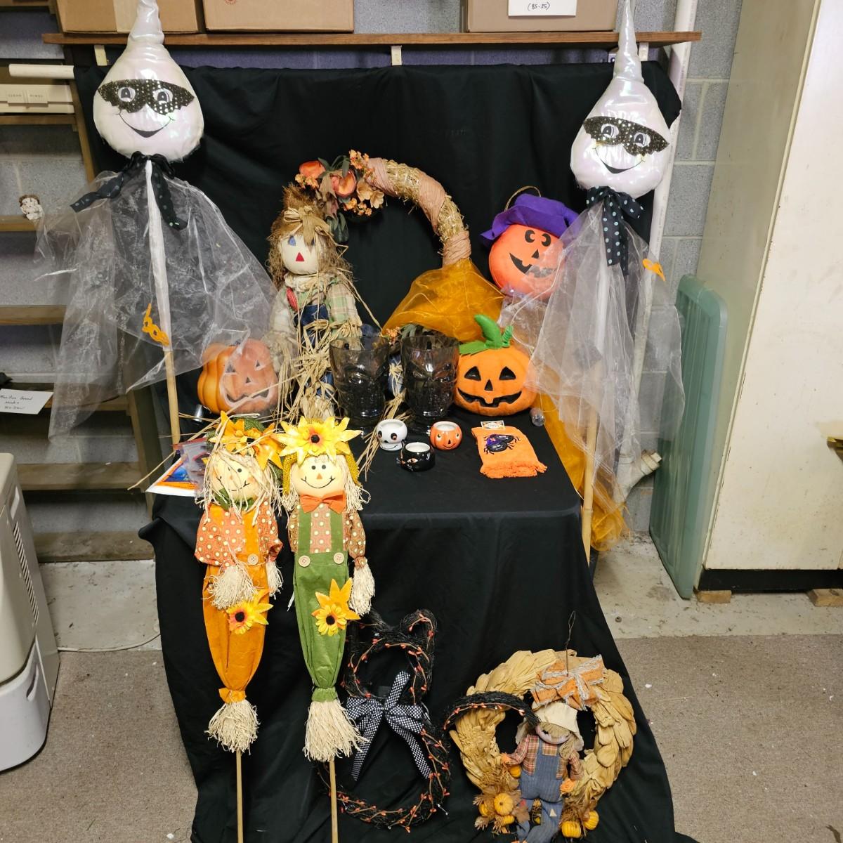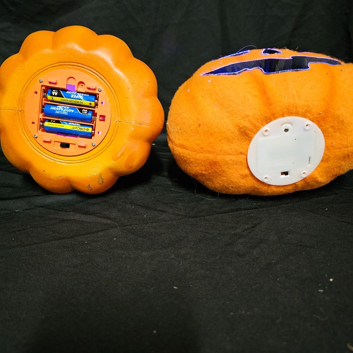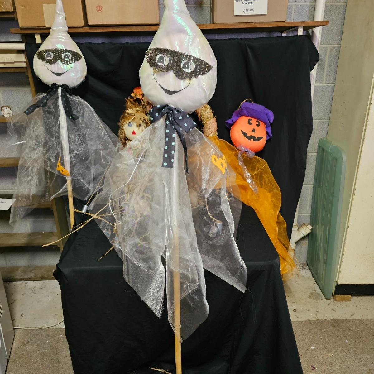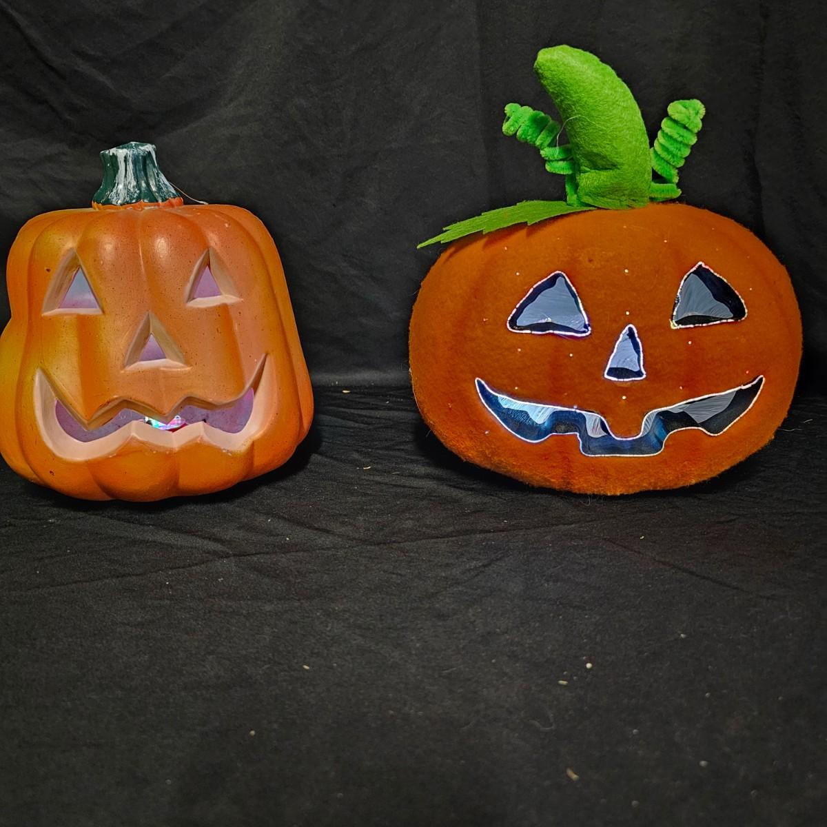 Several fun items for fall and Halloween decorating. Pumpkins, candles, wreaths, yard decor and more. Tall ghost figures are 24" x 64" h, larges wreath is 24" dia and small wreath is 14" dia. Pumpkins power on, are battery operated, not included. Two plastic skeleton pitchers with handles. See photos for details. Local pickup only.