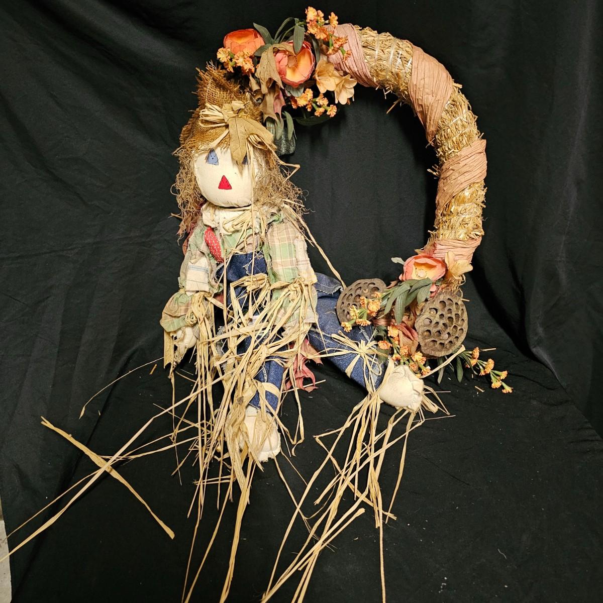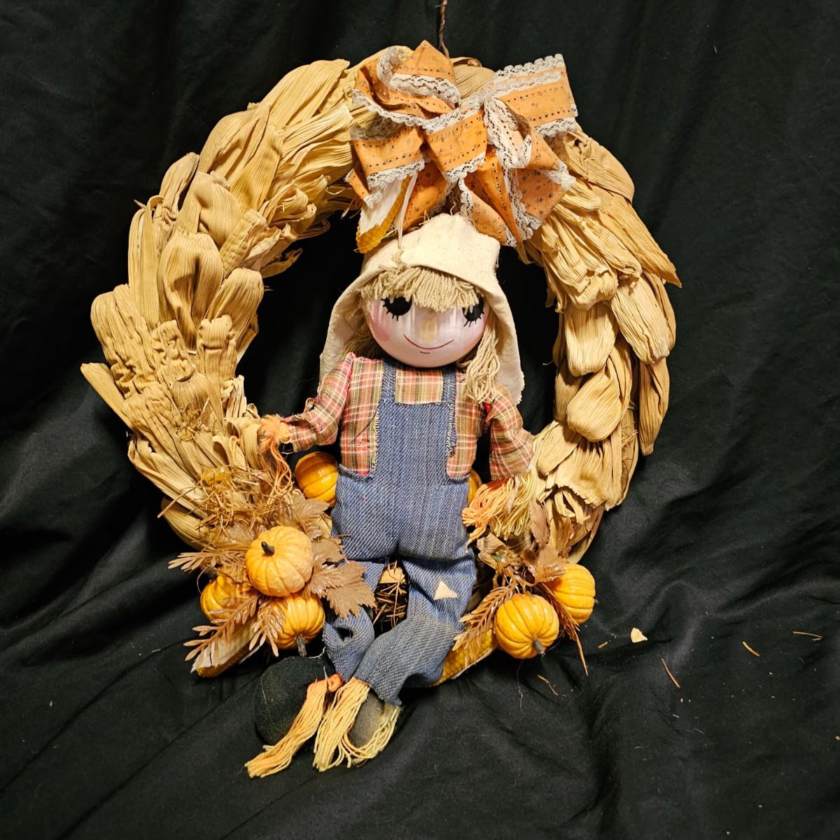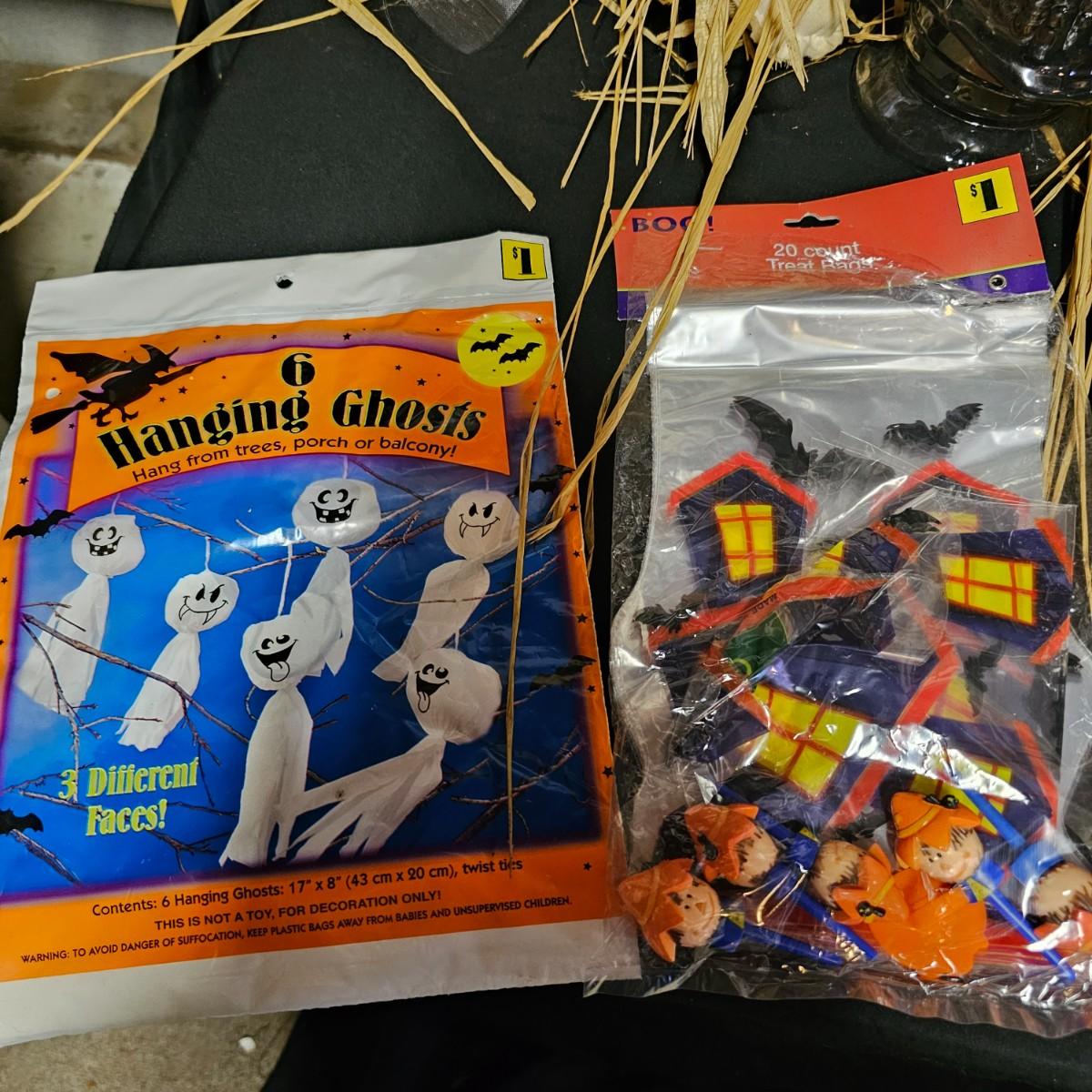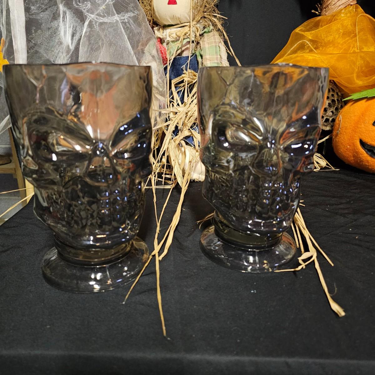 Several fun items for fall and Halloween decorating. Pumpkins, candles, wreaths, yard decor and more. Tall ghost figures are 24" x 64" h, larges wreath is 24" dia and small wreath is 14" dia. Pumpkins power on, are battery operated, not included. Two plastic skeleton pitchers with handles. See photos for details. Local pickup only.