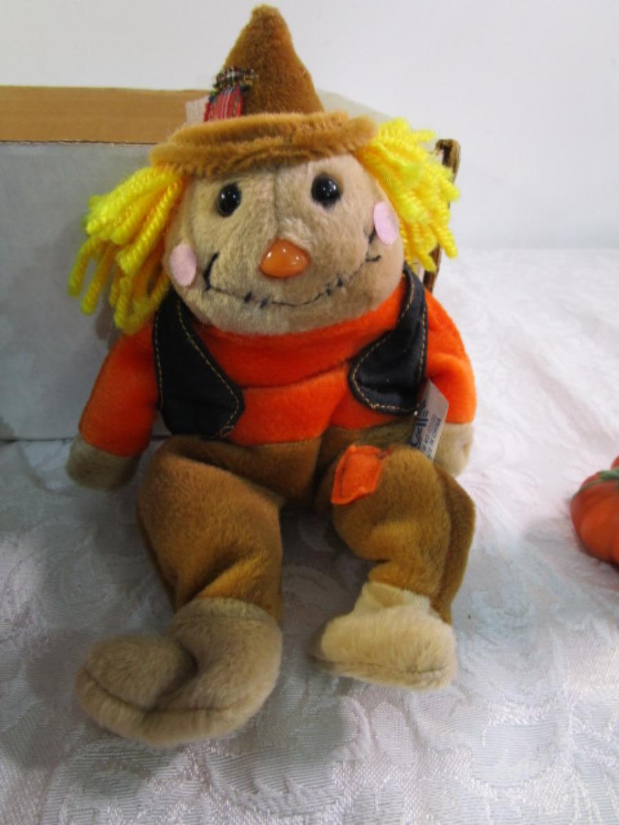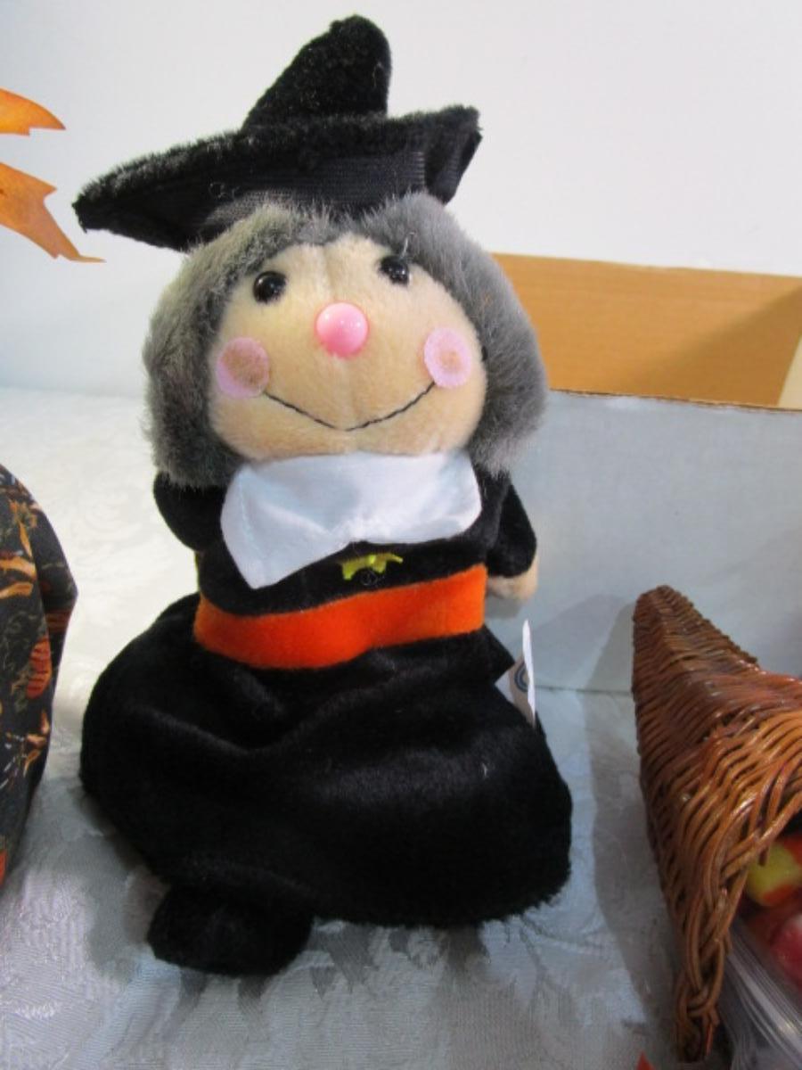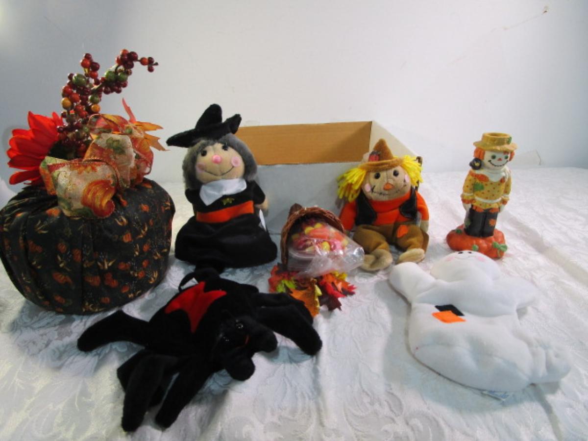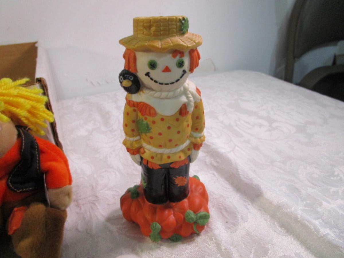 Scarecrow, witch bat ghost, cornucopia, fabric pumpkin, Hallmark scarecrow candle holder, see pictures