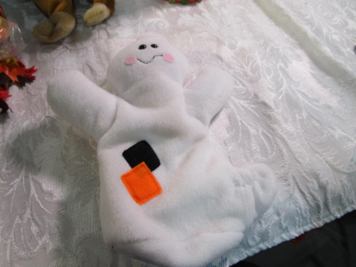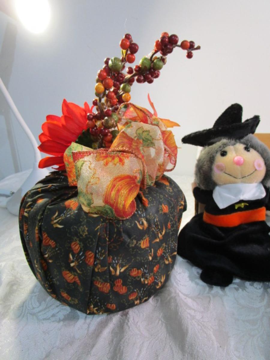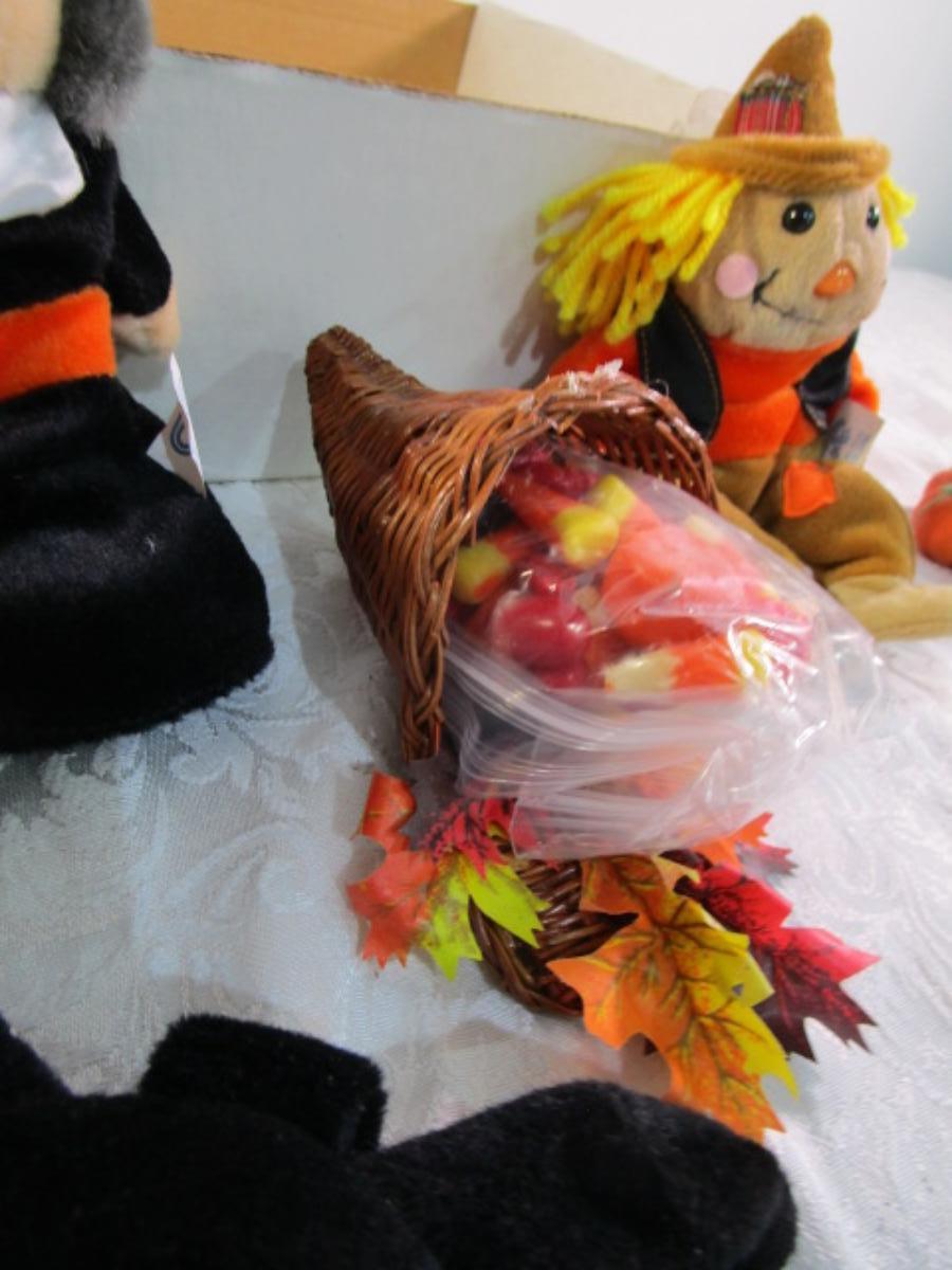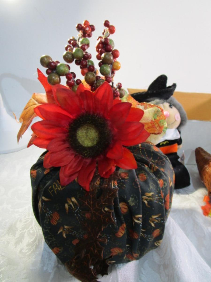 Scarecrow, witch bat ghost, cornucopia, fabric pumpkin, Hallmark scarecrow candle holder, see pictures