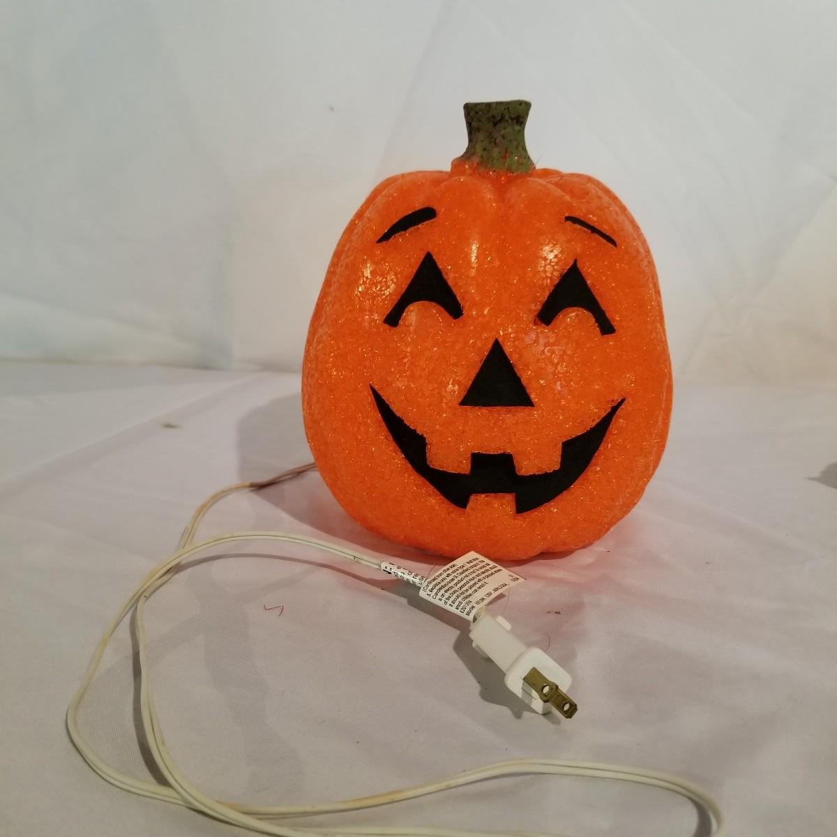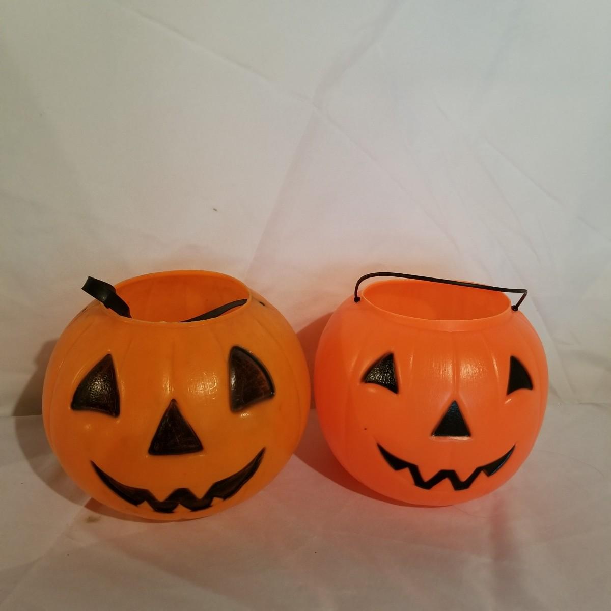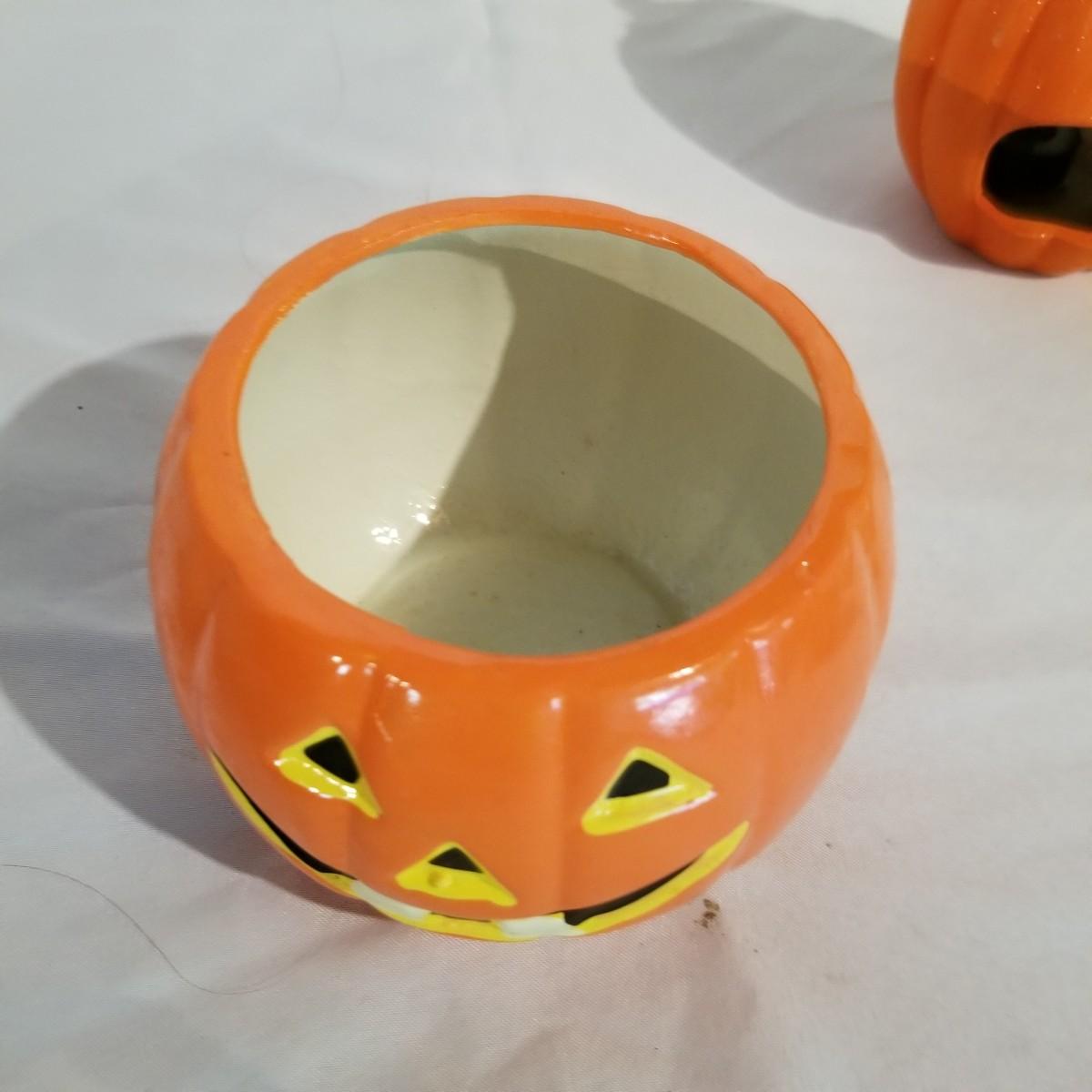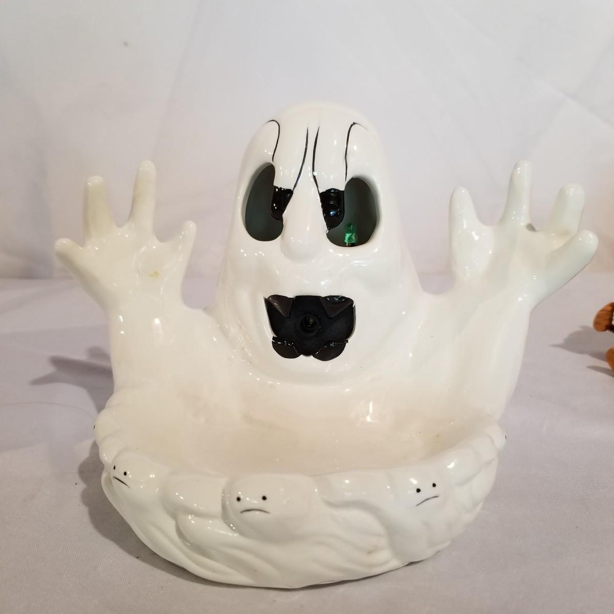 A slightly scary collection of Halloween items. Two handled plastic trick or treat buckets, a pumpkin candy bowl/tray, two ceramic pumpkins, a plug in LED lit pumpkin (turned on when tested). And also one ghostly ghost candy dish with scary eyes and sound; unable to test as it most likely requires new batteries. See photos for details. Shipping available.