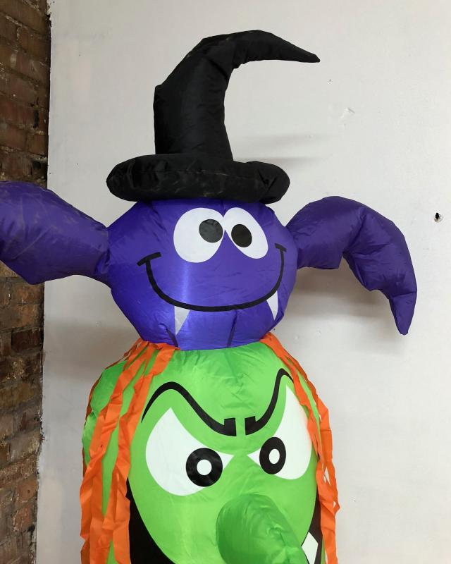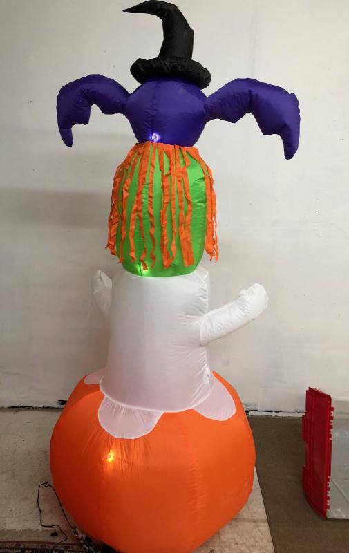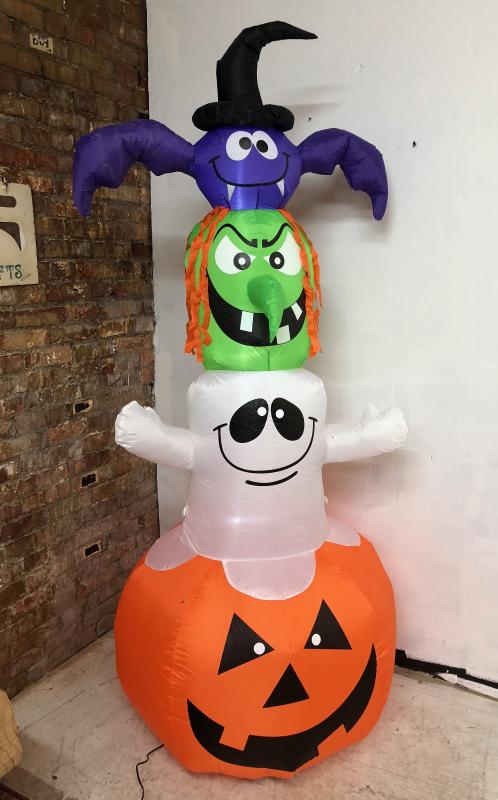 88" tall inflatable totem pole of cartoon figures...A ghost..a witch and a vampire bat atop a jack 'o lantern pumpkin...This Halloween display is in excellent condition...