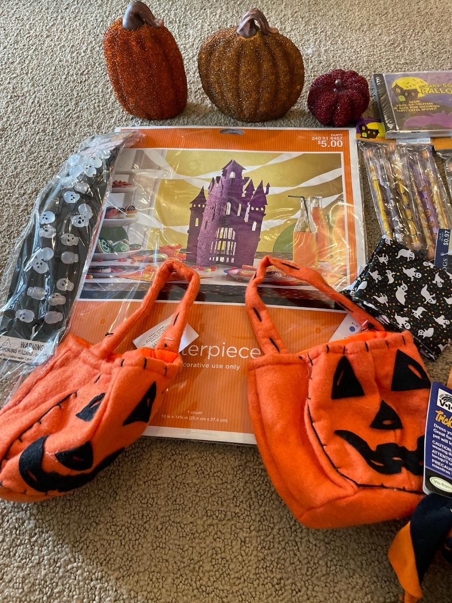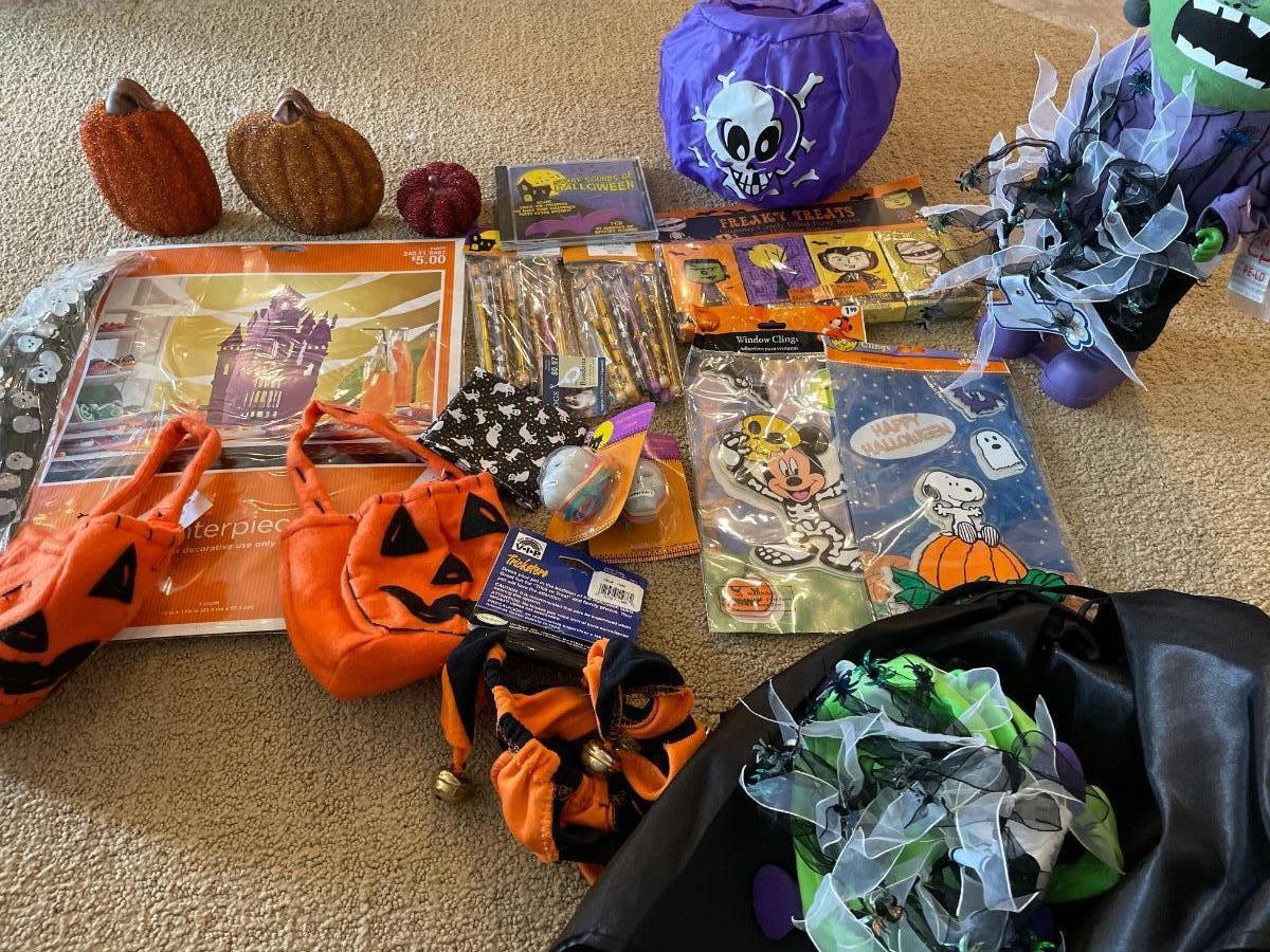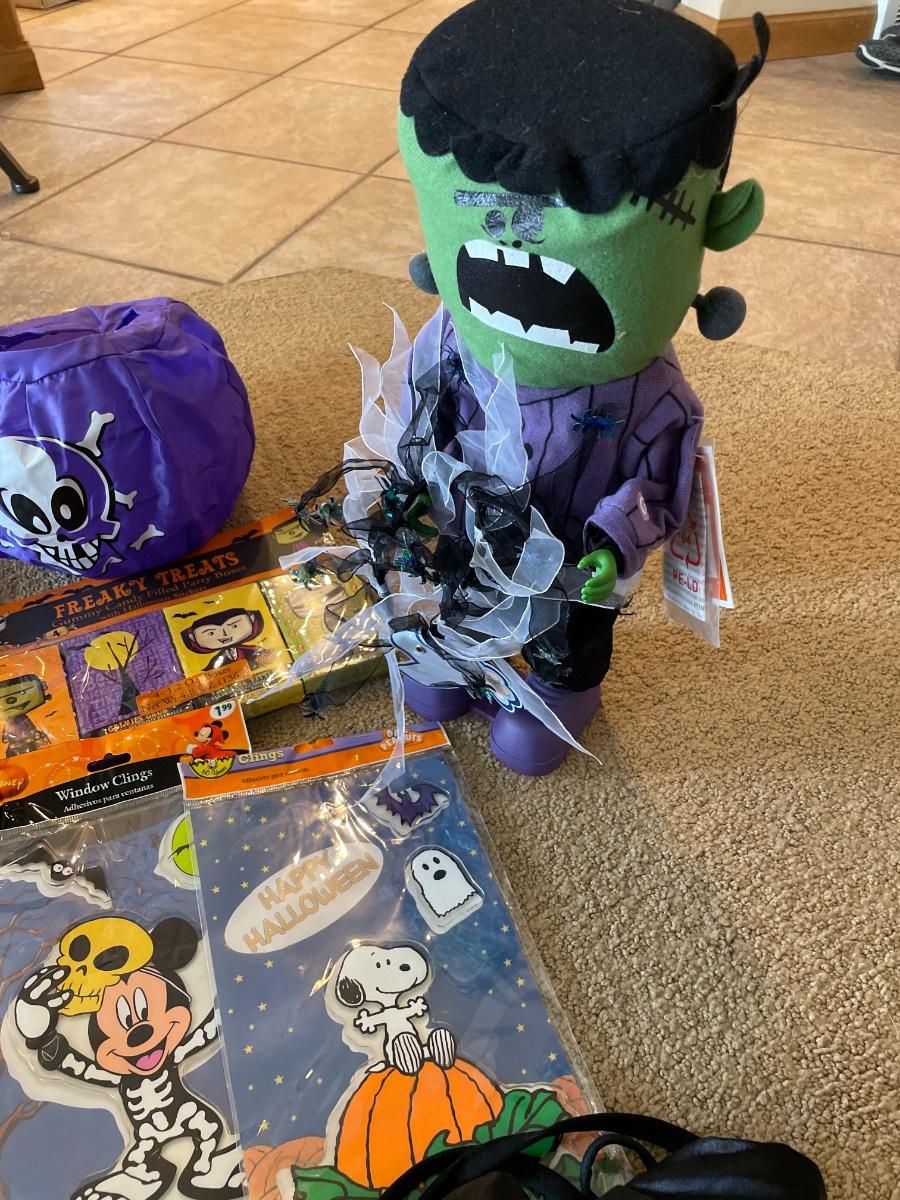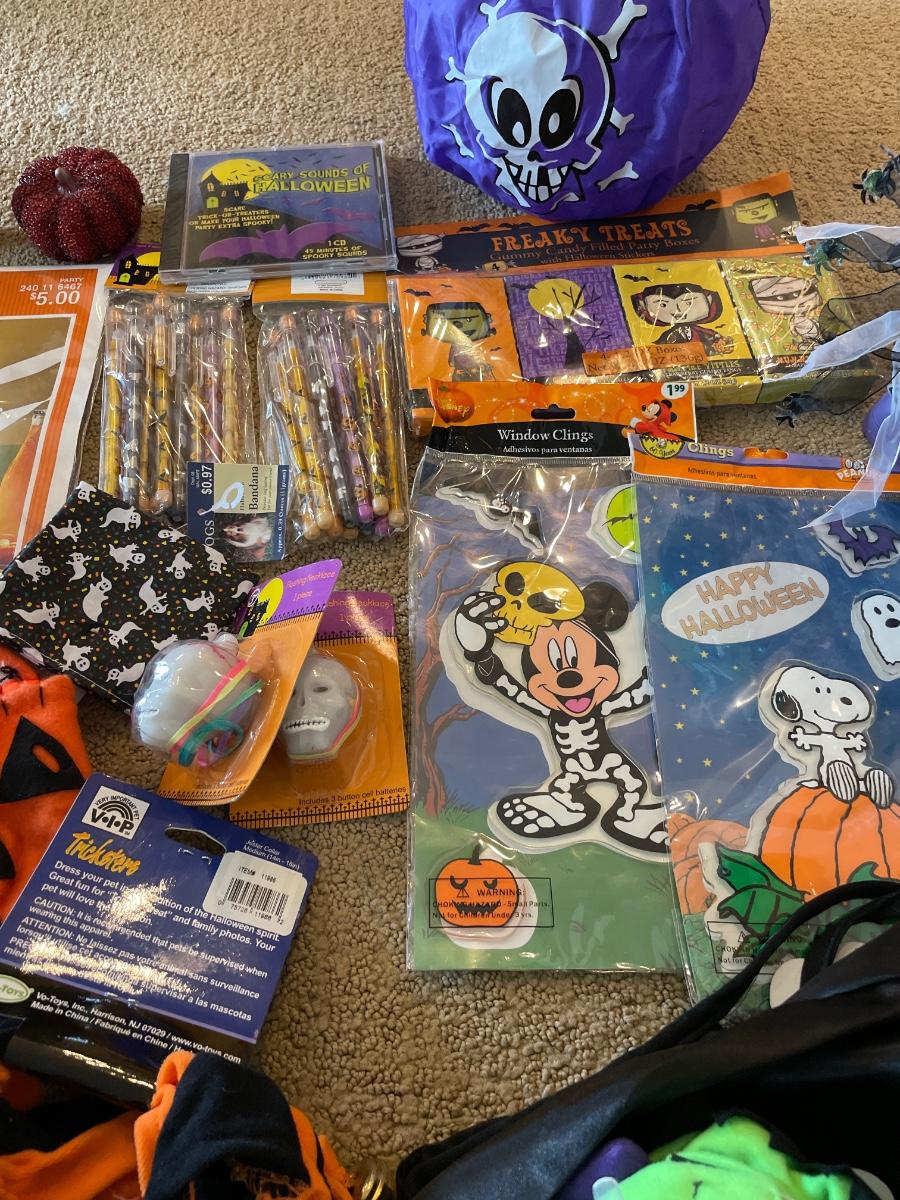 Includes dog costumes, trick-or-treat baskets, pumpkins, goodie bag items, and dancing Frankenstein. All new with tags