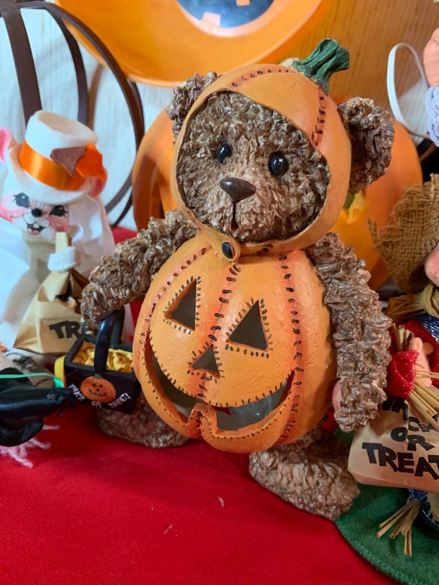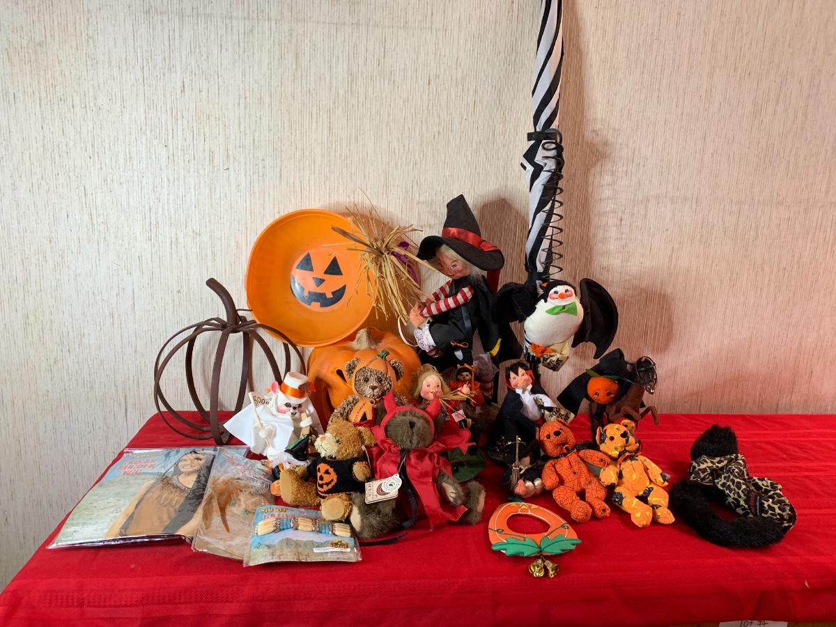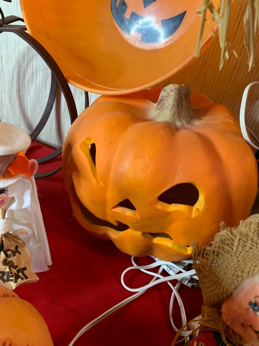 Misc halloween items including decor pumpkins and figurines along with one iron pumpkin and misc costume pieces