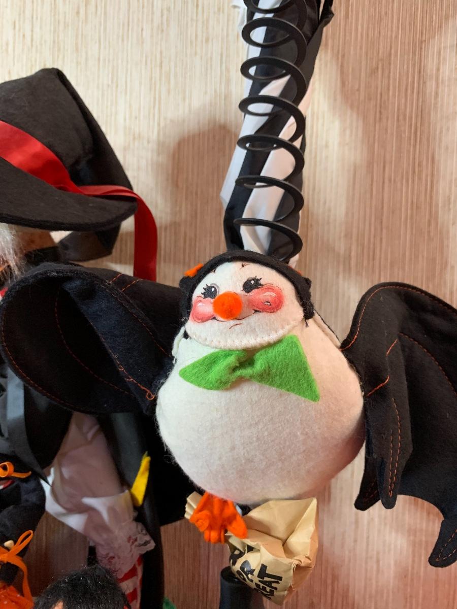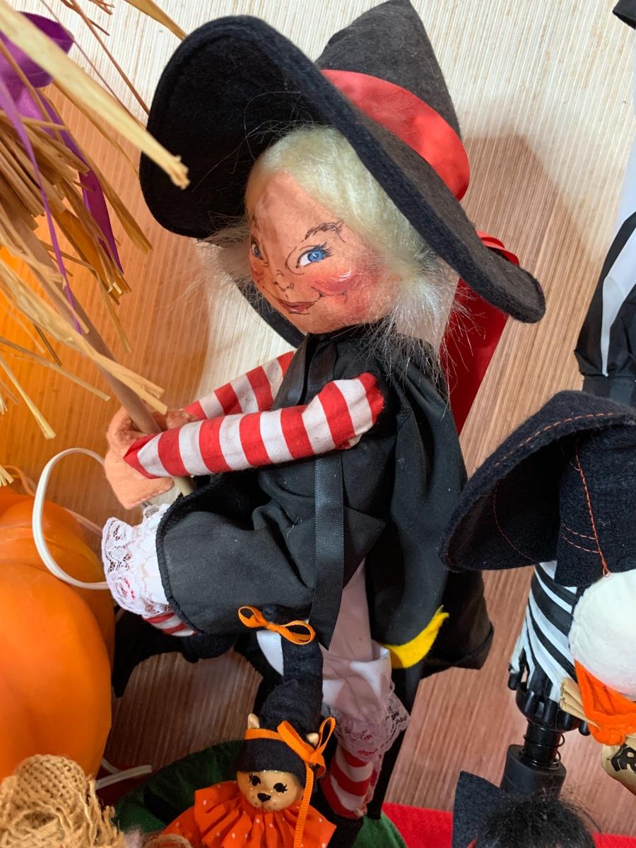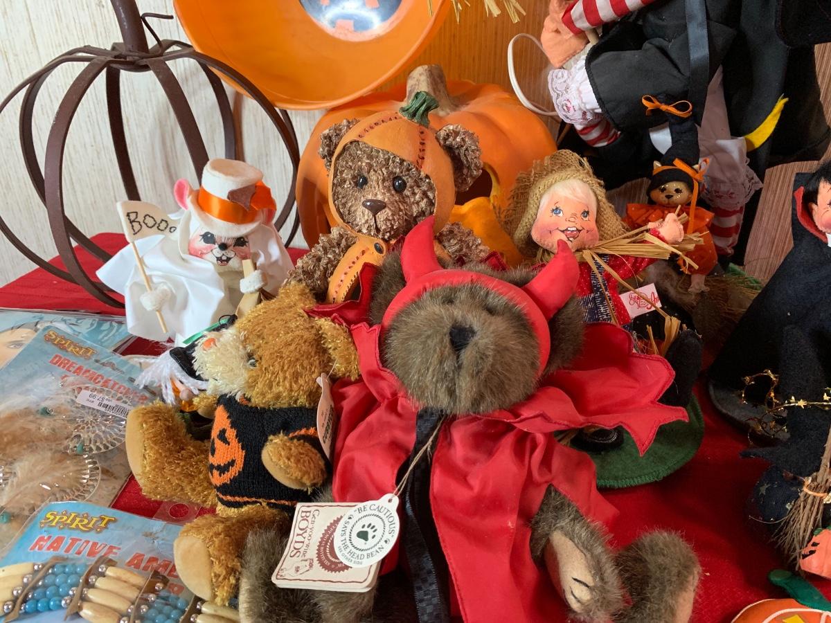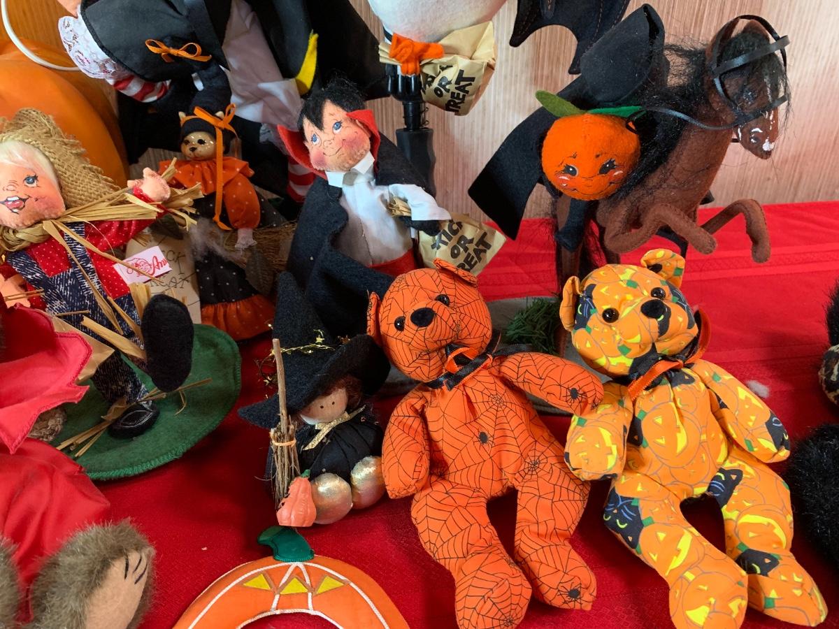 Misc halloween items including decor pumpkins and figurines along with one iron pumpkin and misc costume pieces