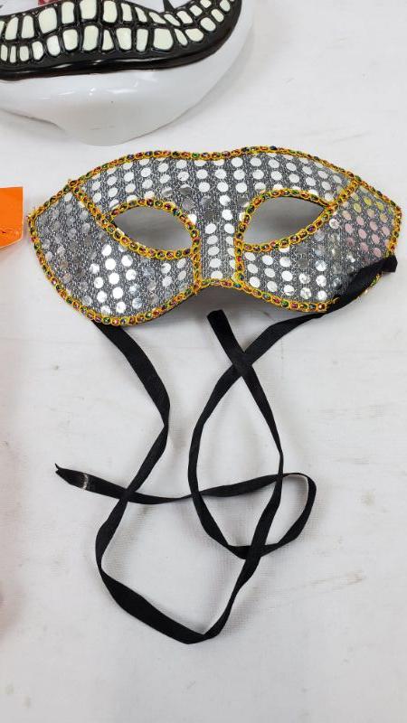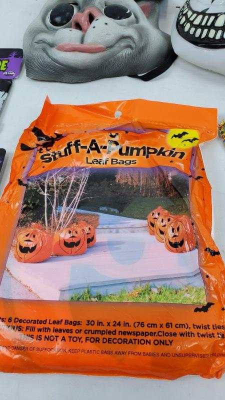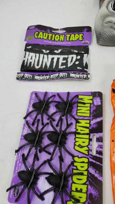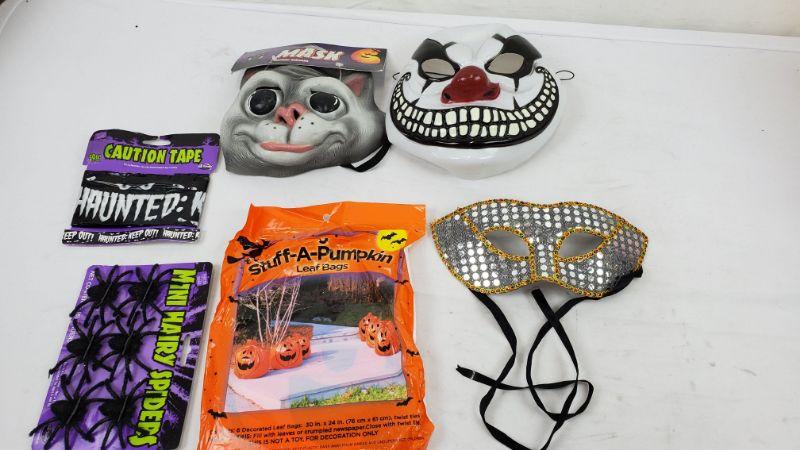 Halloween Lot, Cat & Clown Mask/Caution Tape/Spiders/Pumpkin Leaf Bags/Masquerade Mask - New