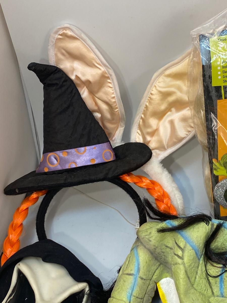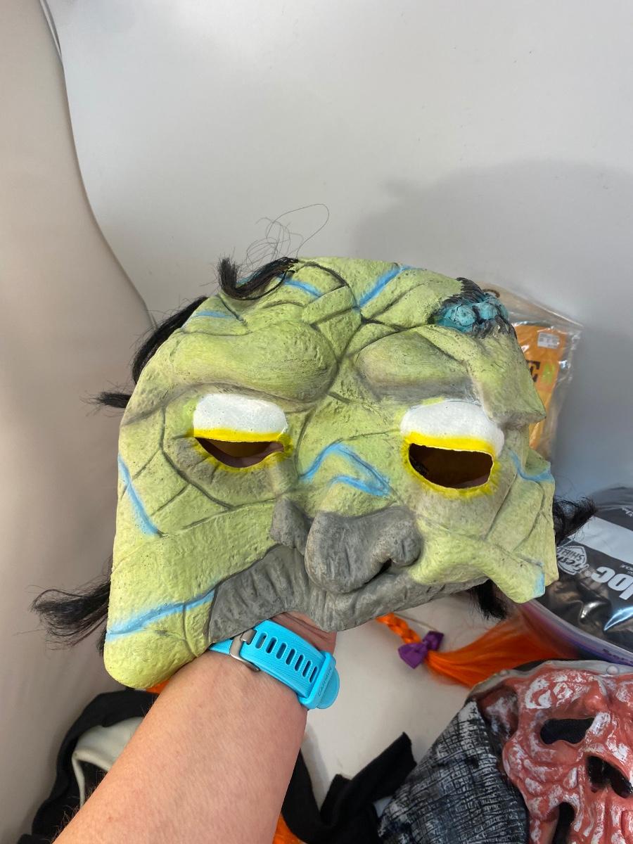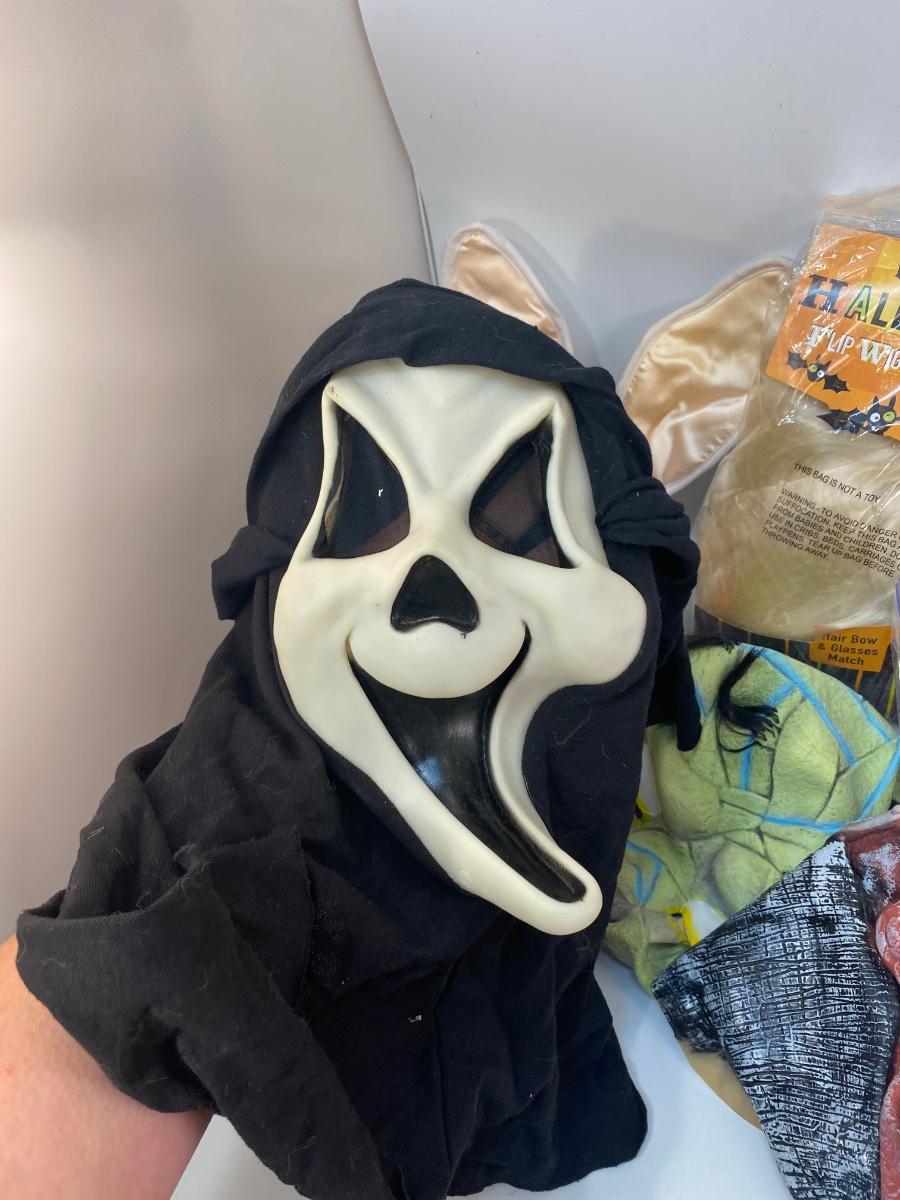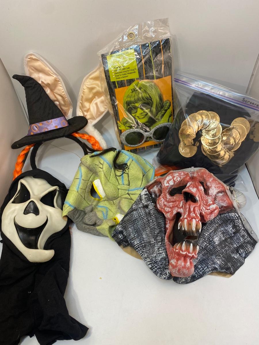 Halloween Mask Costume Dress Up Lot. In good used condition. Three masks, wig, headbands, and a costume.
