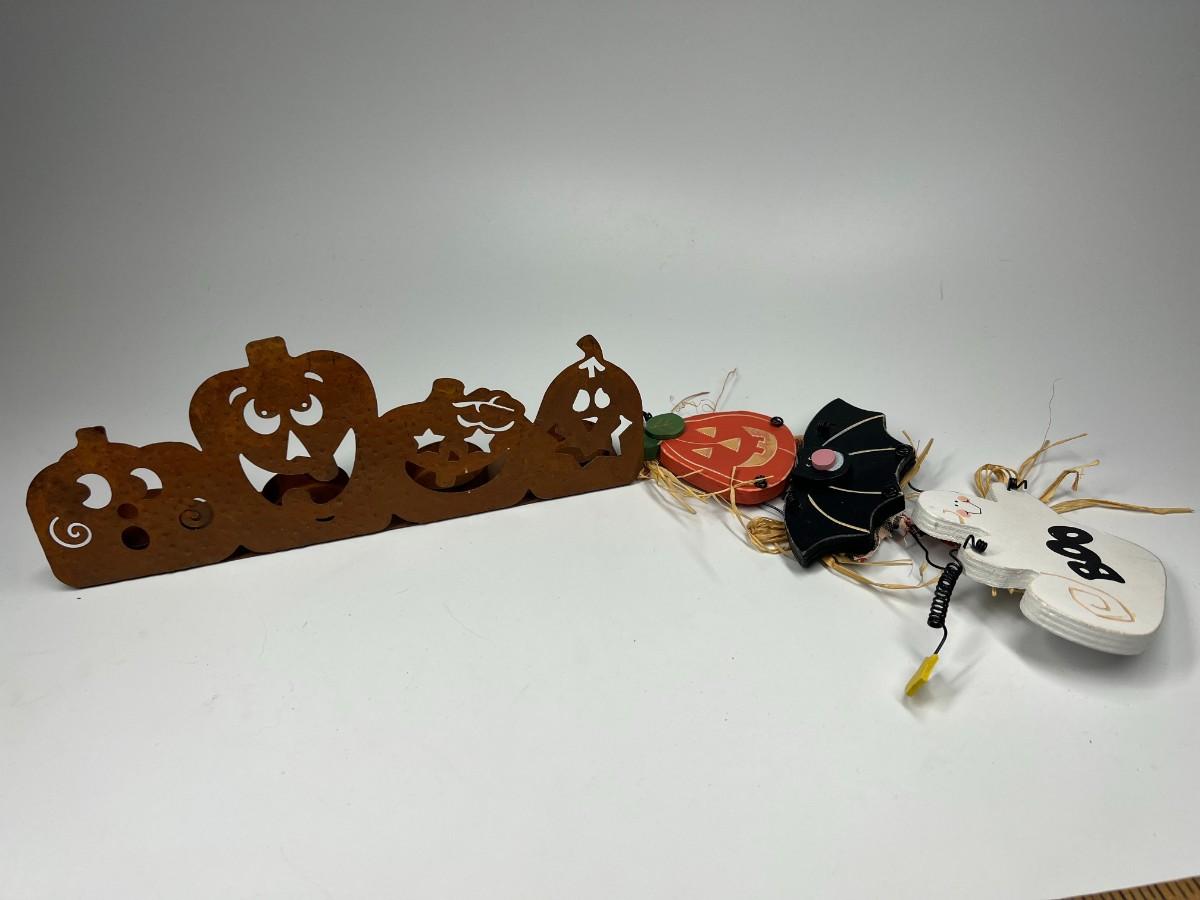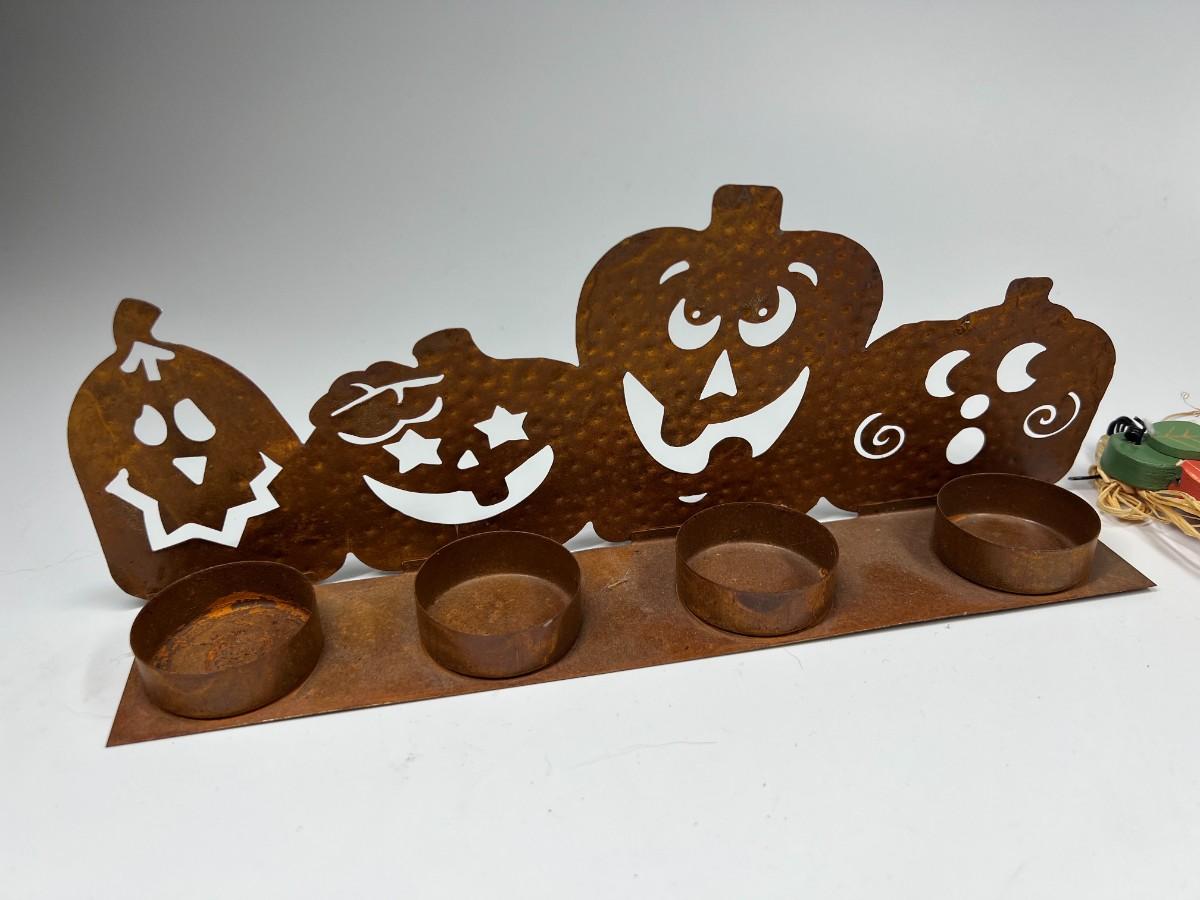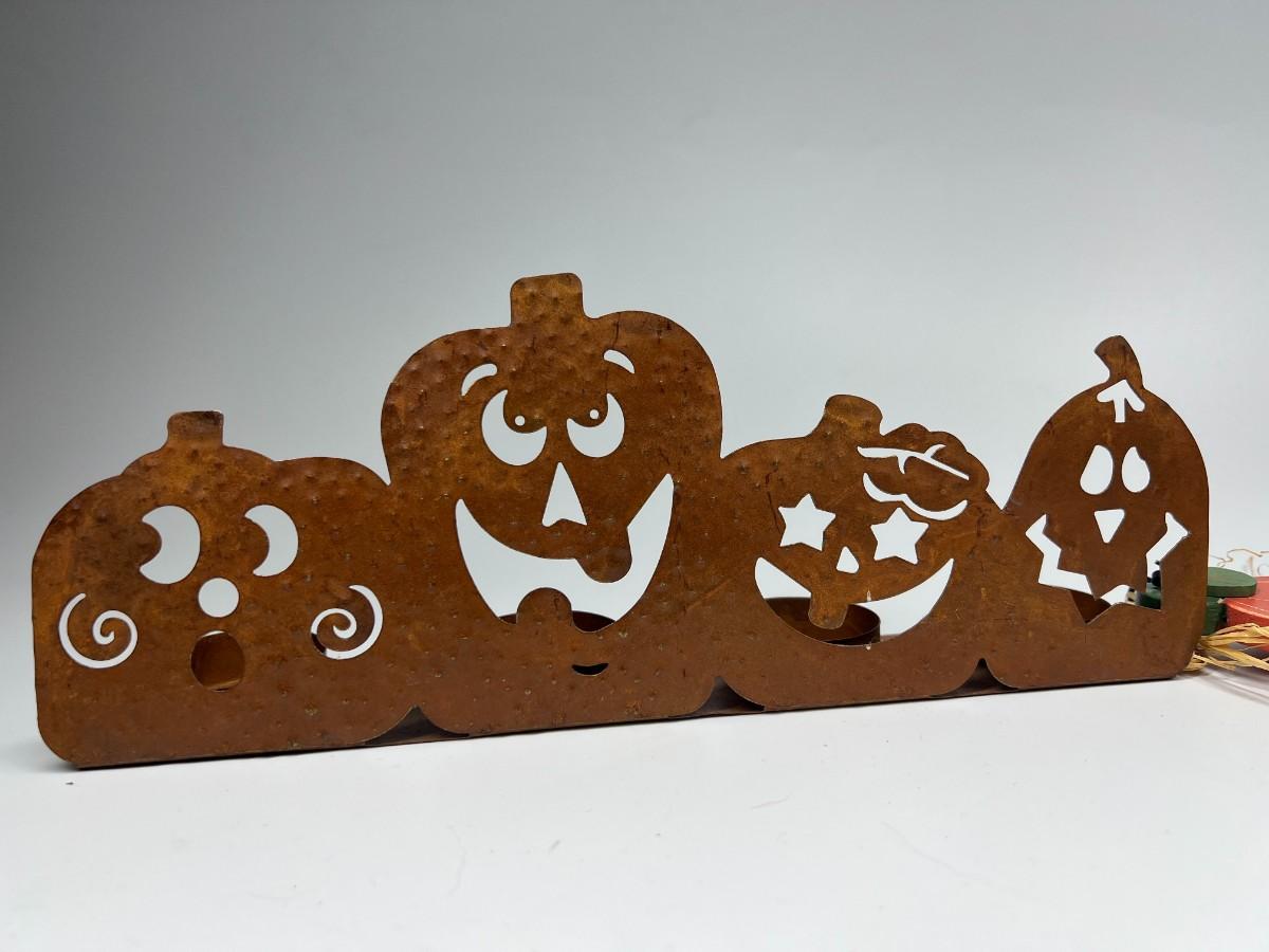 Halloween Pumpkin Metal Tin Light Candle Holder & Hanging Wood Display