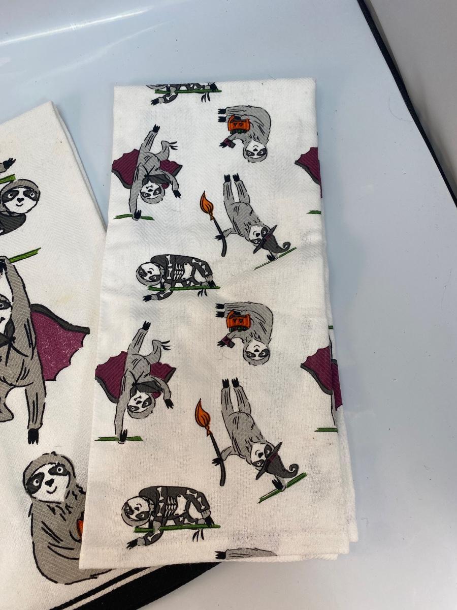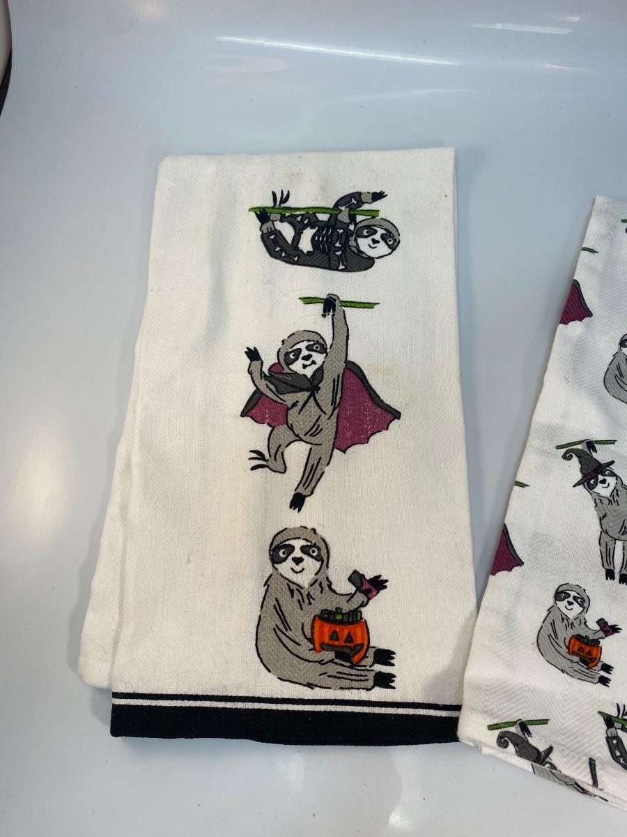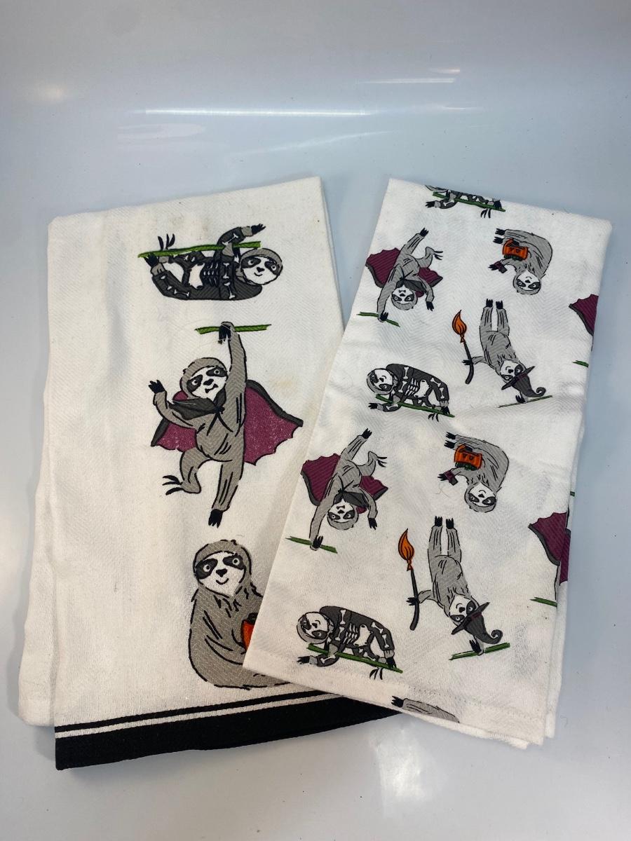Halloween Seasonal Sloth Dish Towel Set. Previously used, may have a light spot or two.
