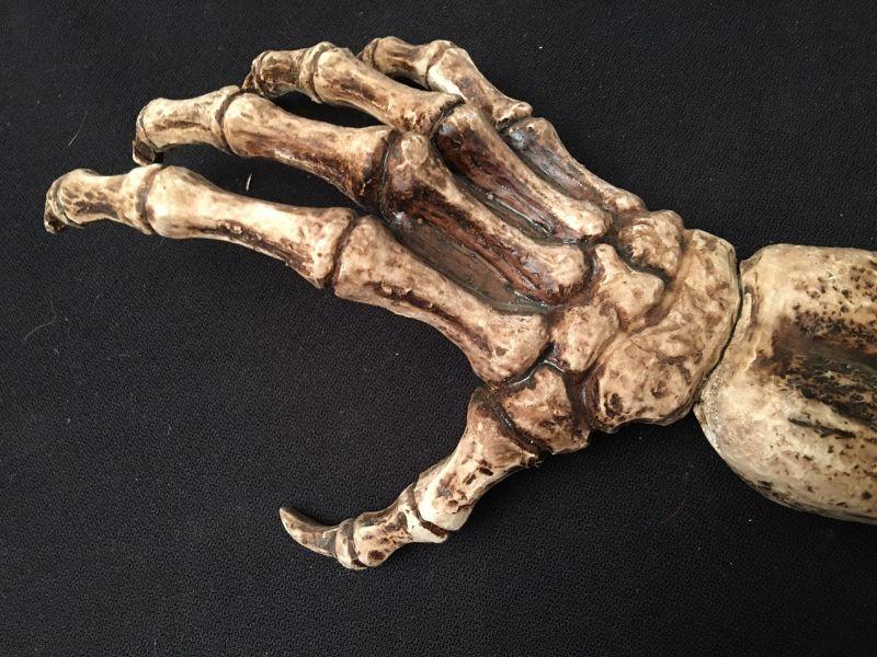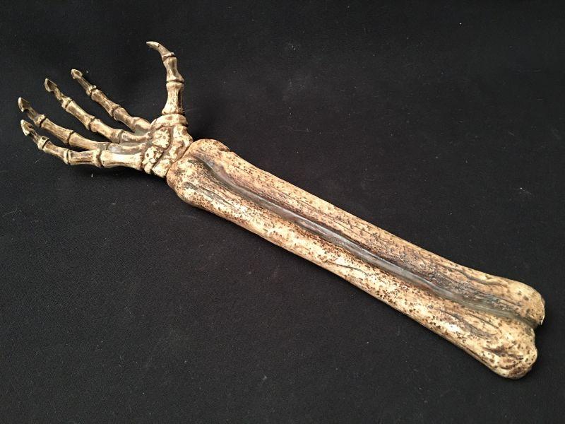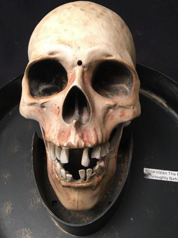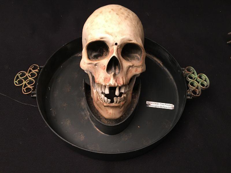 Measurements: Tray: 10.5 inches diam / 1.75 inches deep. Skull life size. Forearm and hand: 19 inches.