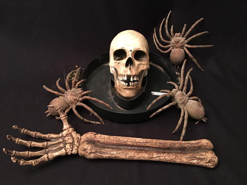 Description: The subject item is a lot of Halloween accessory decoration including a skull-on-a -platter, a skeletal forearm, and 3 large life-like rubber spiders.