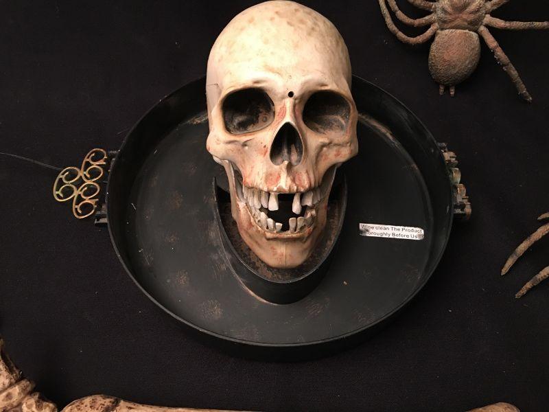 Halloween Skull serving platter w battery powered articulation, skeletal arm & 3 giant spiders.