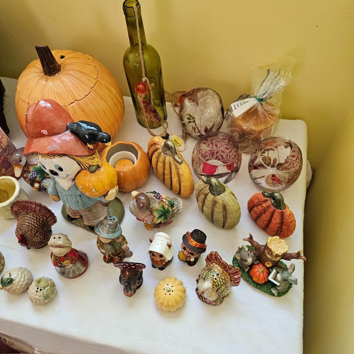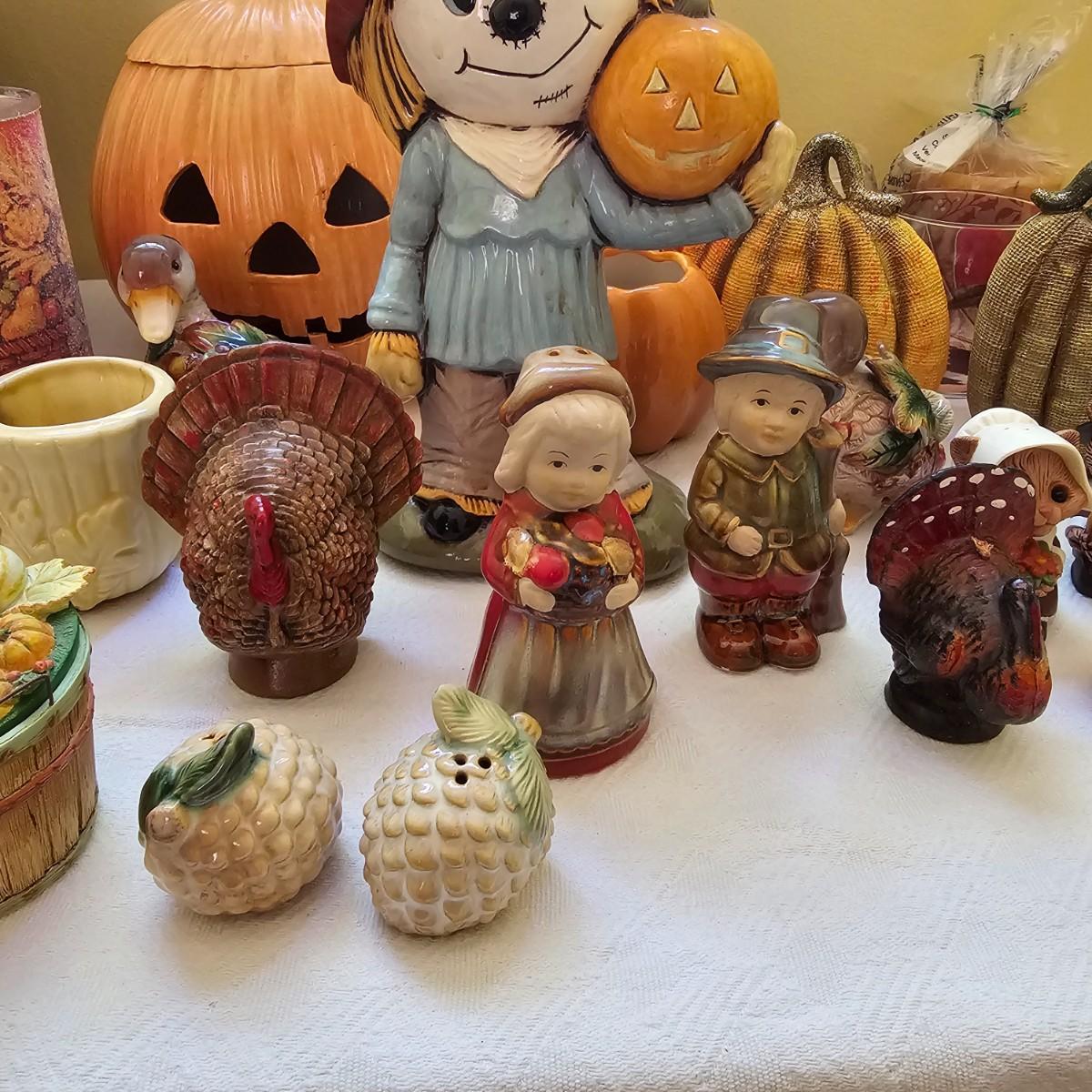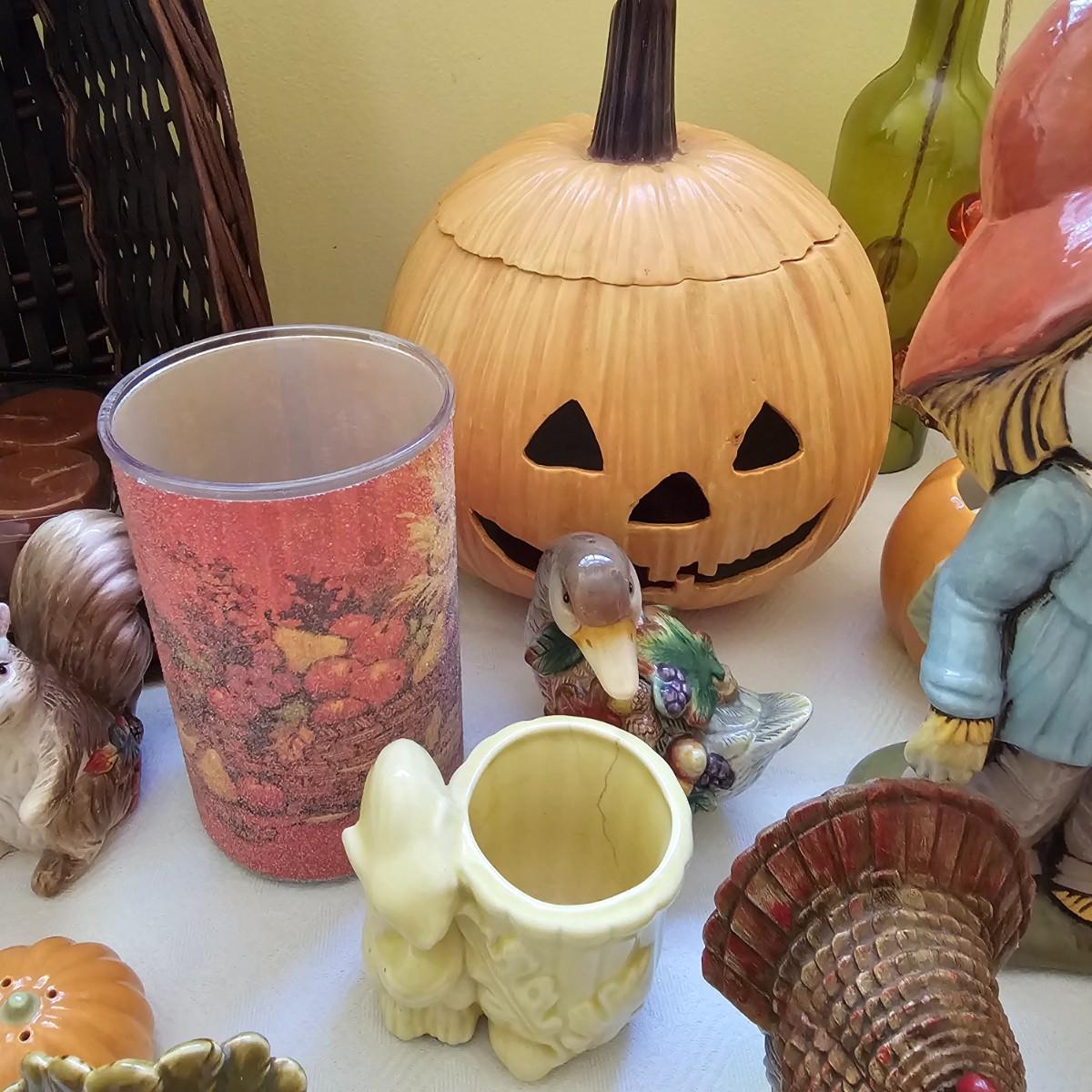 Multiple items to decorate for the holidays. Halloween decor includes pumpkins, scarecrow and more. Thanksgiving items have turkeys, pilgrims, candles, plates, cute salt & pepper shakers in animal themes. Storage tub included. Scarecrow is 10"H, large white pumpkin measures 9"D. See photos for details. Shipping available.