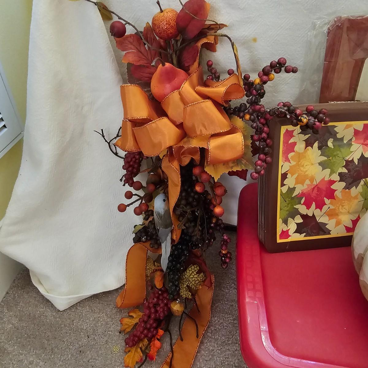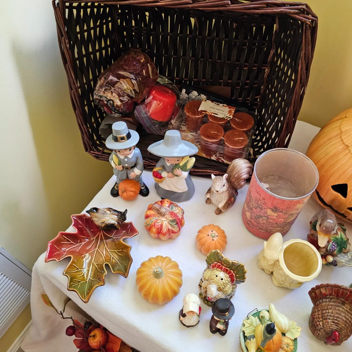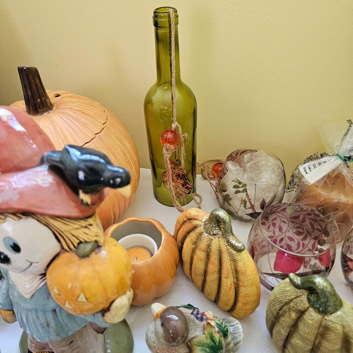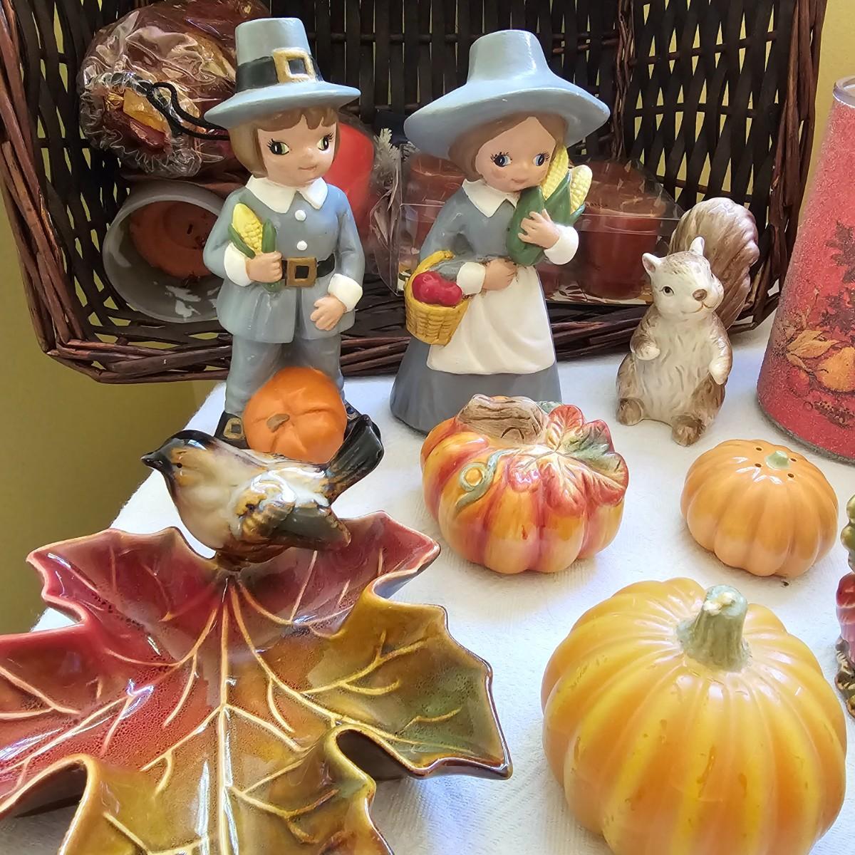 Multiple items to decorate for the holidays. Halloween decor includes pumpkins, scarecrow and more. Thanksgiving items have turkeys, pilgrims, candles, plates, cute salt & pepper shakers in animal themes. Storage tub included. Scarecrow is 10"H, large white pumpkin measures 9"D. See photos for details. Shipping available.
