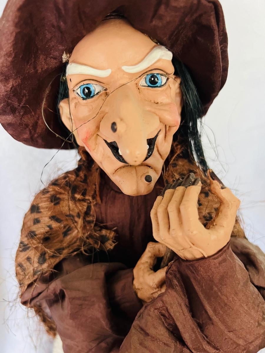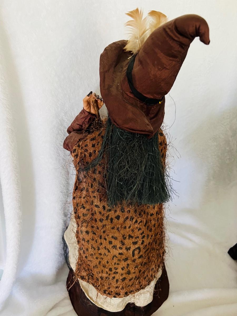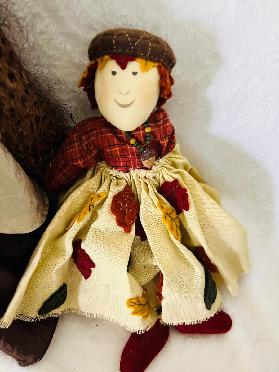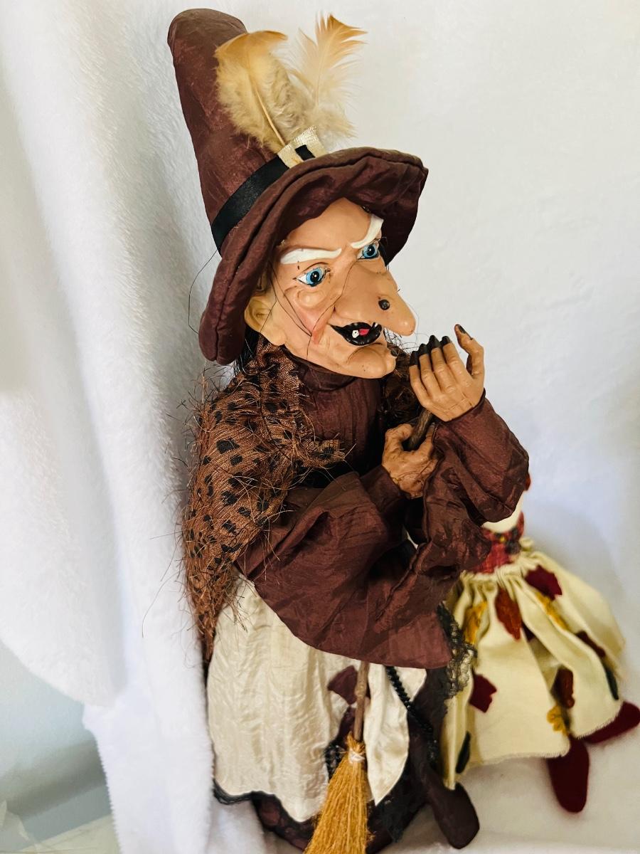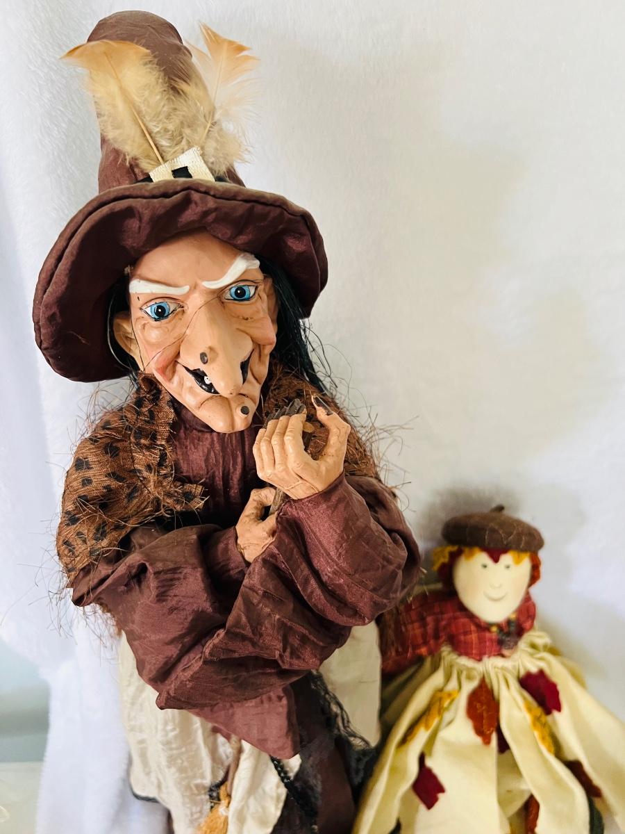 Scary witch has straw hair and broom and measures 17”H. Cute autumn rag doll also included.