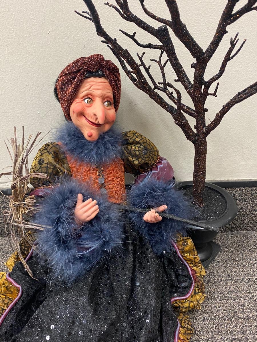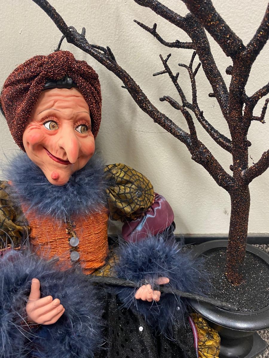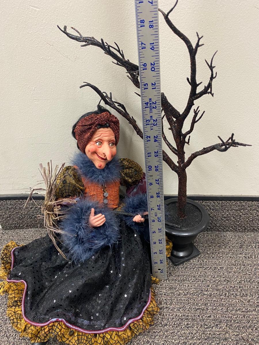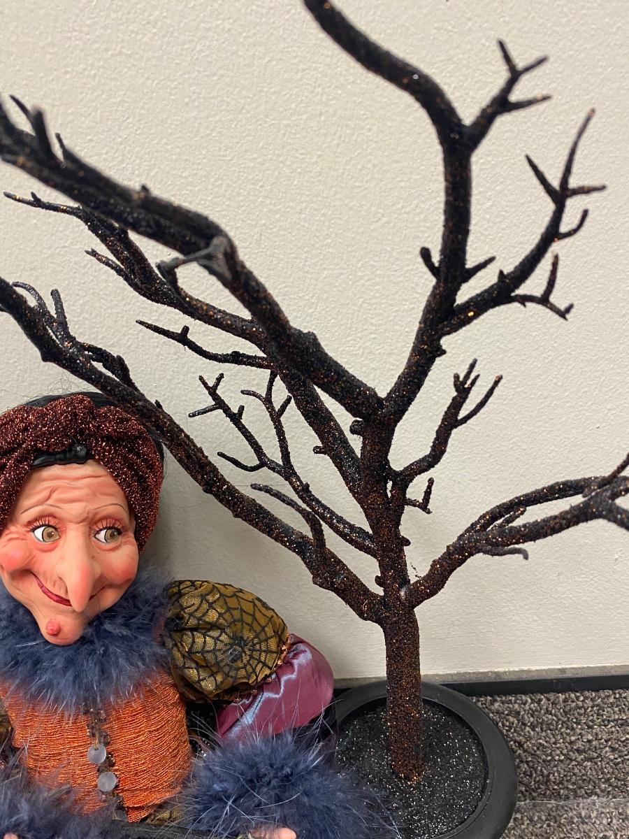 Halloween witch and tree displays. Witch is made of resin, sits on shelf or edge. Unfortunately her foot had been broken off and needs to be repaired. Tree has a glittery finish and is slightly bendable.