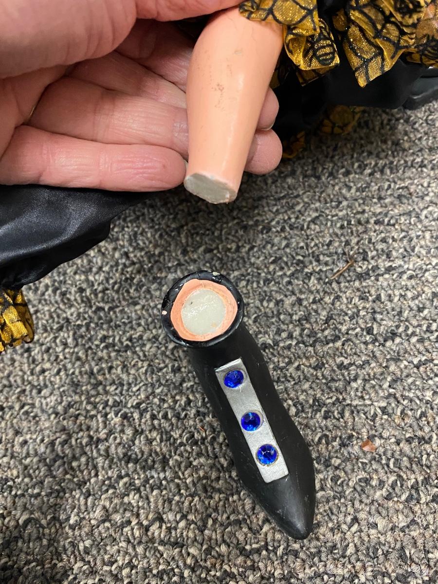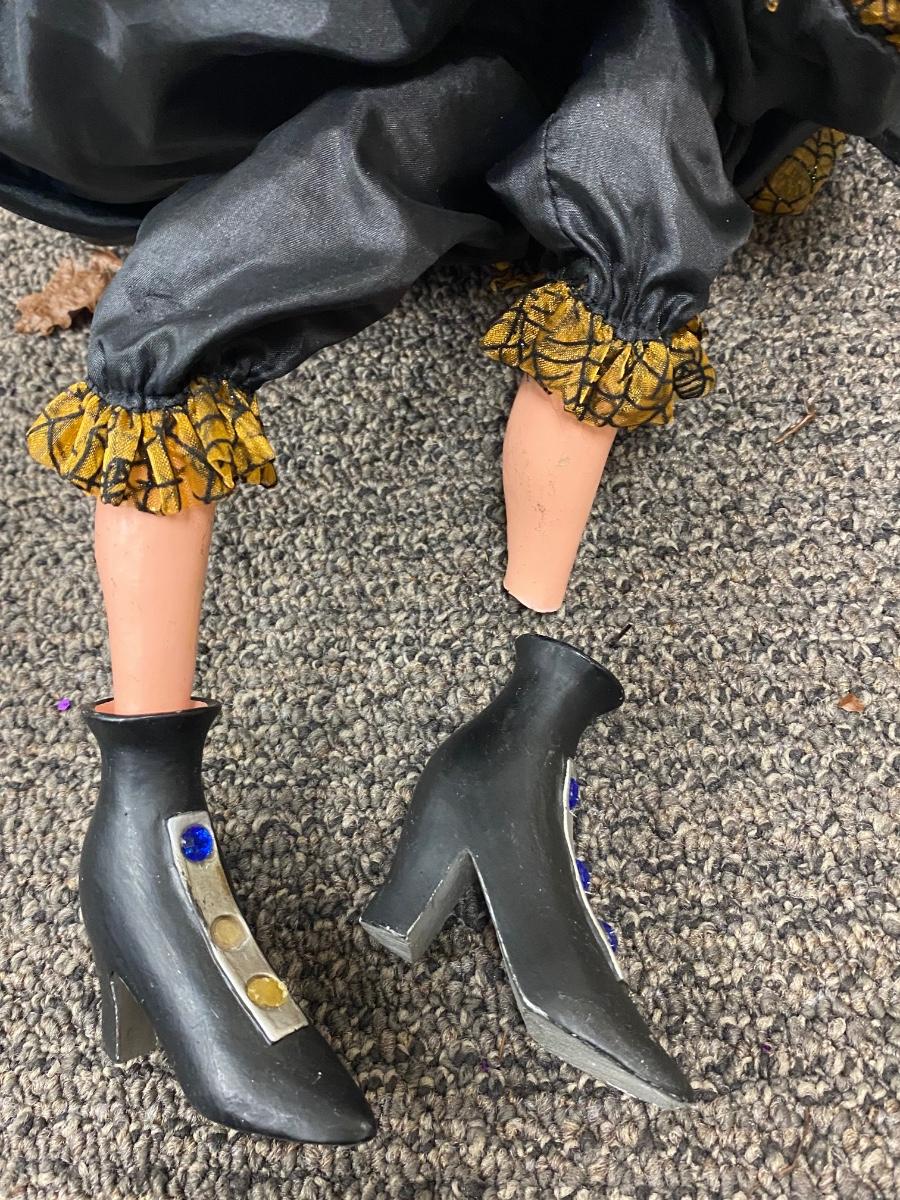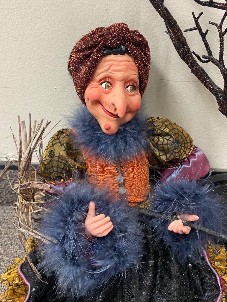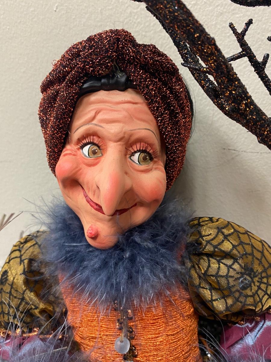 Halloween witch and tree displays. Witch is made of resin, sits on shelf or edge. Unfortunately her foot had been broken off and needs to be repaired. Tree has a glittery finish and is slightly bendable.